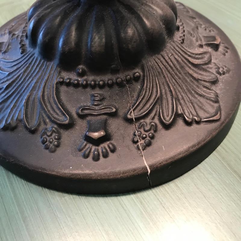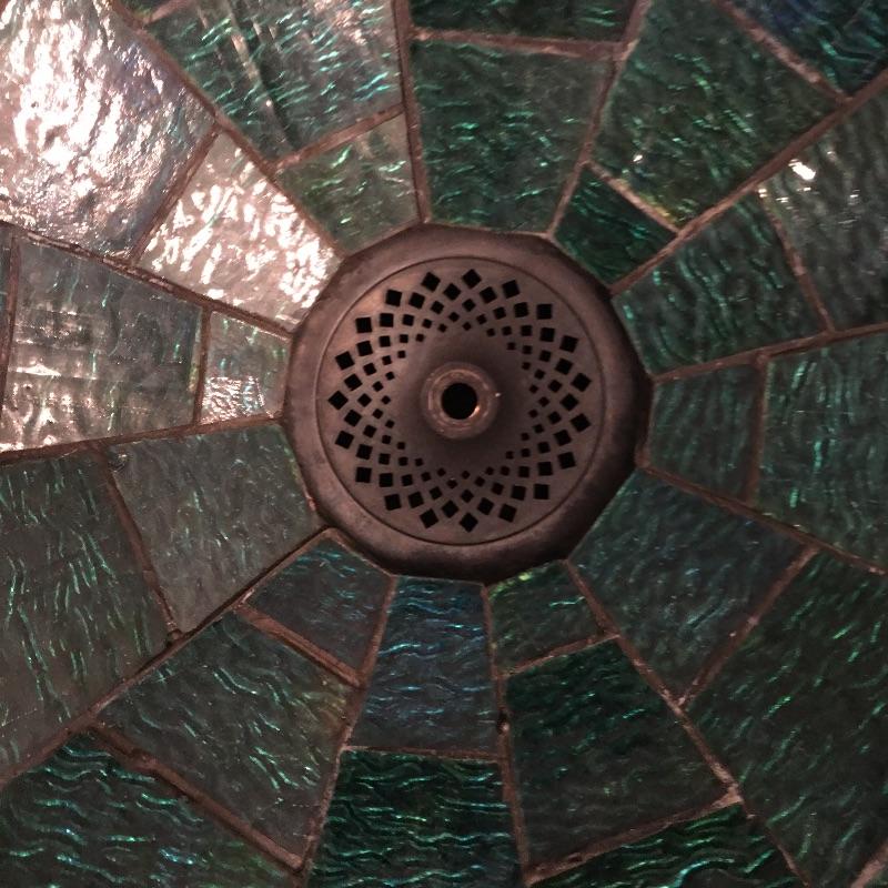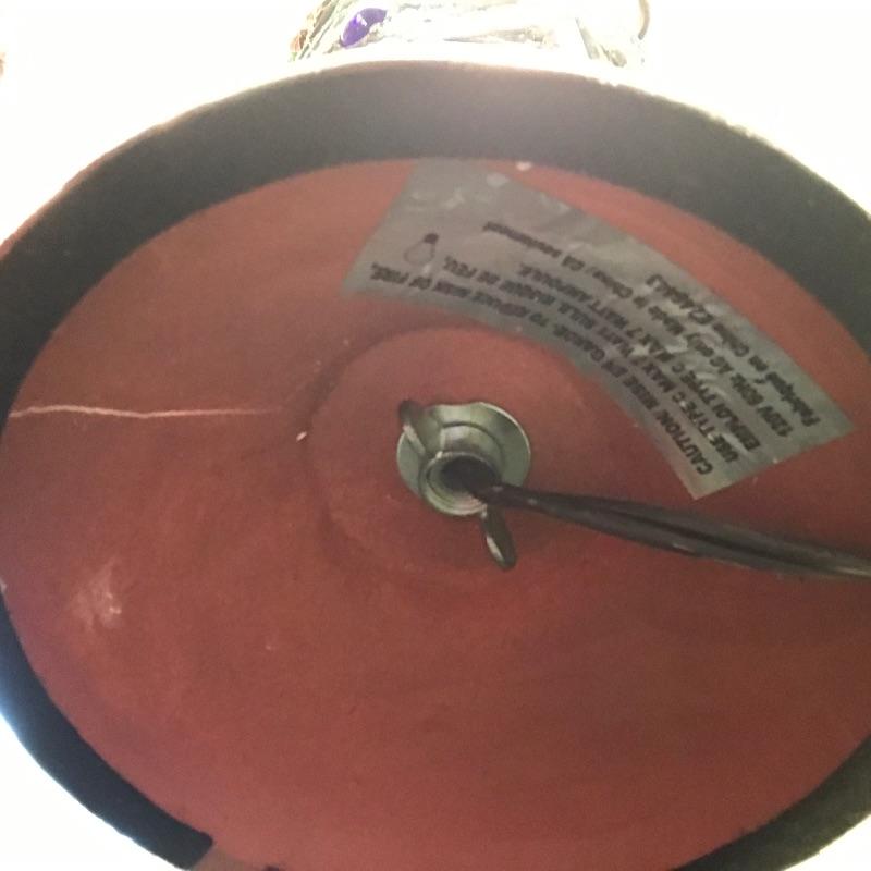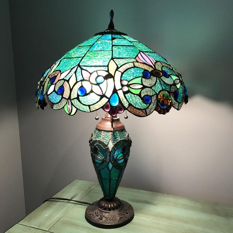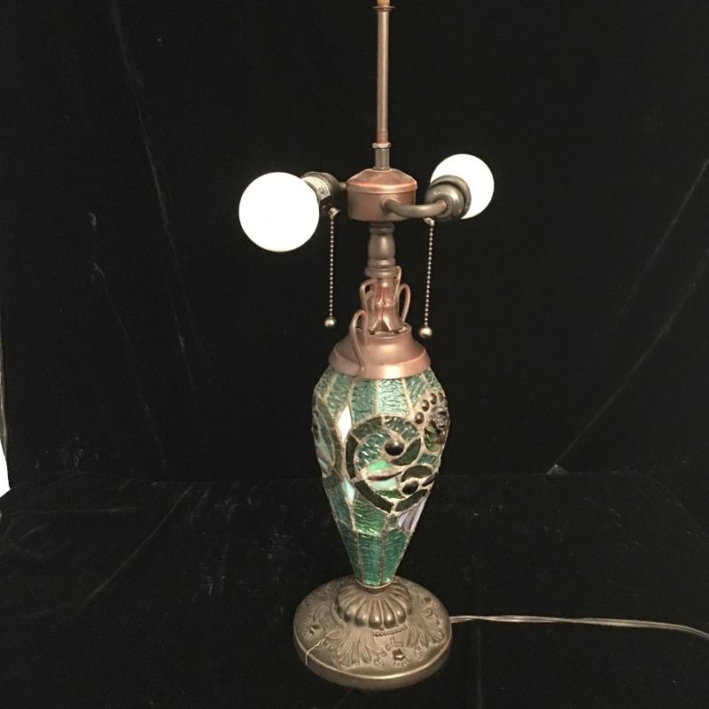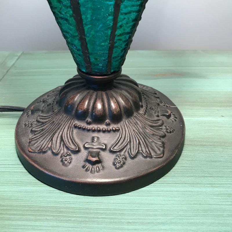This elegant Tiffany style table lamp comes in attractive green hues with pink, purple and blue embellishments. Lamp has two bulbs and the base lights up. Base has a small crack that does not affect the sturdiness of lamp. see pictures. Lamp measures 24” tall with a 18”D. Shipping available. Item is heavy.