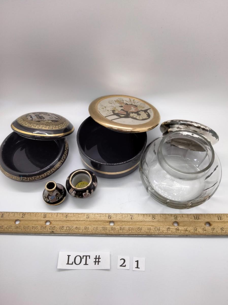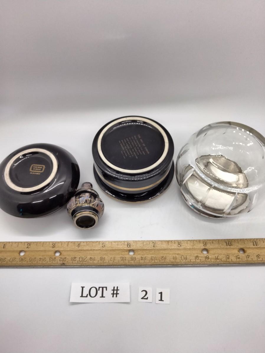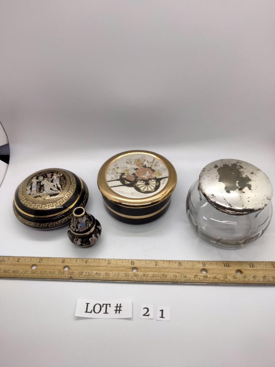 Chokin, silver-plated crystal jar, greek design ceramic dish and perfume