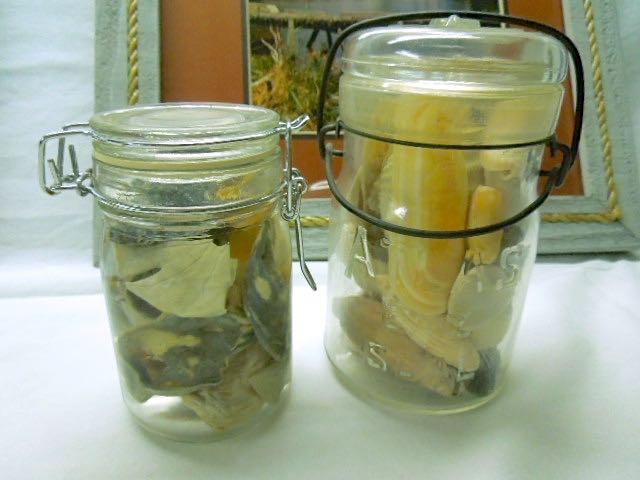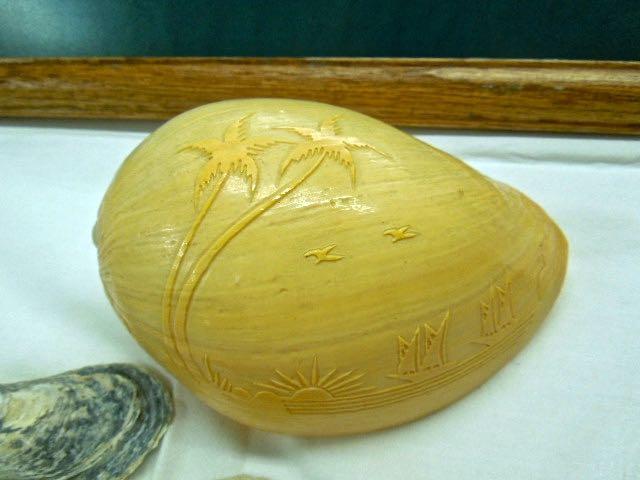 Framed photos are 16" x13" and 19" x 15". Carved shell and two latch lid jars with sea shells plus many more shells, some not pictured.