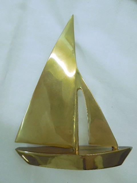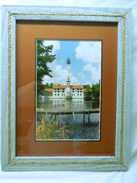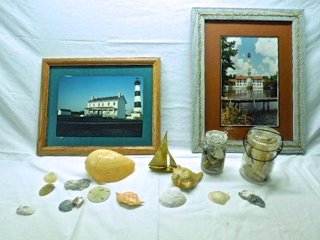 Lot 21: Two Lighthouse Framed Photographs, Brass Sailboat and Shells