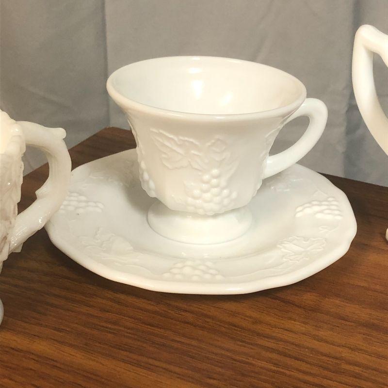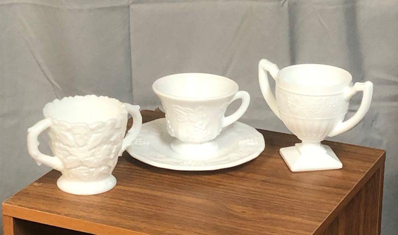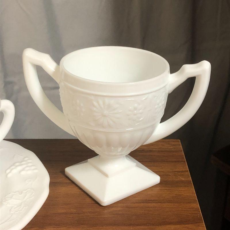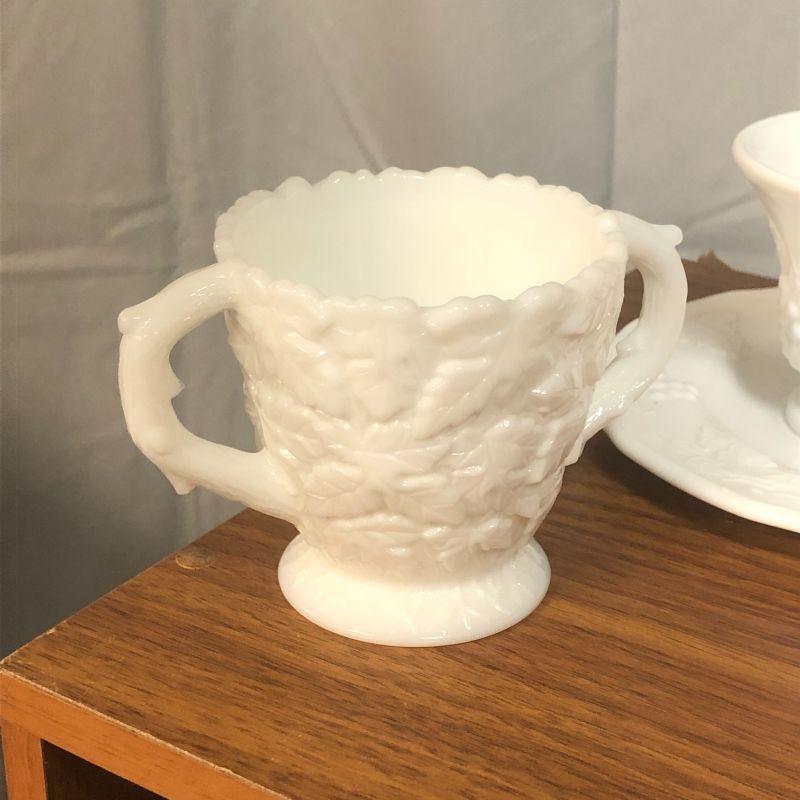 The cup and saucer are the Harvest pattern from Colony Glass (1960s era). The open sugar with daisies around the band is by Indiana Glass and the Daisy pattern (1940s-1960s). The other open sugar is by Westmoreland (not marked that I can find) in the Bramble pattern. All are in excellent condition.