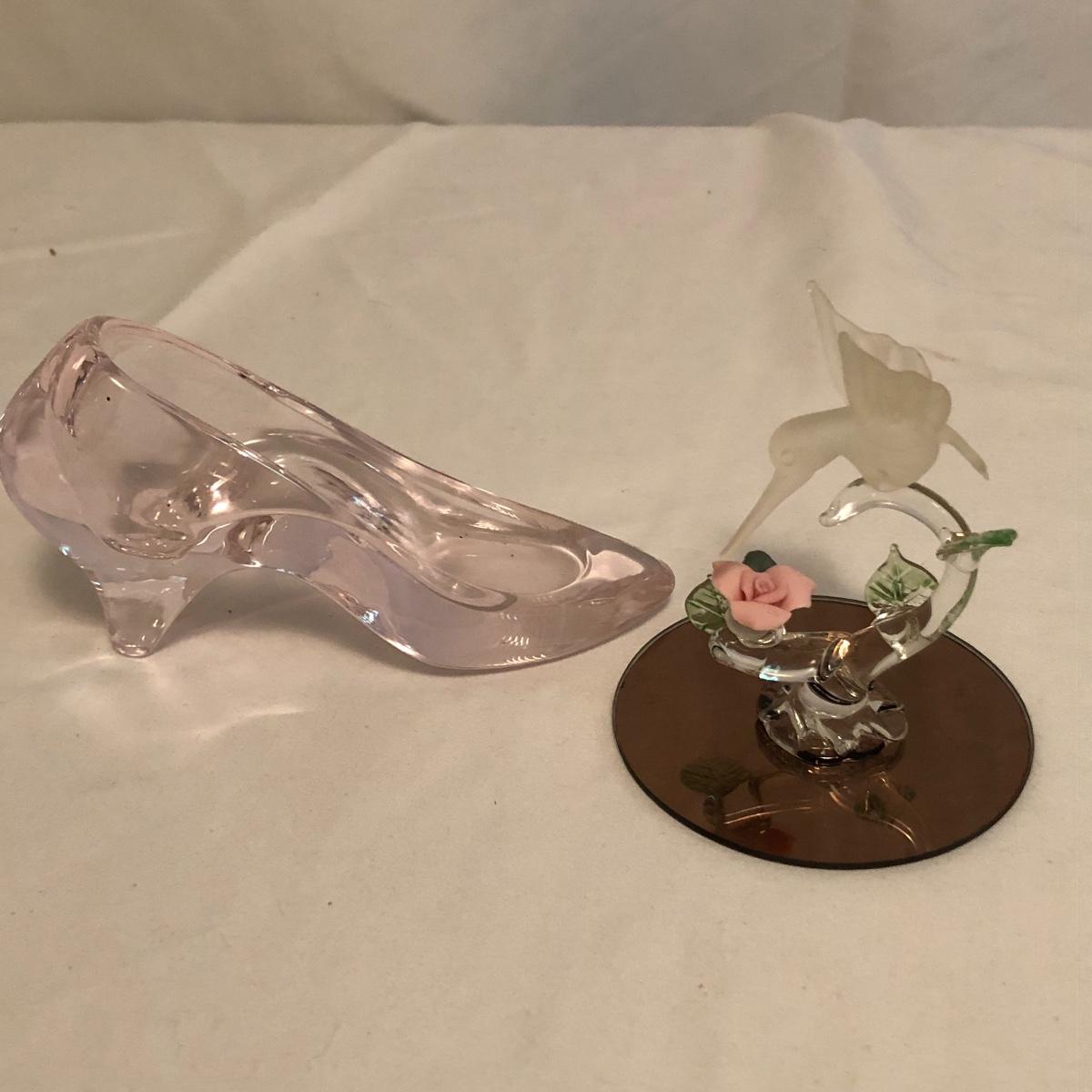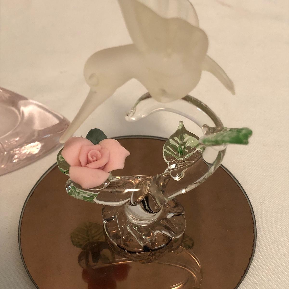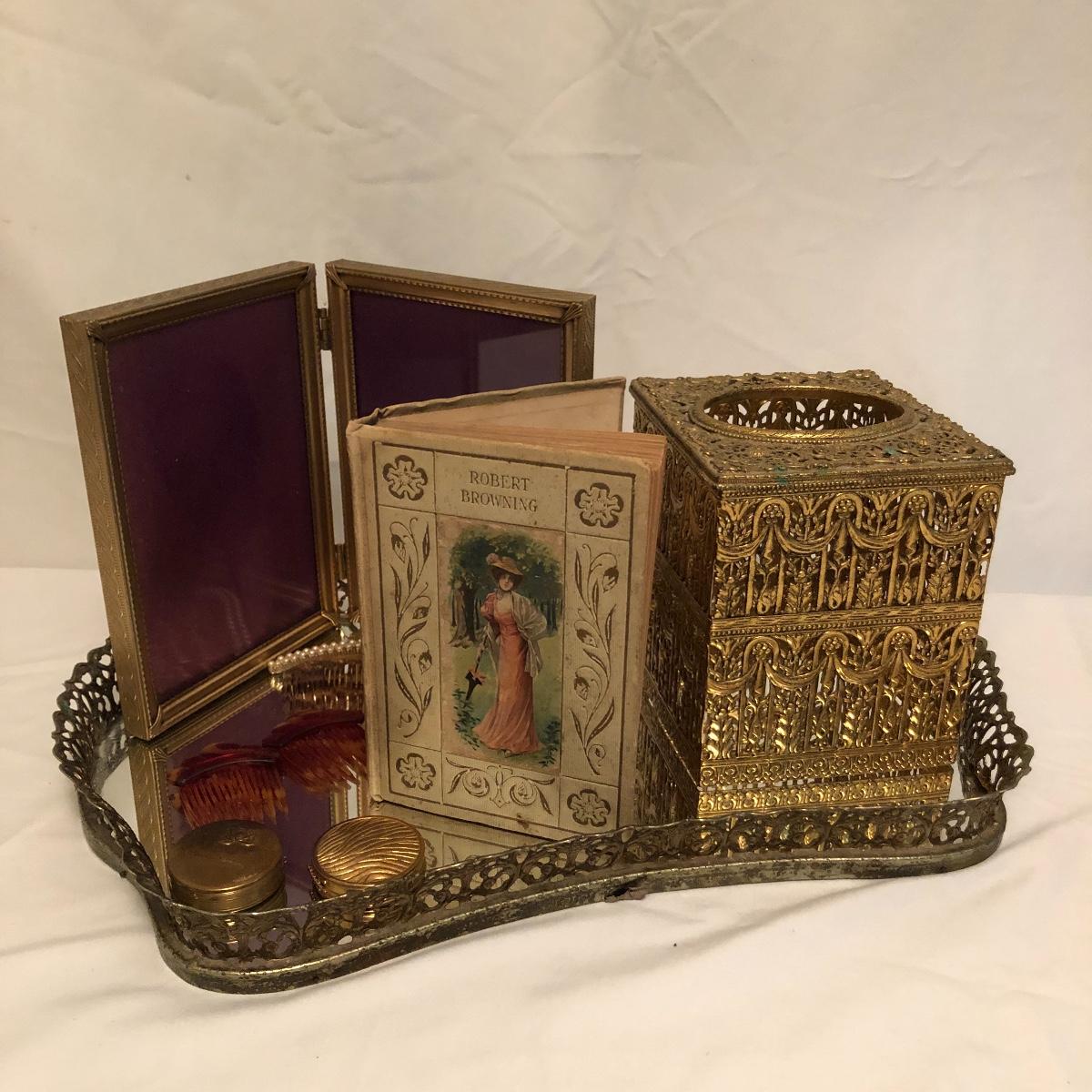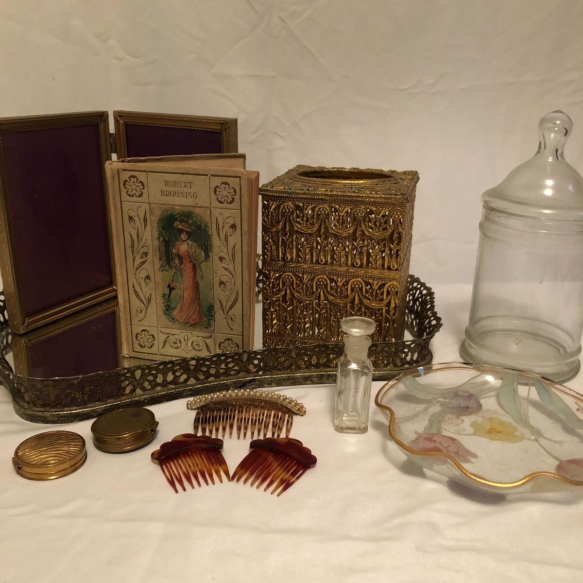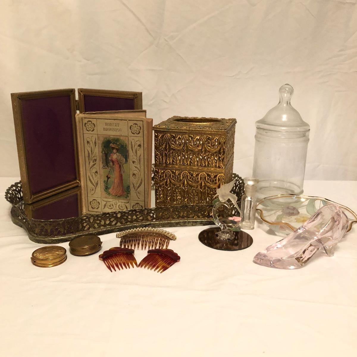 This adorable lot contains mostly vintage items; pink glass shoe and glass hummingbird statuette appear to be newer. The vanity mirrored tray has an aged bronze colored metal surround. The two blush compacts still have blush intact. Also included is a tissue box cover, hair combs (larger tortoiseshell one has Pearl like accents), book, photo frame and more. Tissue holder has a small oxidized area shown in images.