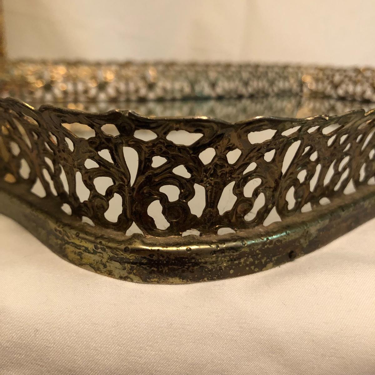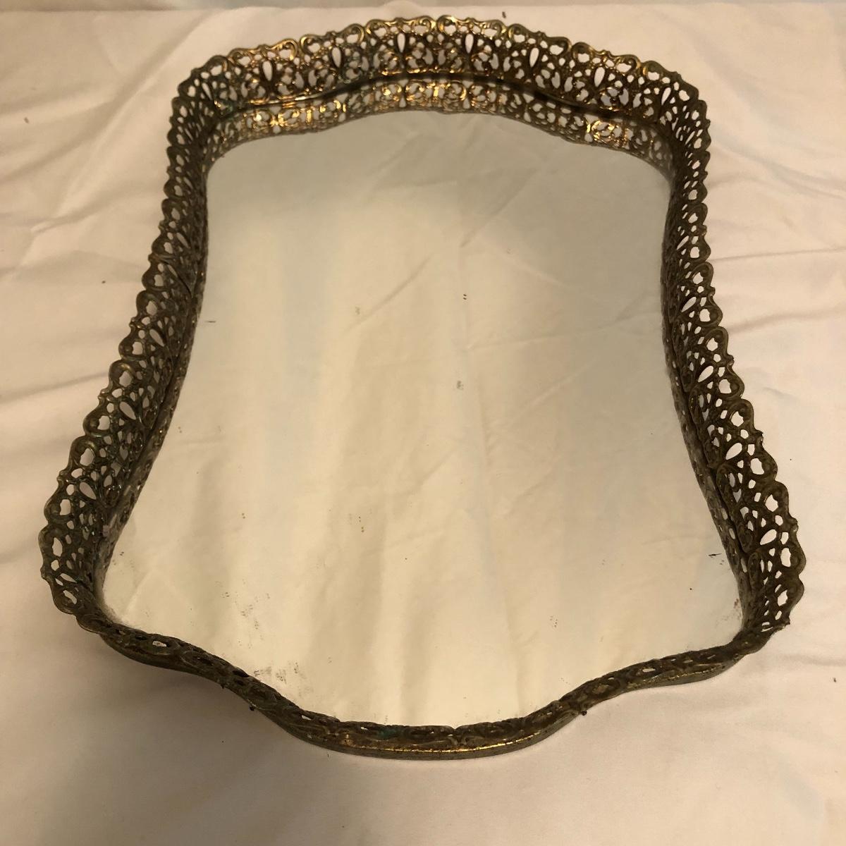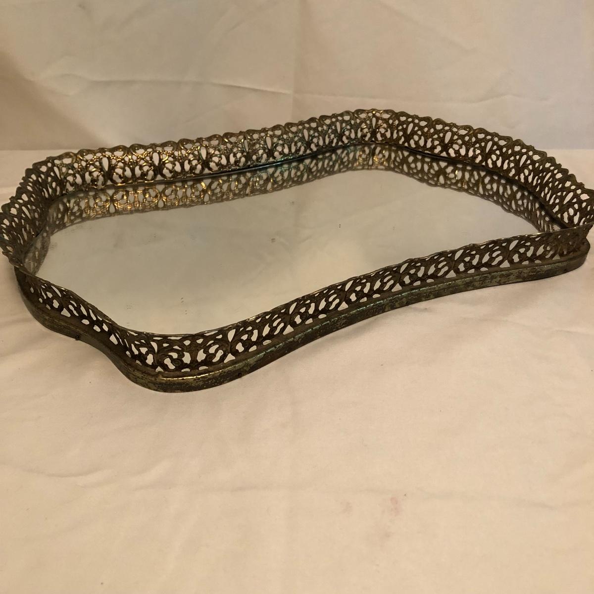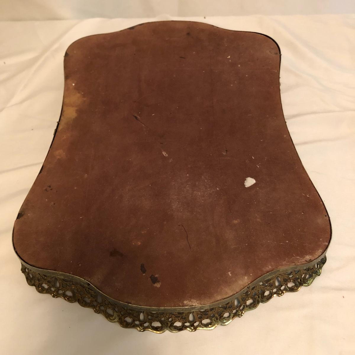 This adorable lot contains mostly vintage items; pink glass shoe and glass hummingbird statuette appear to be newer. The vanity mirrored tray has an aged bronze colored metal surround. The two blush compacts still have blush intact. Also included is a tissue box cover, hair combs (larger tortoiseshell one has Pearl like accents), book, photo frame and more. Tissue holder has a small oxidized area shown in images.