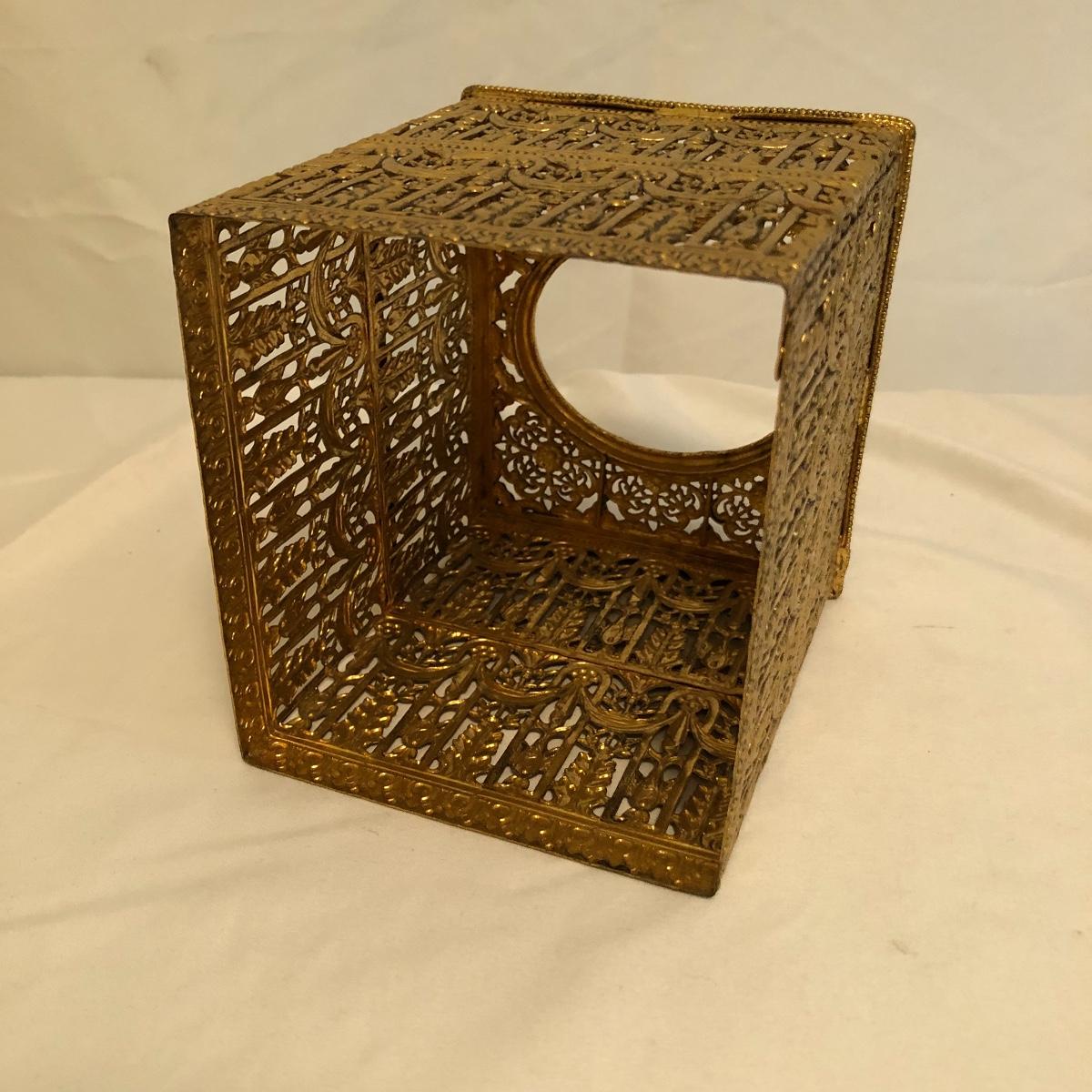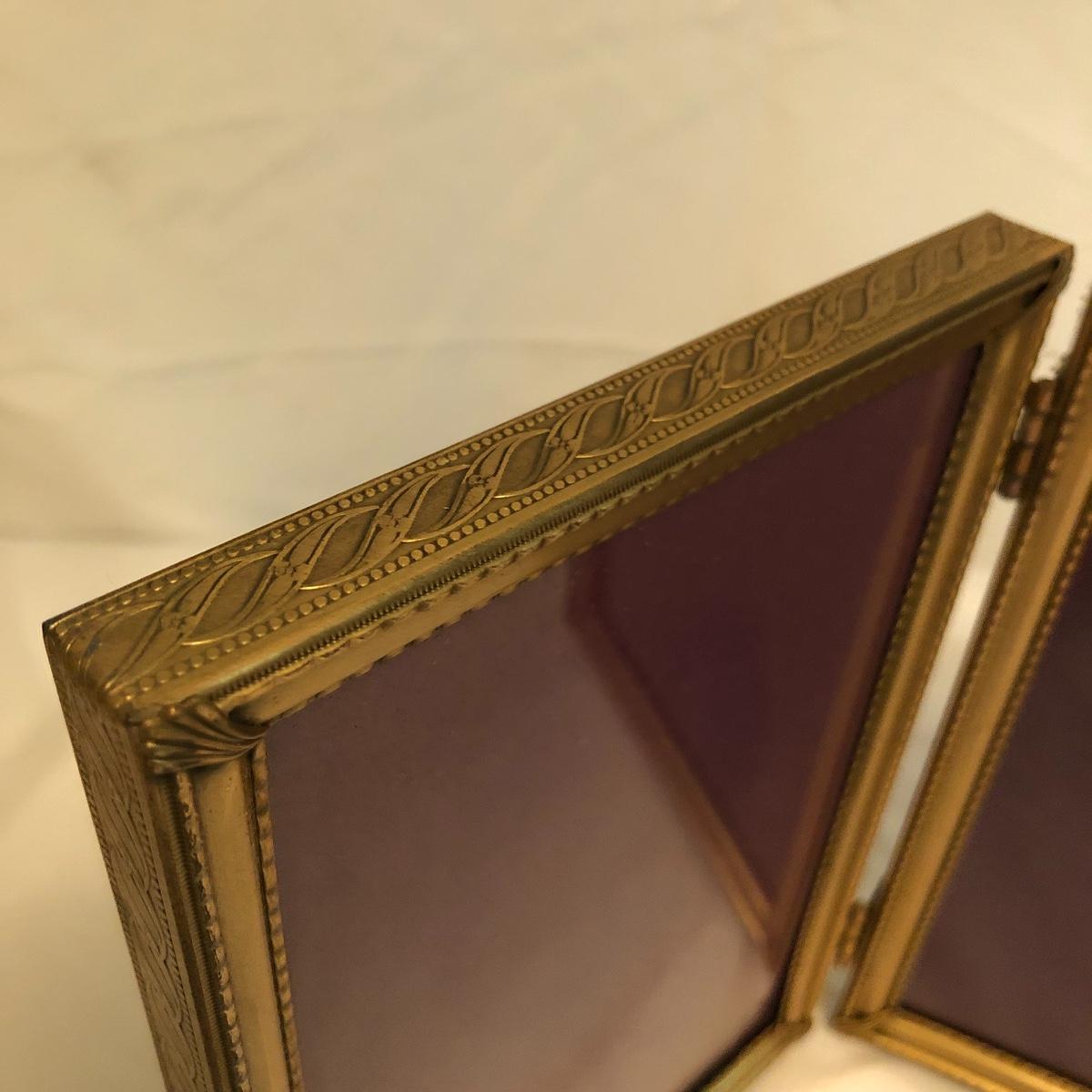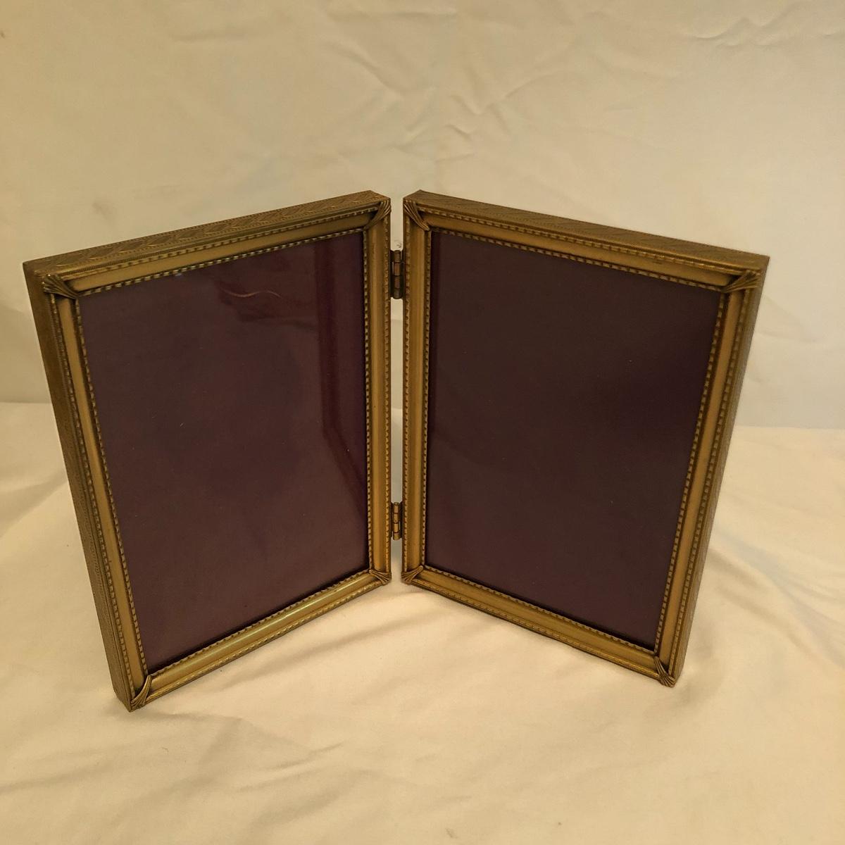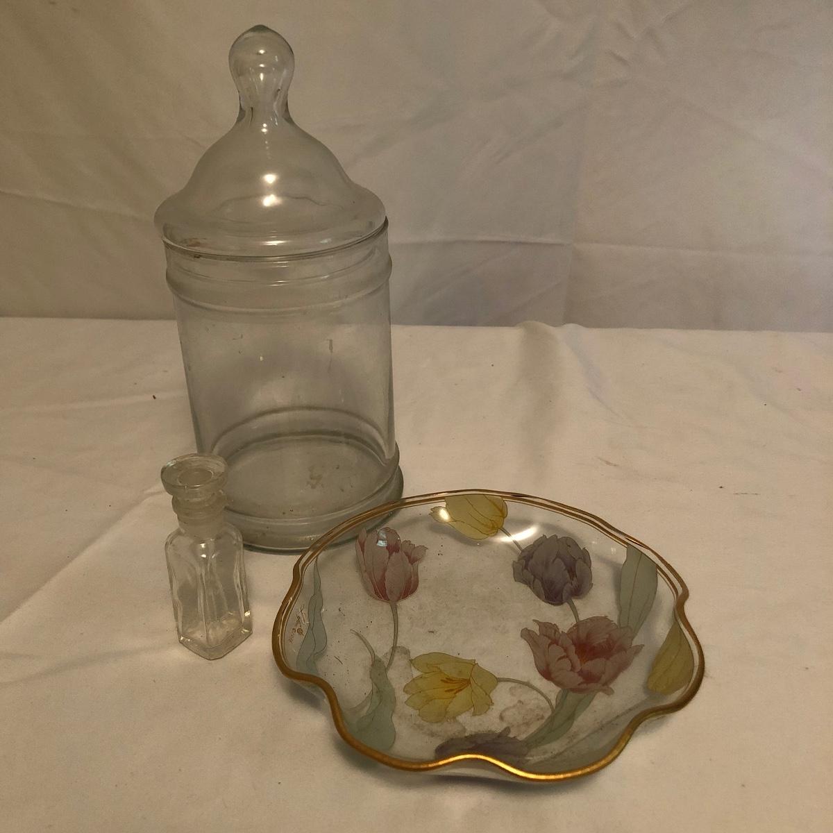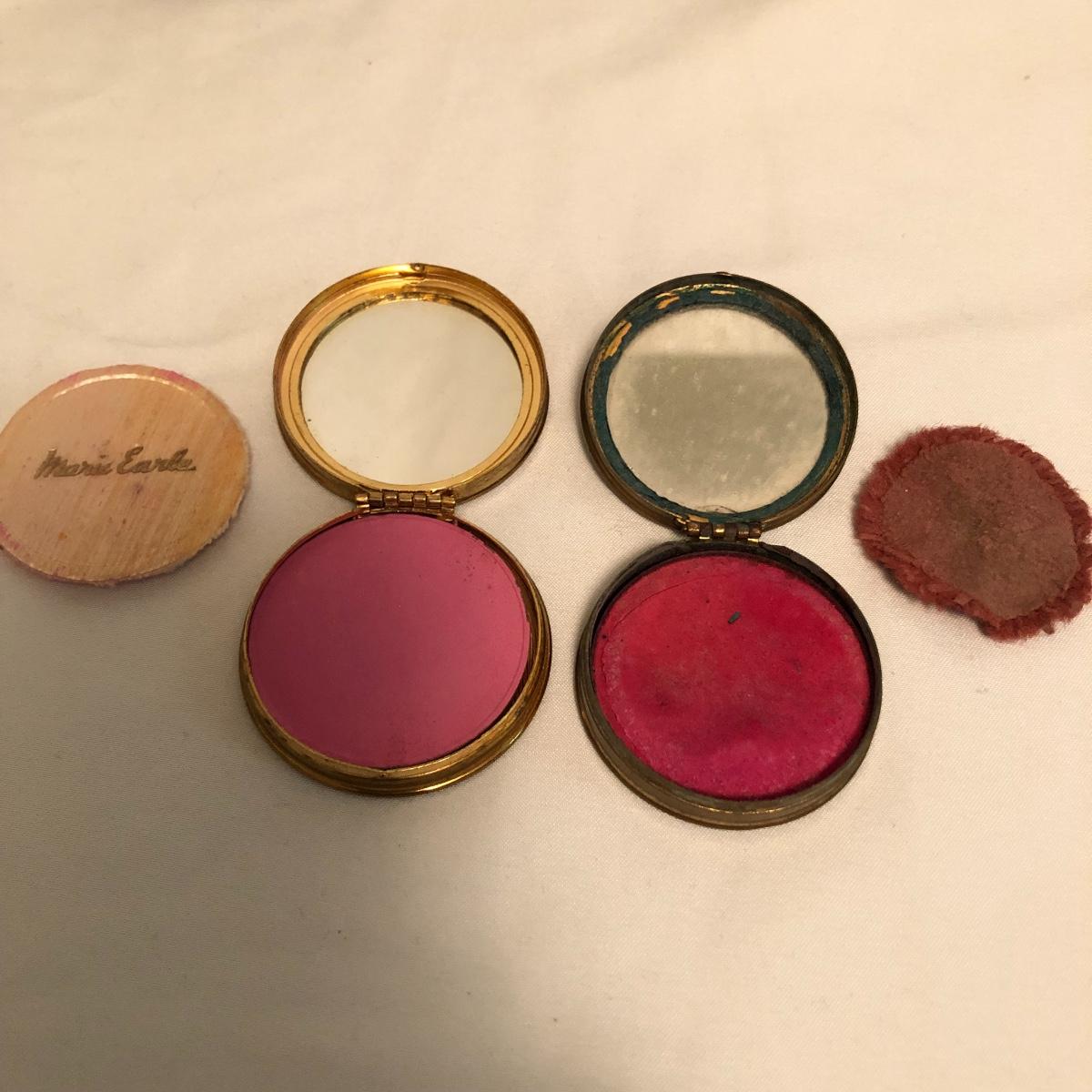 This adorable lot contains mostly vintage items; pink glass shoe and glass hummingbird statuette appear to be newer. The vanity mirrored tray has an aged bronze colored metal surround. The two blush compacts still have blush intact. Also included is a tissue box cover, hair combs (larger tortoiseshell one has Pearl like accents), book, photo frame and more. Tissue holder has a small oxidized area shown in images.