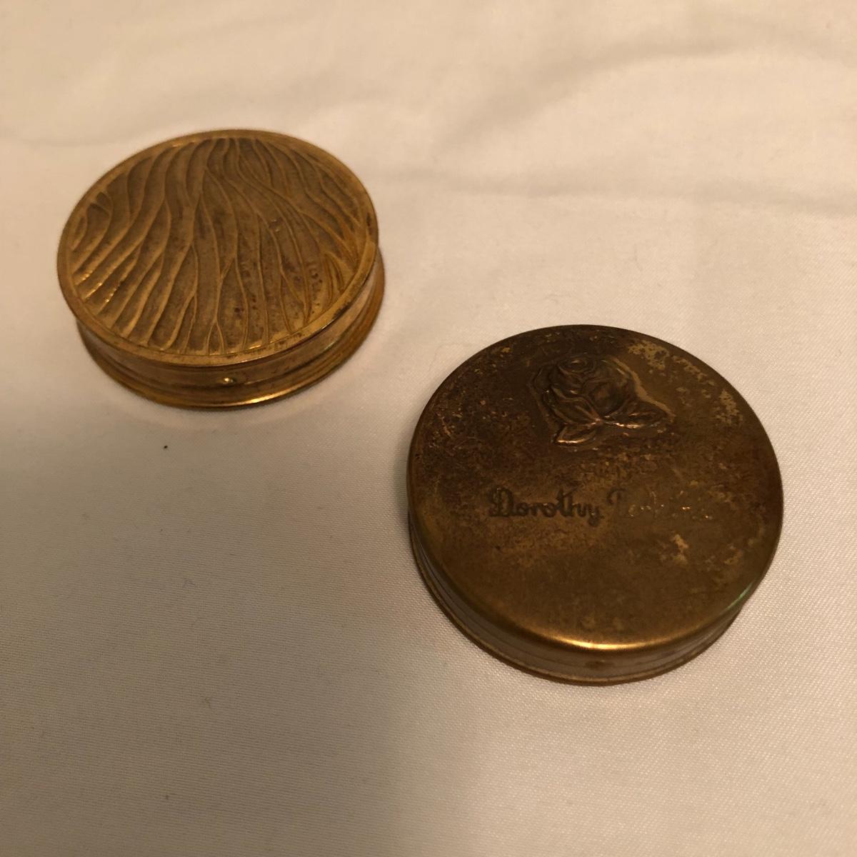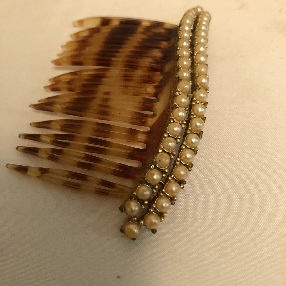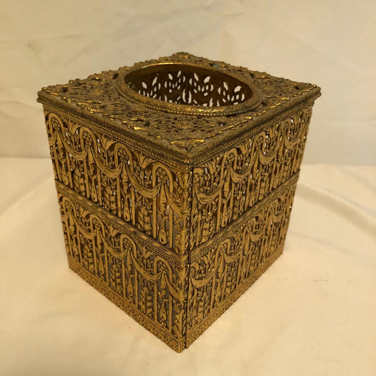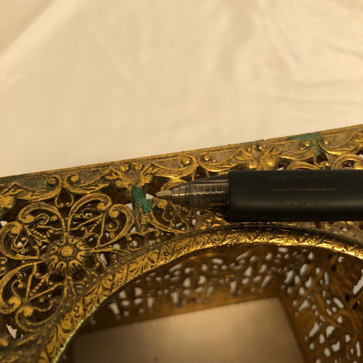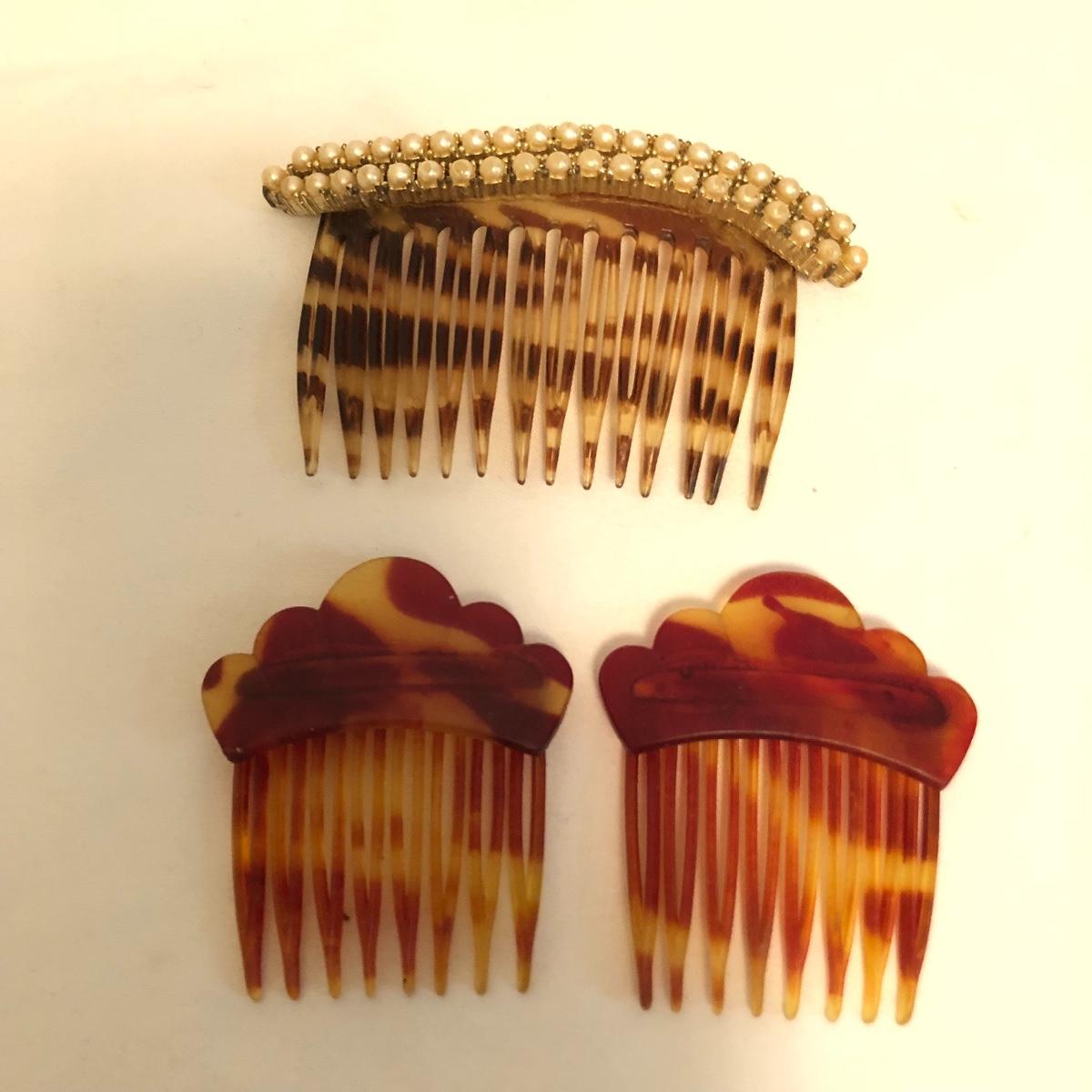 This adorable lot contains mostly vintage items; pink glass shoe and glass hummingbird statuette appear to be newer. The vanity mirrored tray has an aged bronze colored metal surround. The two blush compacts still have blush intact. Also included is a tissue box cover, hair combs (larger tortoiseshell one has Pearl like accents), book, photo frame and more. Tissue holder has a small oxidized area shown in images.
