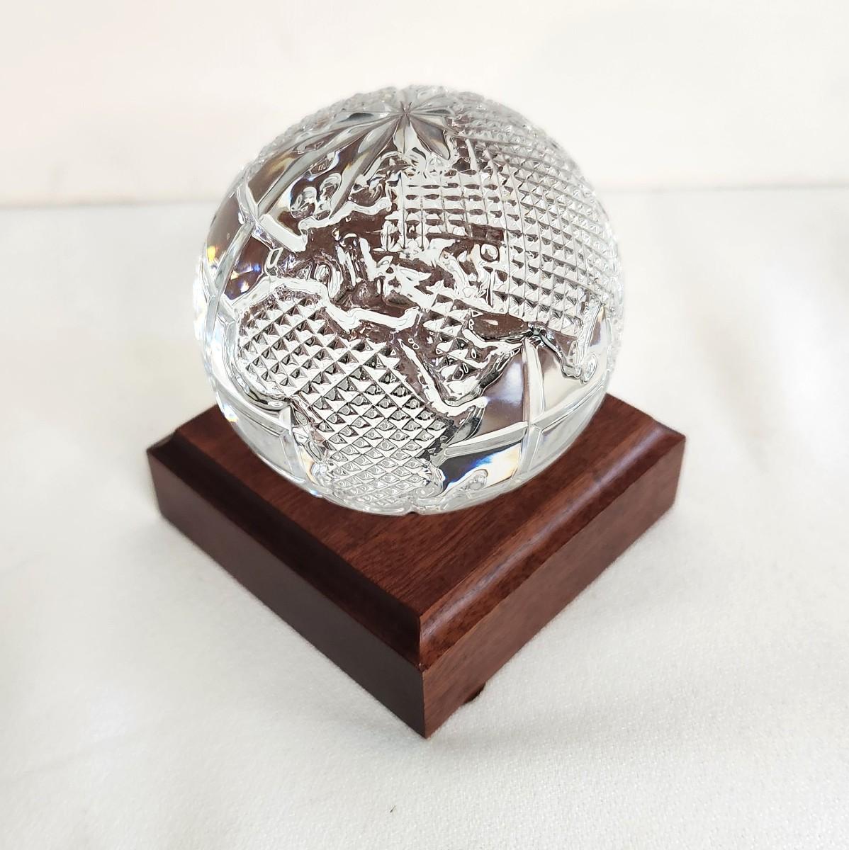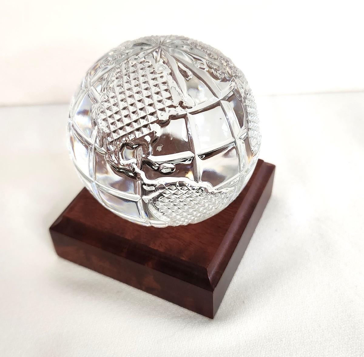 Waterford Crystal (marked) Globe Paperweight on wooden stand. 3" tall. This is a retired piece. Excellent condition. A handsome piece.