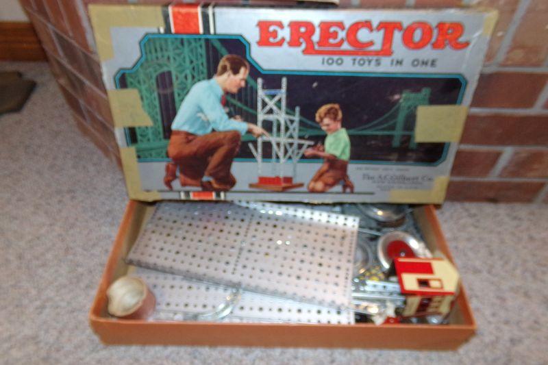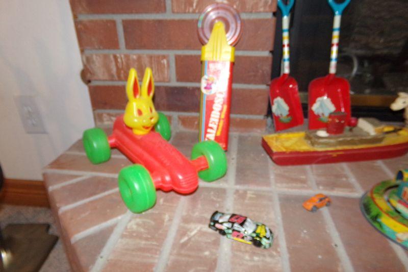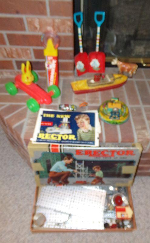 ERECTOR SET, METAL SHOVELS, METAL WIND UP TOY (DOESN'T WORK PROPERLY), PLASTIC RABBIT IN RACE CAR AND MORE
