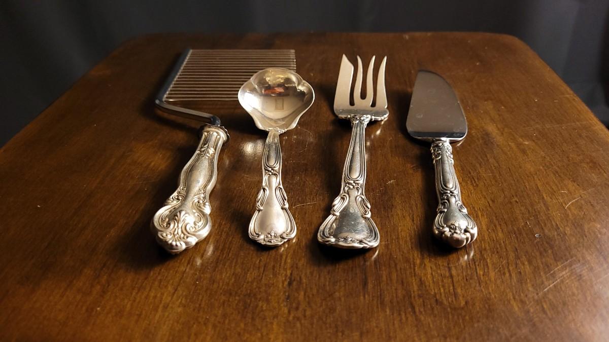 This lot features (4) Vintage GORHAM Sterling Silver Flatware Accessories. From a ladle spoon to bread slicer, this bundle is in nice condition. The blade on the pie server and Tongs on bread slicer are of course Stainless Steel and not Sterling like the handles.