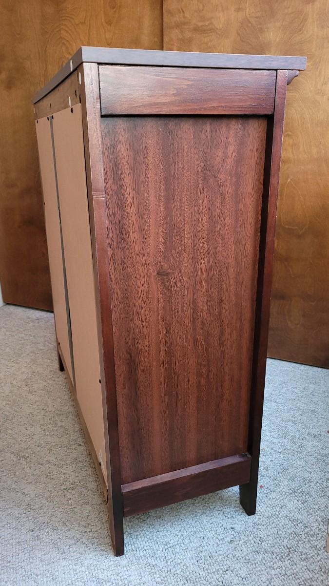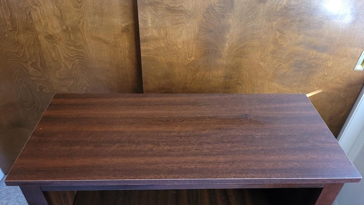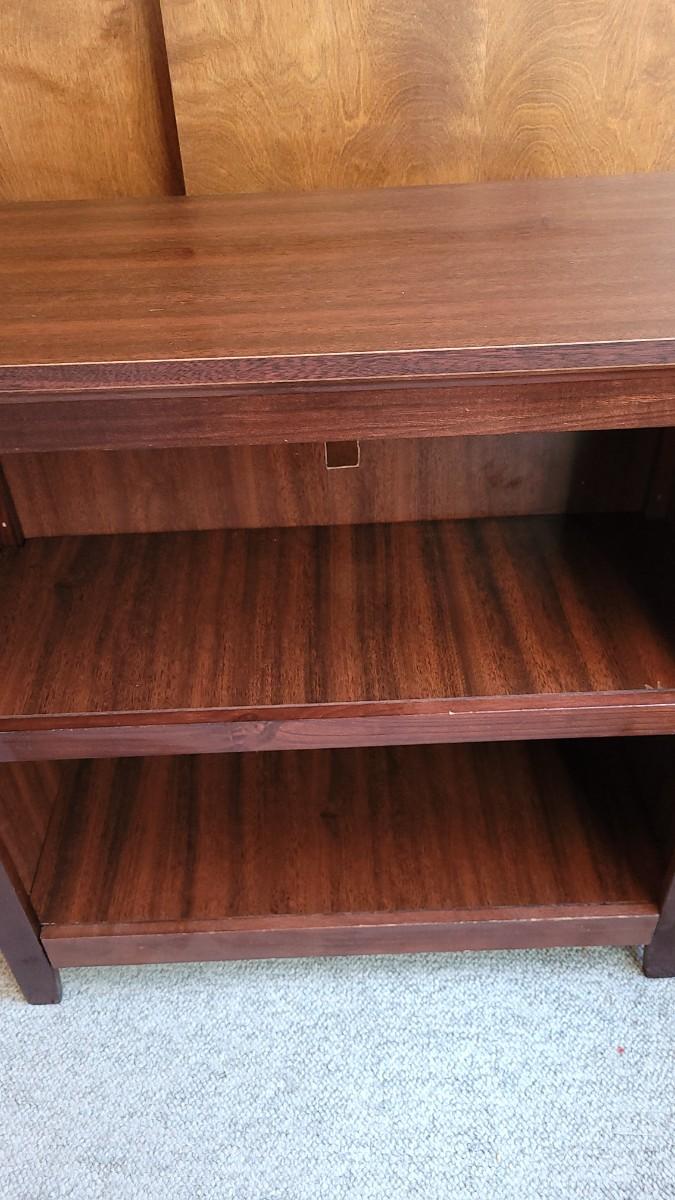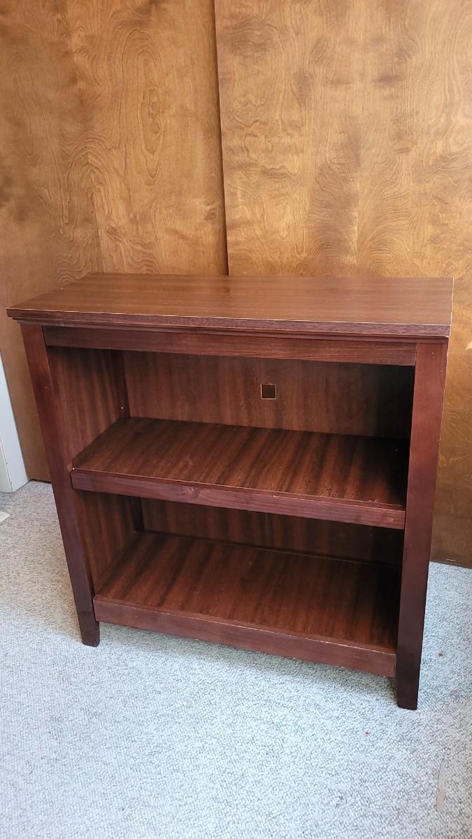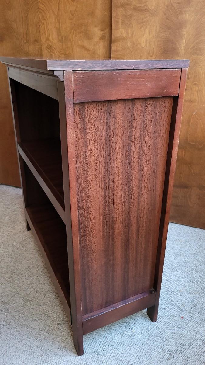 This lot features a Vintage Bookcase with 2 levels. This particle board shelf has many years of life left. 34.5" x 32.25" x 13.5". A nice example with no obvious major issues.