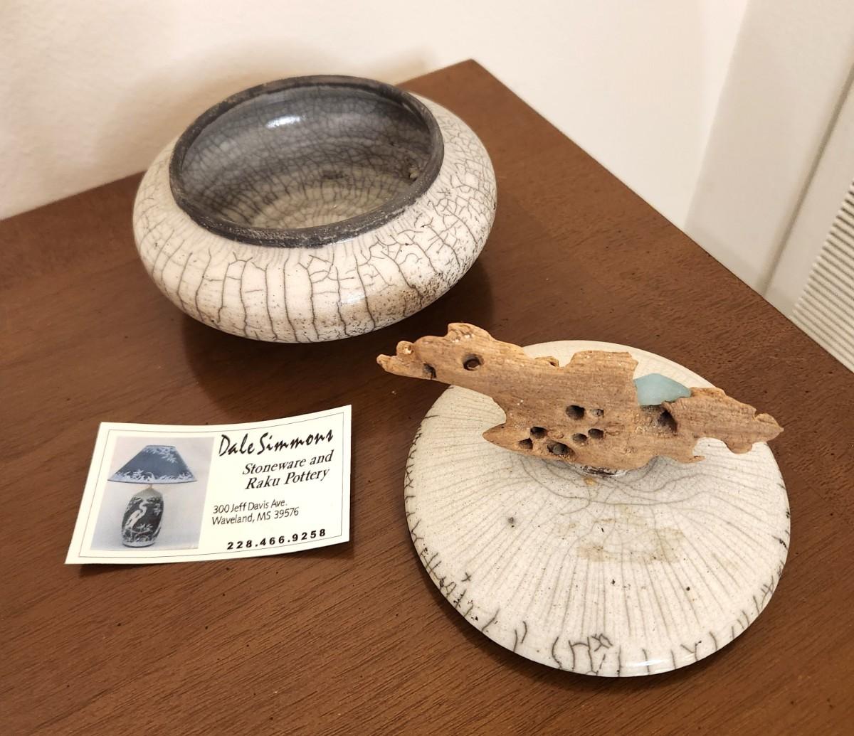 Great piece of studio pottery from Dale Simmons (signed) - of Waveland, Mississippi. Known from his stoneware and Raku pottery. This interesting piece of 6" across and in great condition.
