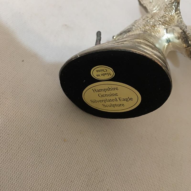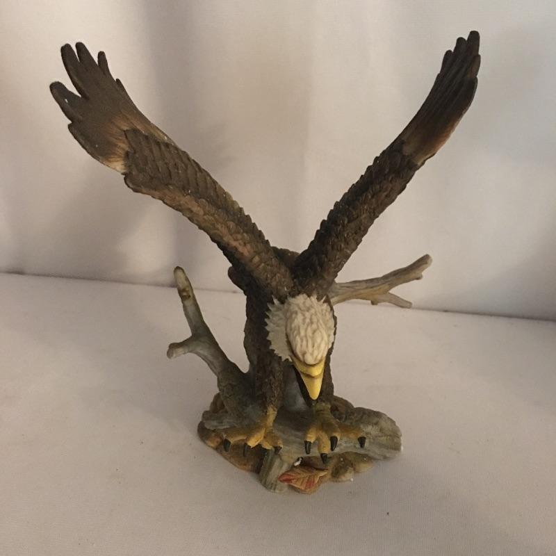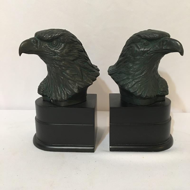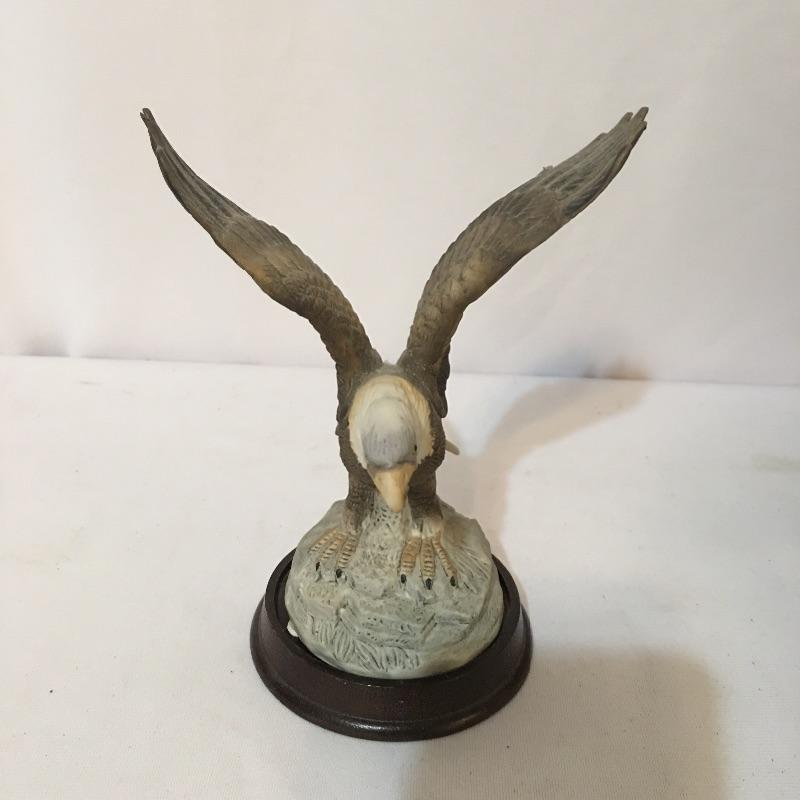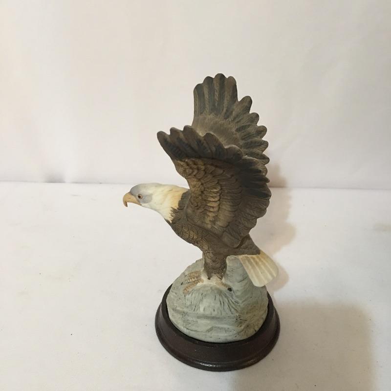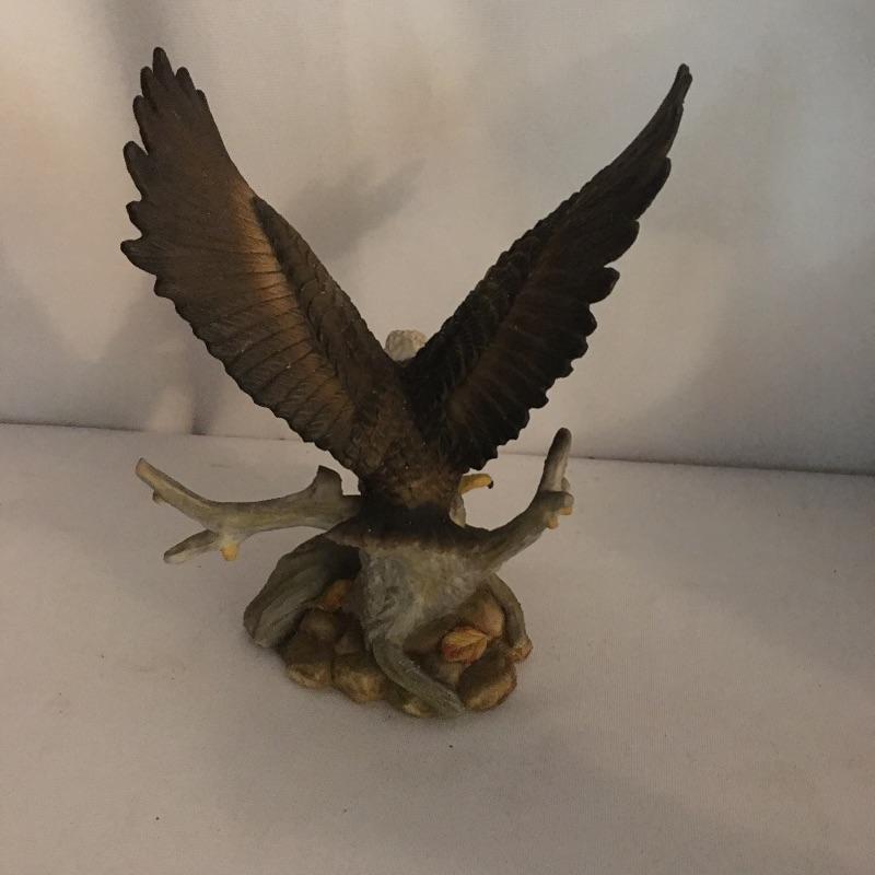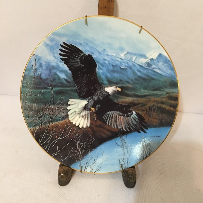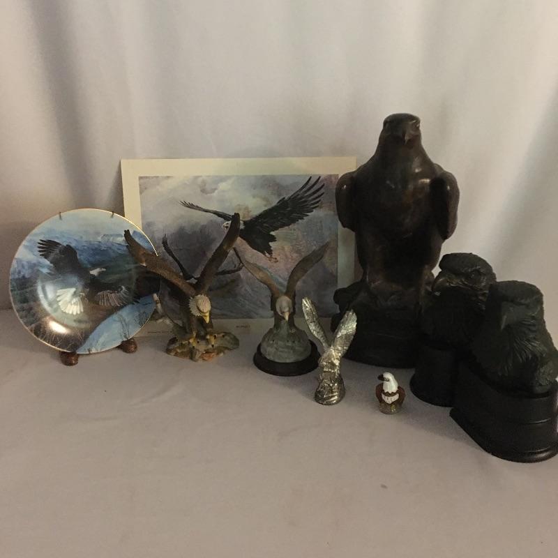 Soar like an eagle with this majestic lot. Collection includes pair heavy bronze colored eagle bookends and statue, mini eagle figurine, eagle print, Royal Carlton figurine, Hampshire Silverplate eagle, American eagle figurine and a numbered collectible plate titled Soaring Majesty with COA. Largest eagle measures 8” x 10” x 14.5”.