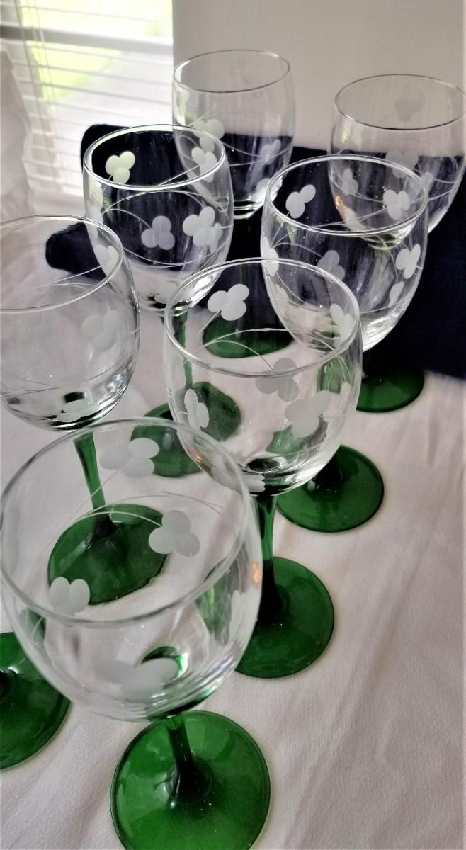 So pretty! You get all you see here - two sets of Irish hand cut crystal - green base with clover design. 4 7" tall glasses, and 8 8" tall glasses. Nice condition.