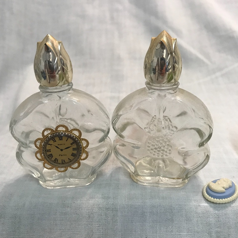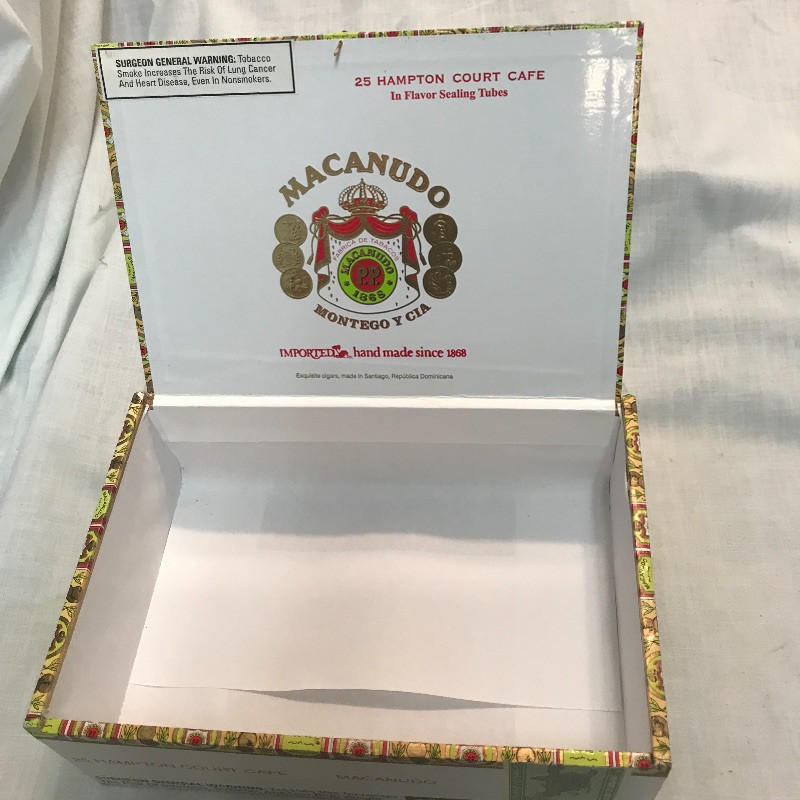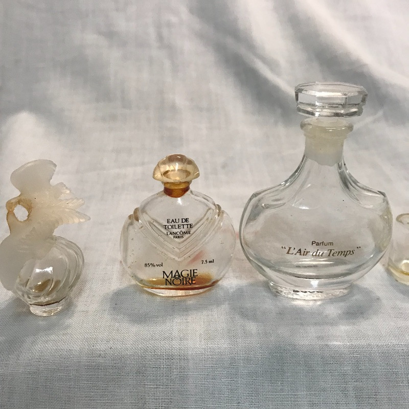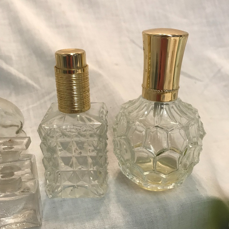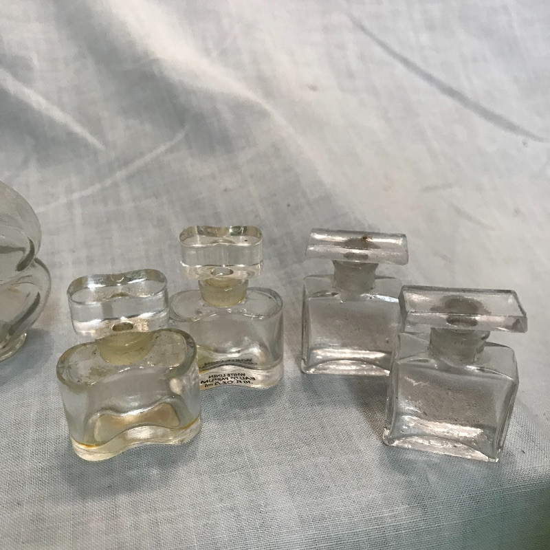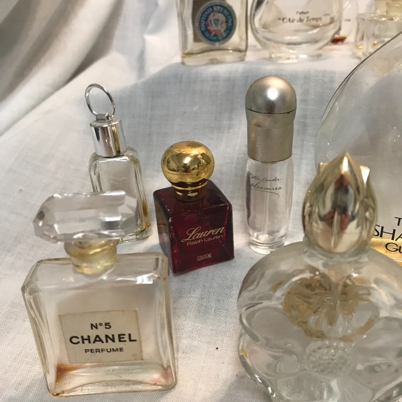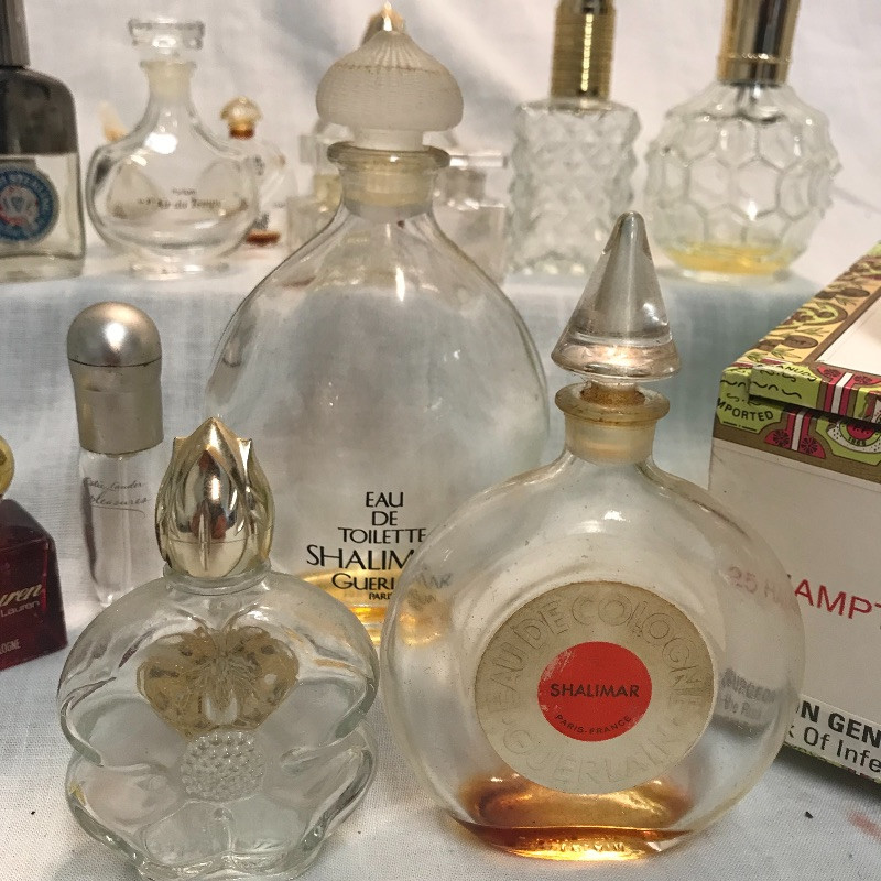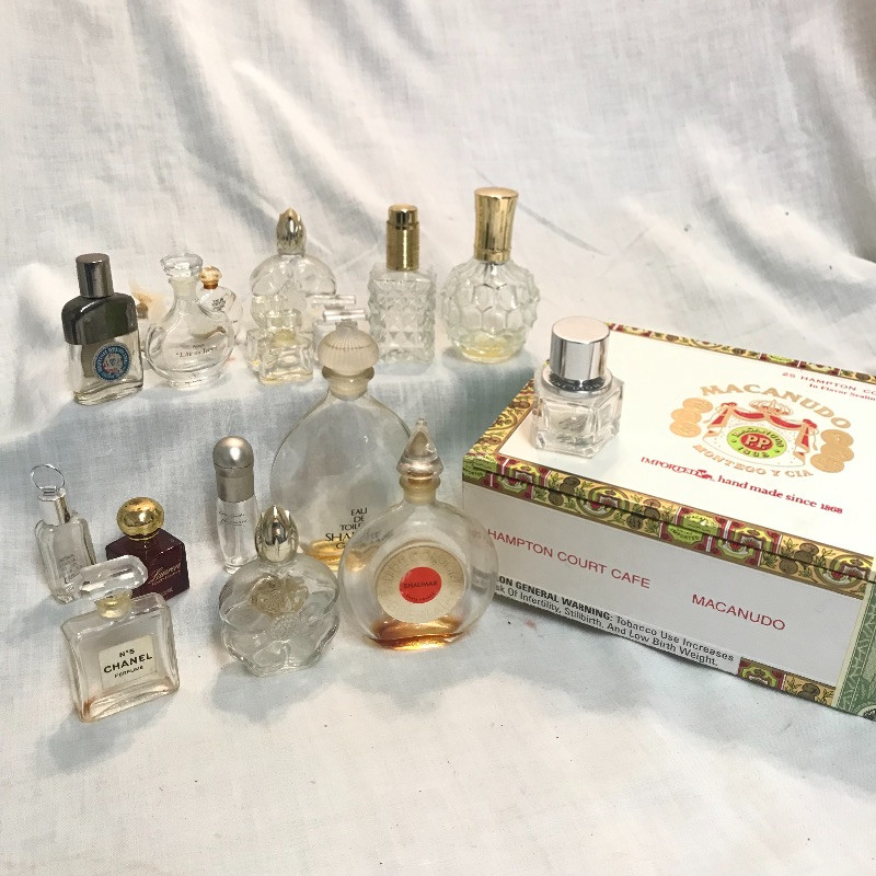 Collection of various empty perfume bottles sized petite to tiny! Chanel No. 5, Shalimar Guerlain and British Sterling are just a few names you’ll find. These vintage finds will fit nicely in a like new Macanudo Cigar Box. See images.