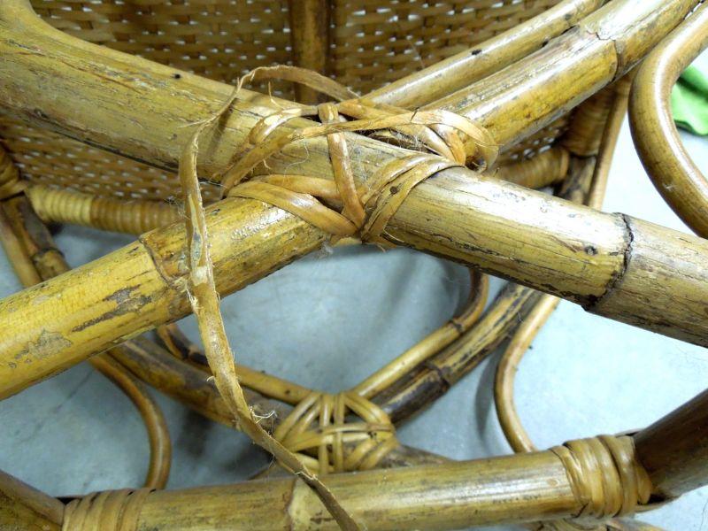 Nicely woven mid century bamboo frame wicker patio chair with a caned seat ashanti style foot stool. Chair measures 33" W x 46" H x 30" D and stool is 32" W x 27" H. Caning is unraveling on base and legs of chair, but it is still very sturdy. The stool is in excellent condition.