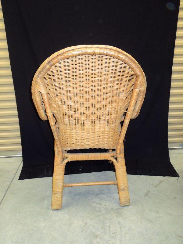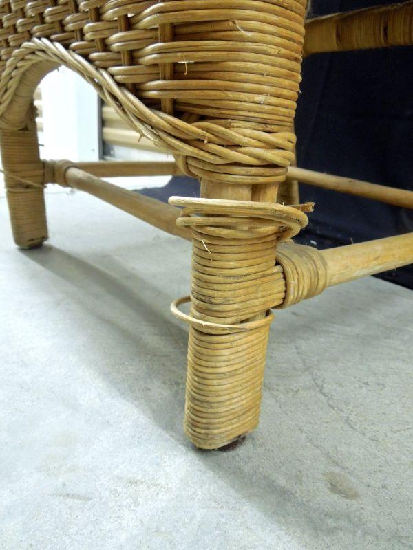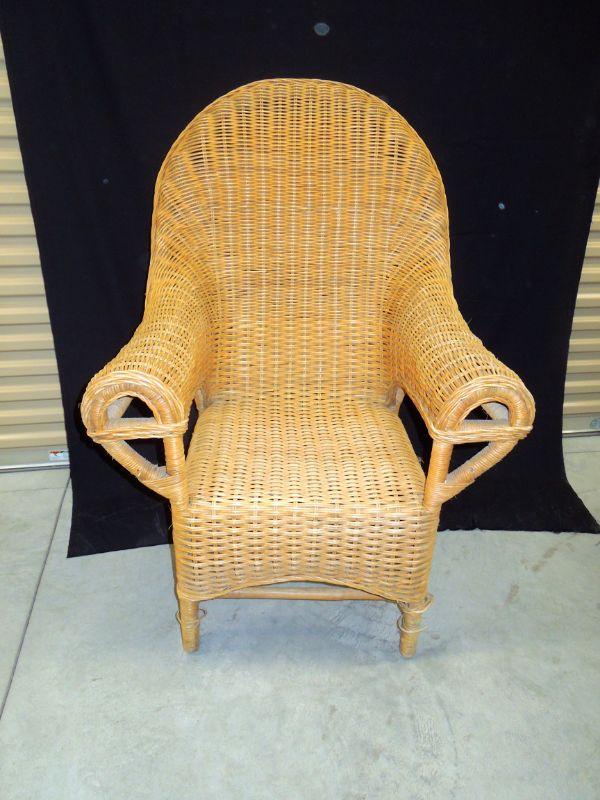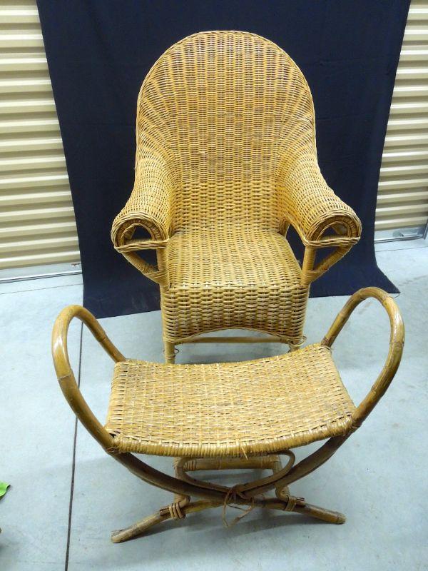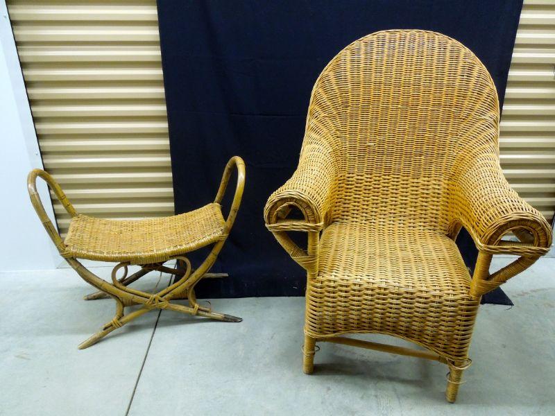 Lot 210: Mid Century Wicker Patio Chair and Cane Foot Stool