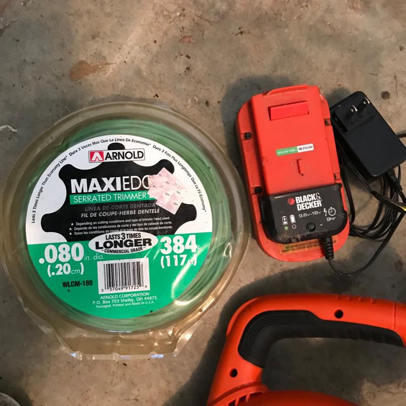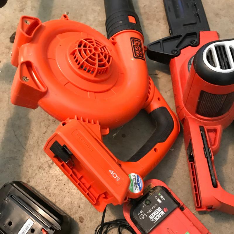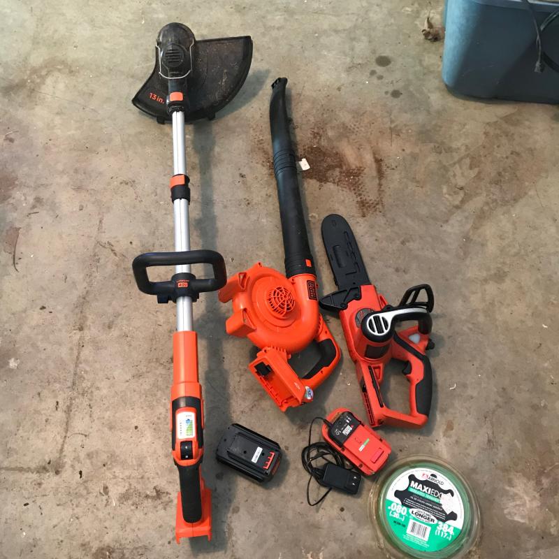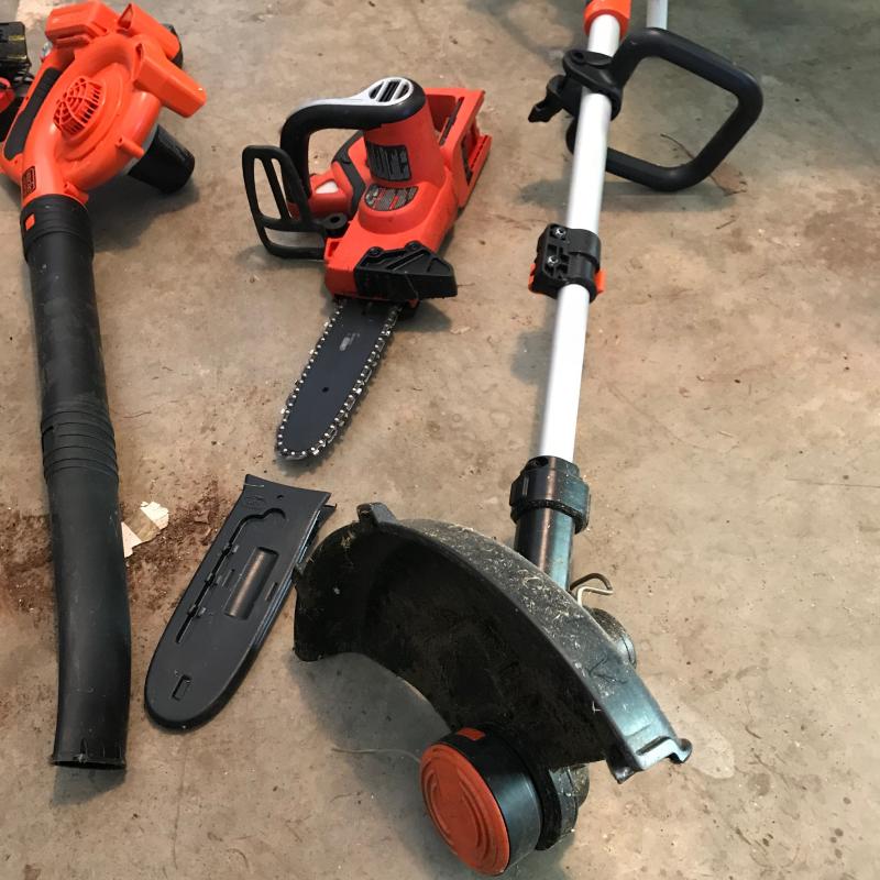 Rechargeable Black + Decker blower, chain saw, and 13” trimmer. Includes trimmer line. Missing battery charger. No shipping. Local pickup only.