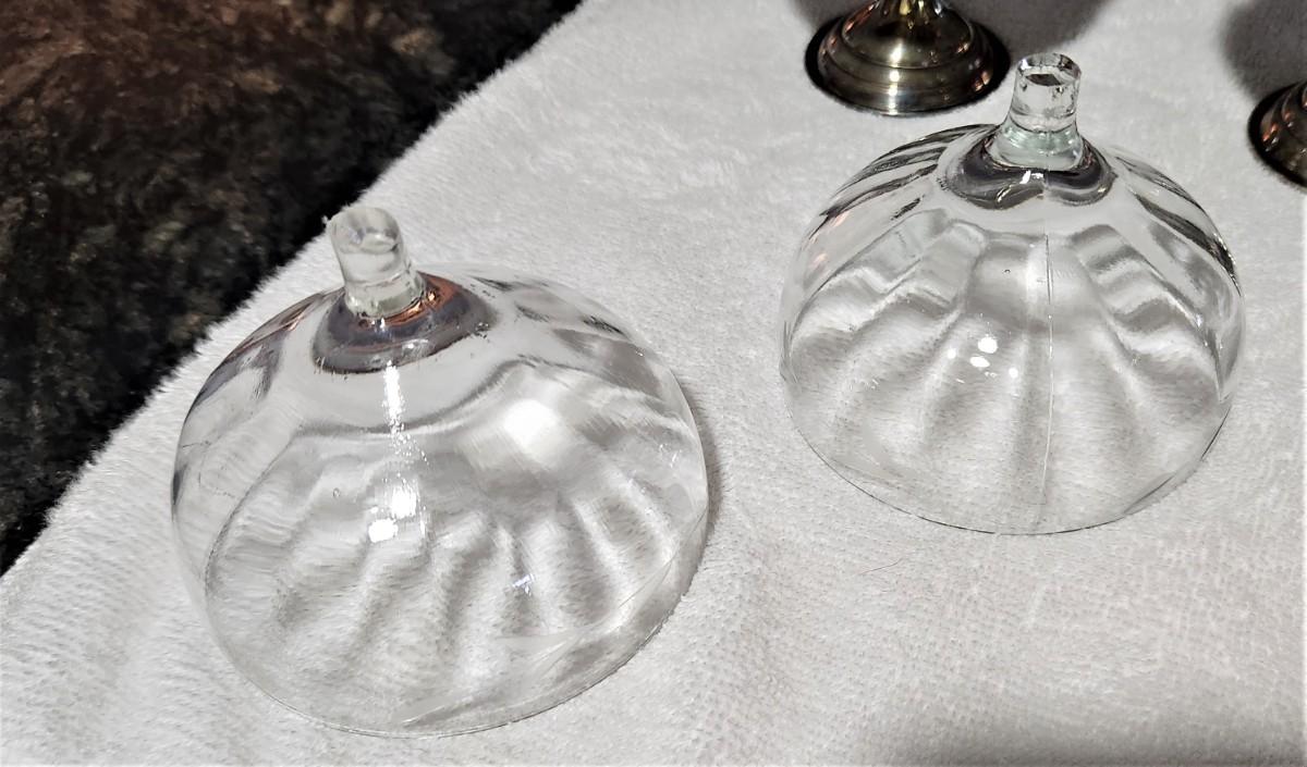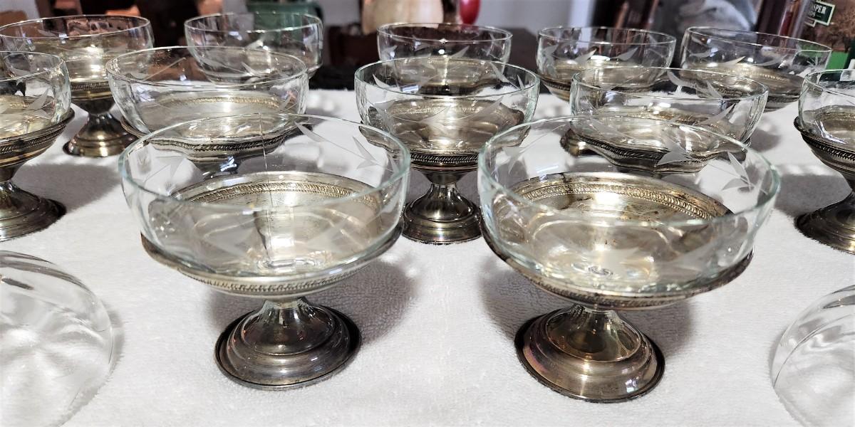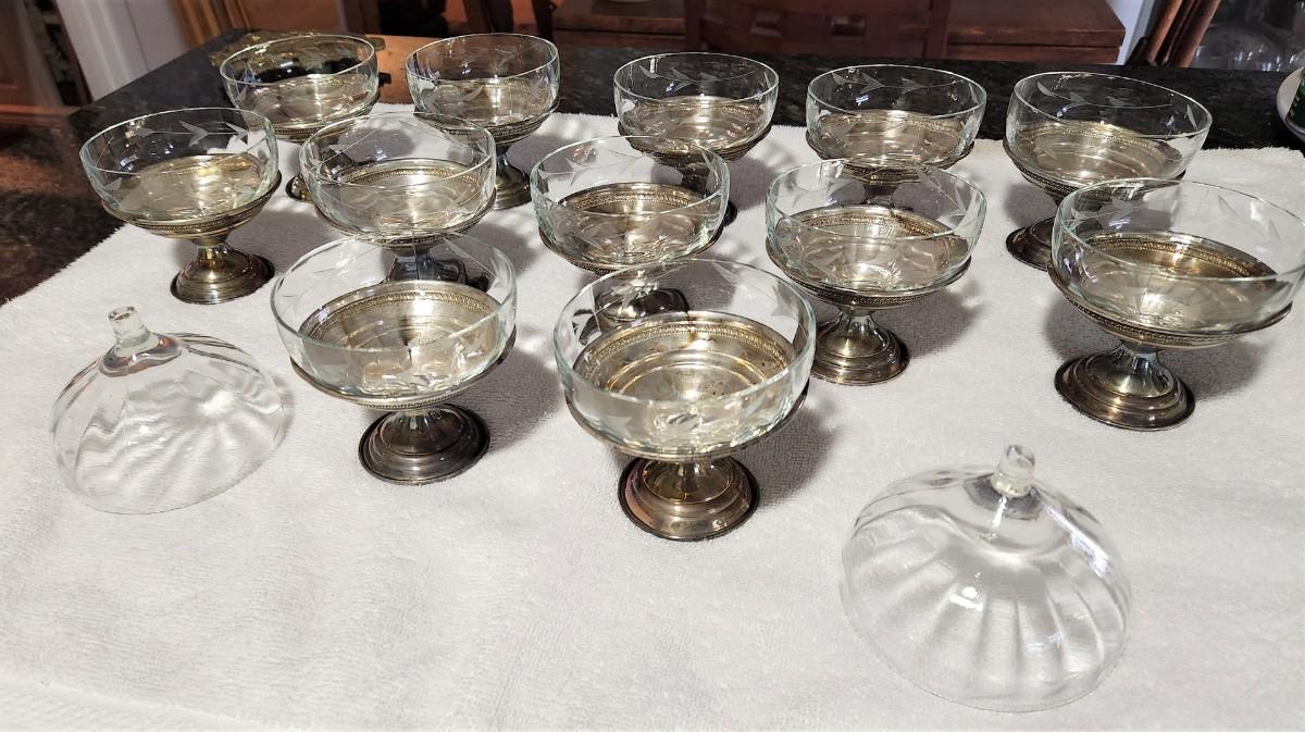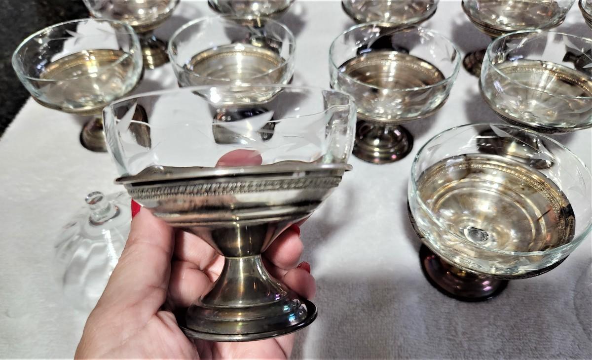 You get 12 vintage dessert sets - removeable glass liners, etched design - all have Sterling Silver (not weighted) bases. The set comes with two extra glass lines. These are from the 1950's. Each stands a little over 3" tall. No maker noted.