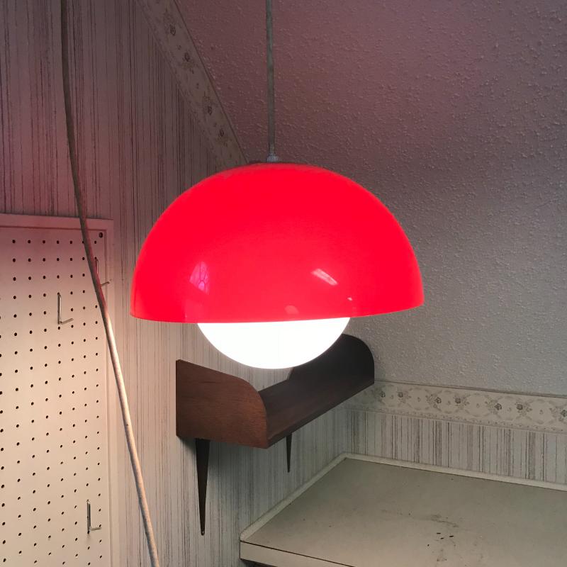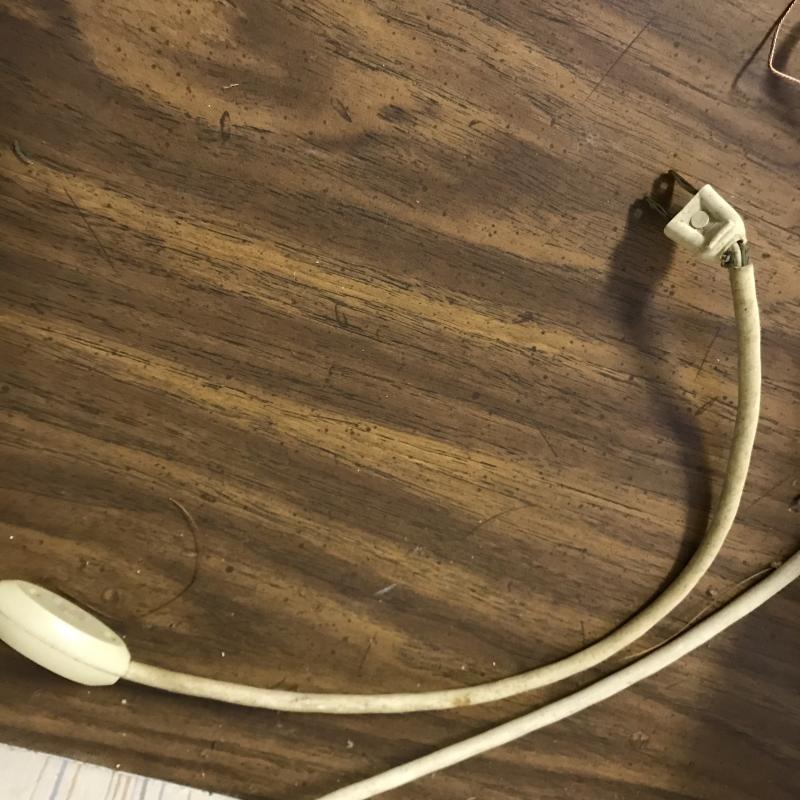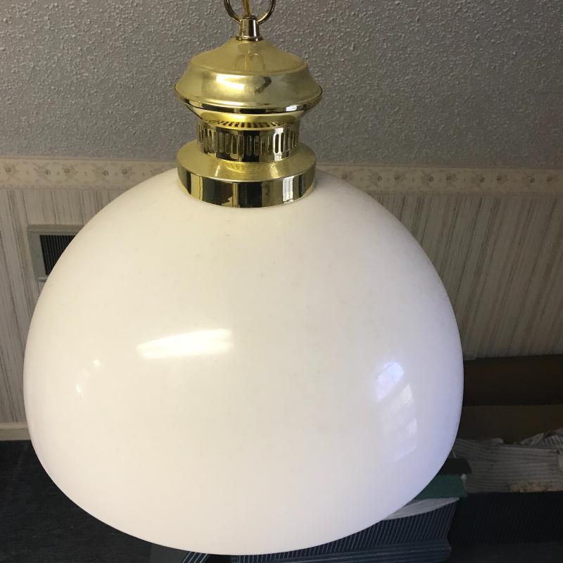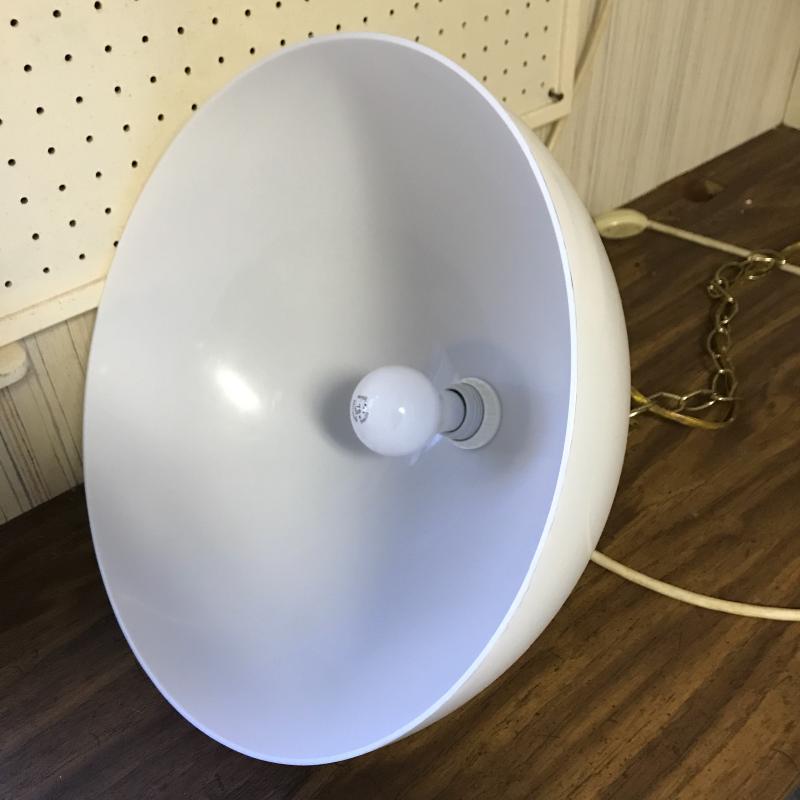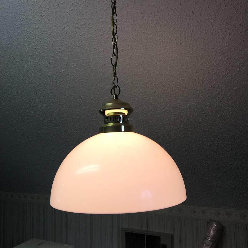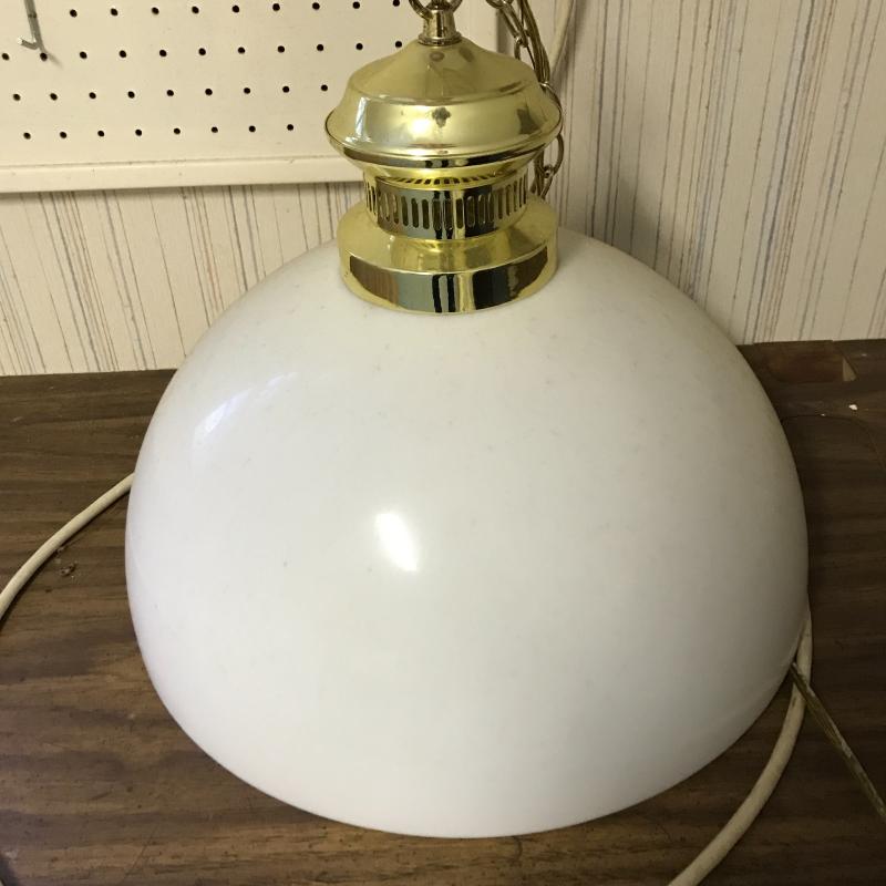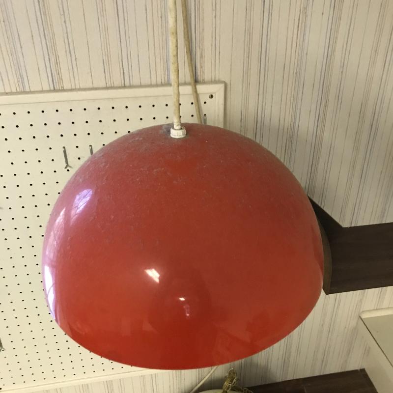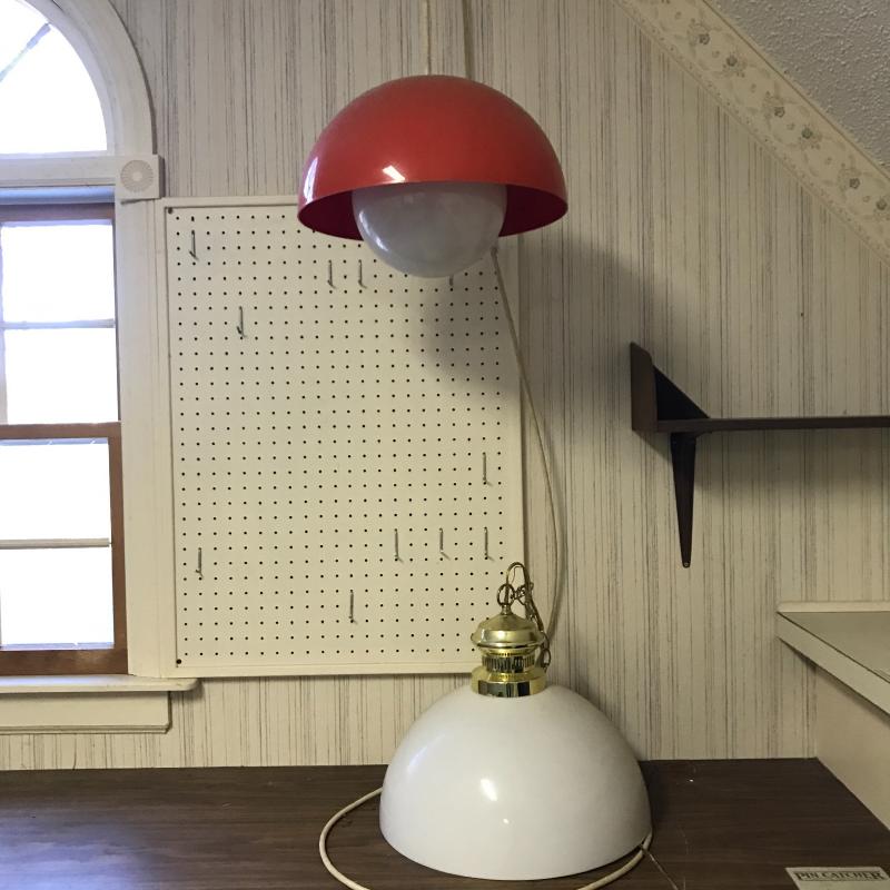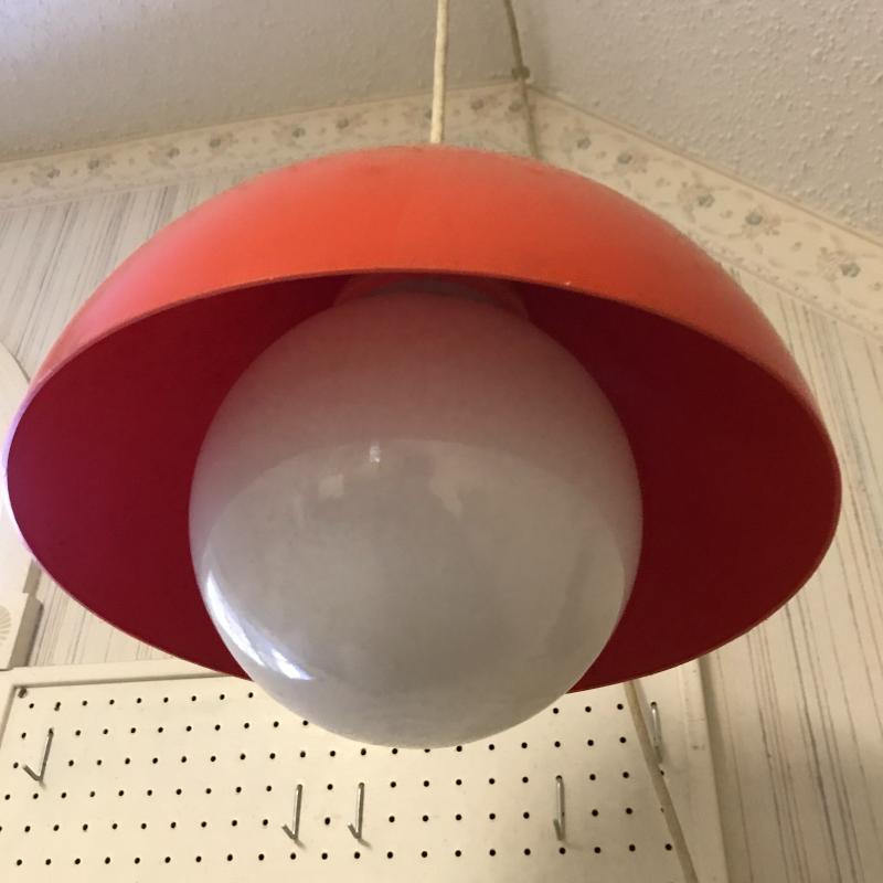 Two vintage hanging lights. One orange plastic cover with large glass globe. Plug-in cord has some damage. Can be taken off wall easily. 12” diameter with a switch. White plastic cover with brass detail is 15” diameter. Plugs right in. Both work. Shipping or local pick up in Flat Rock, NC.