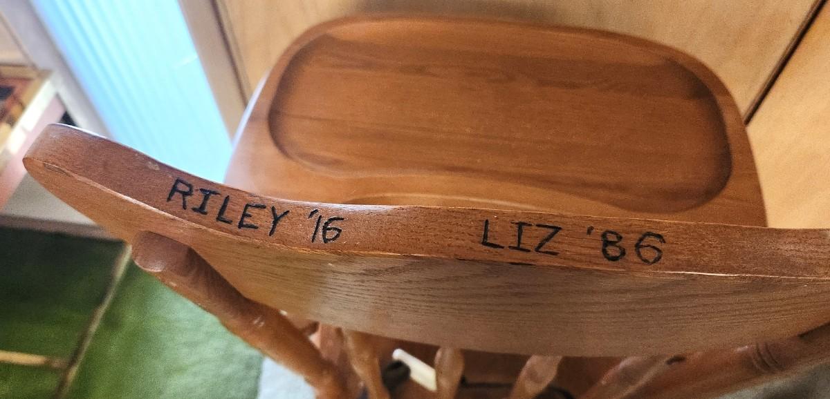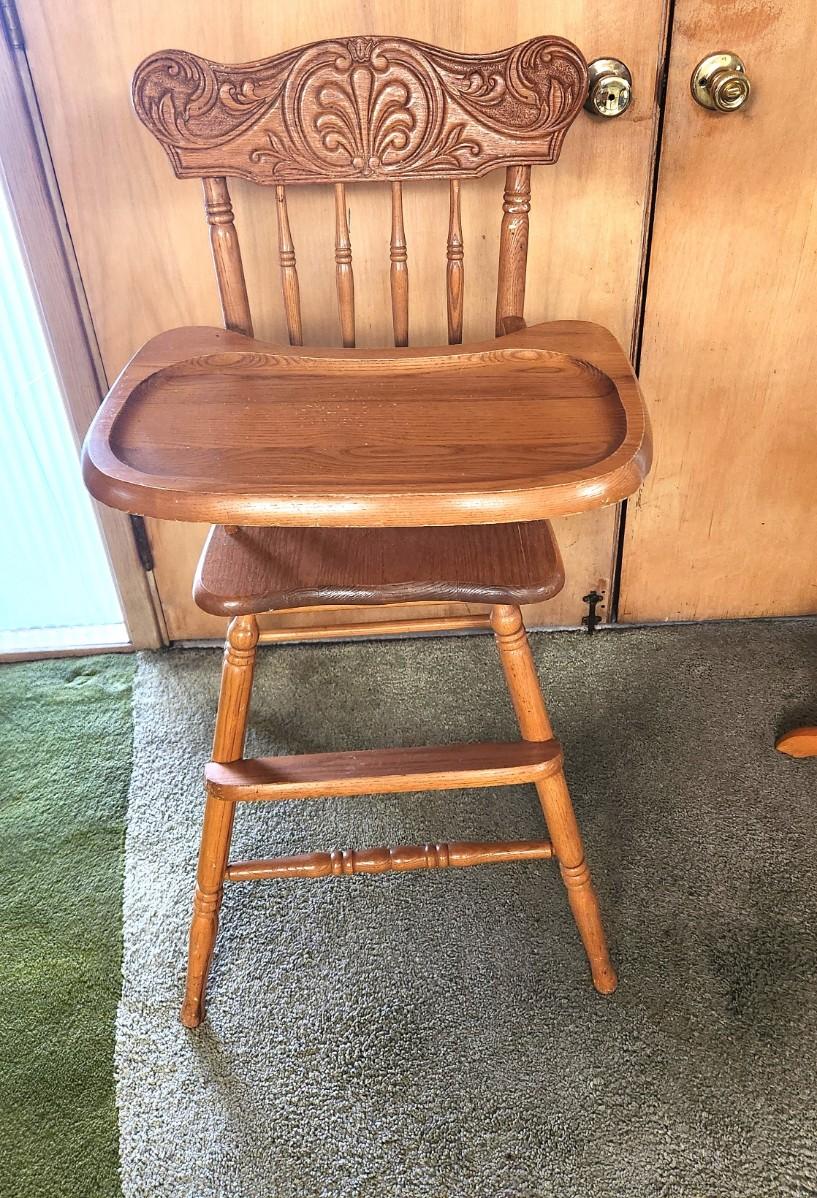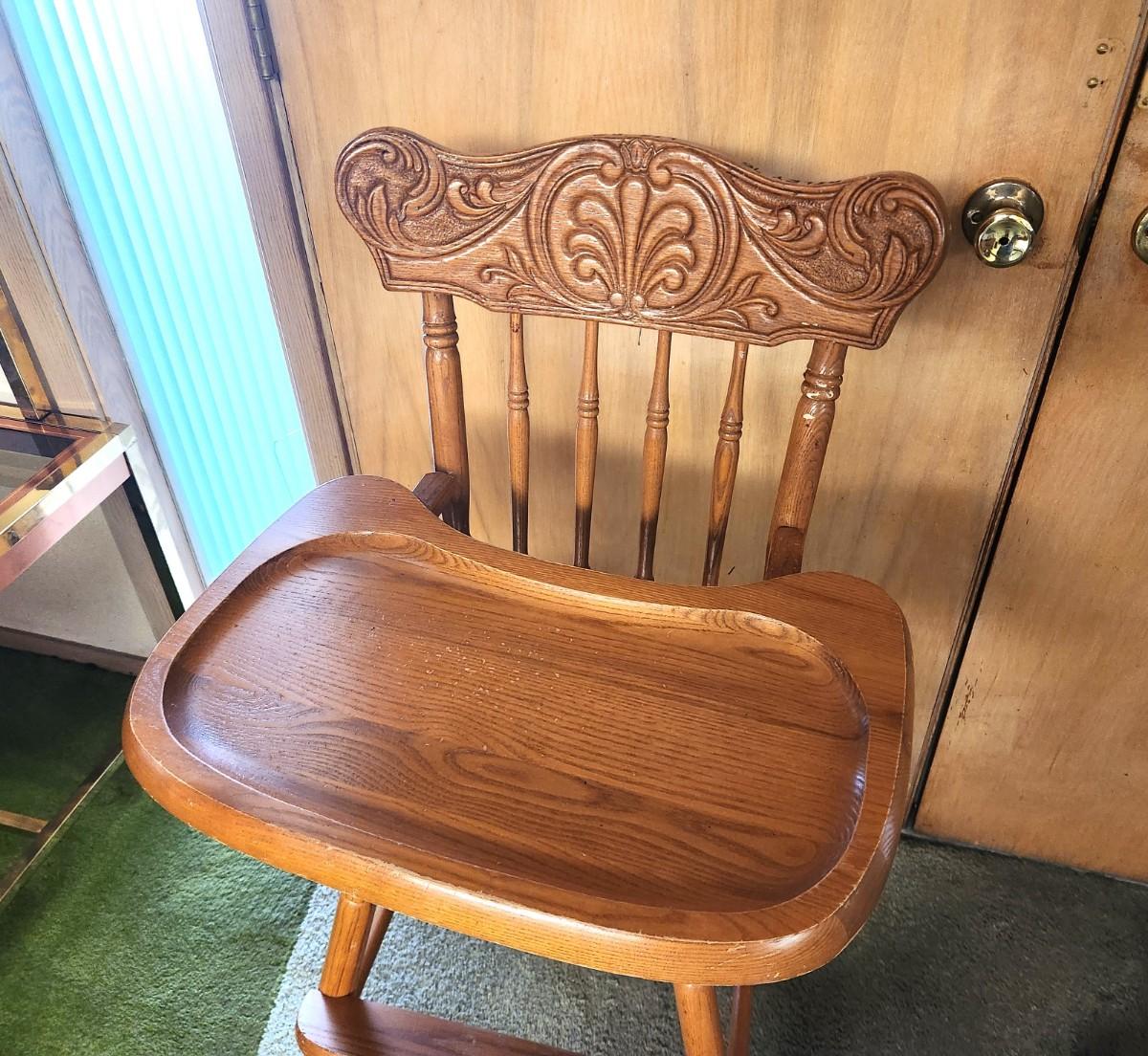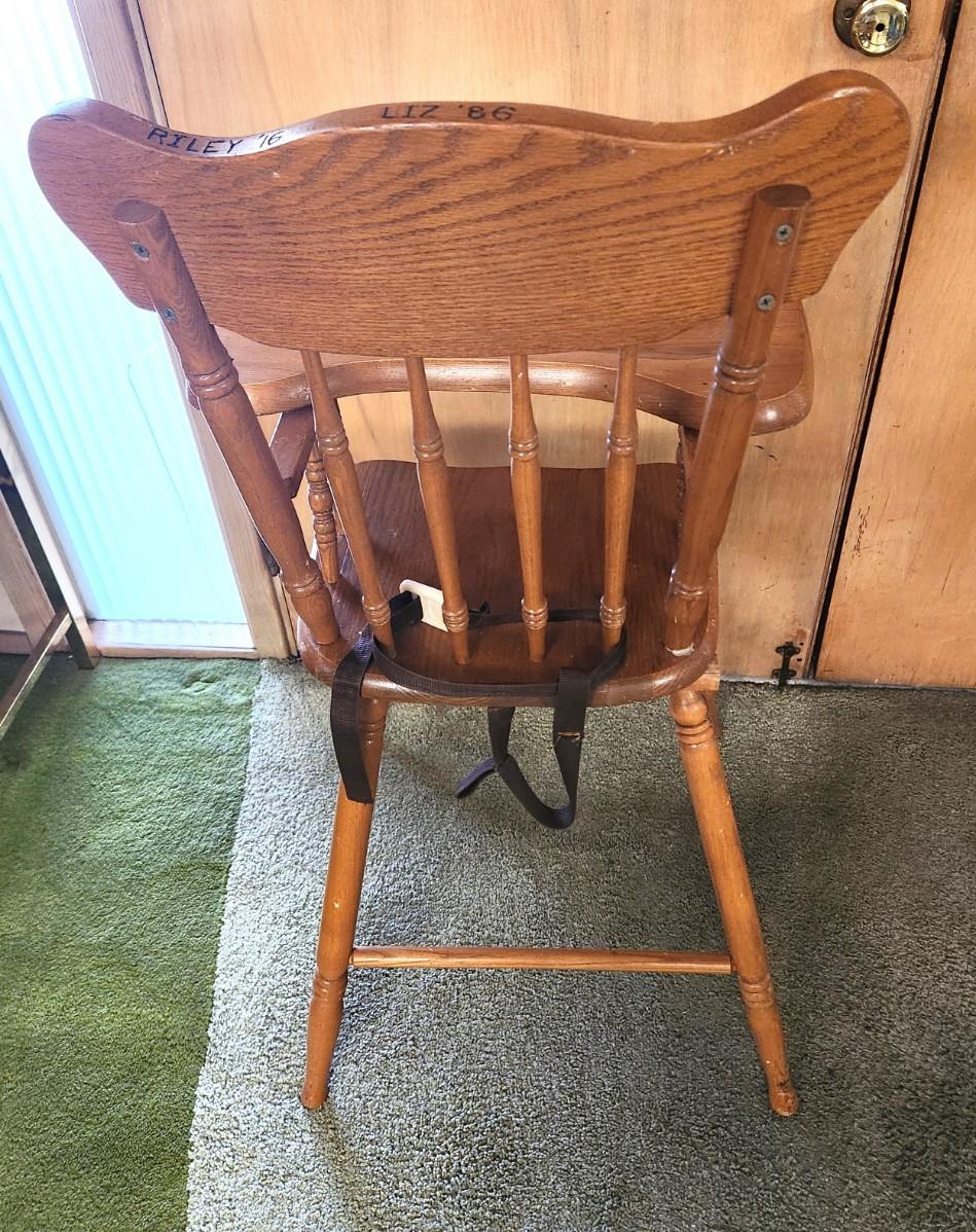 Second of 2 vintage highchairs in this sale. Wooden model - has names of children "served" engraved into the wood on the top of the seat back. 39" tall, 19.5" across - good for kids, dolls, or bears.