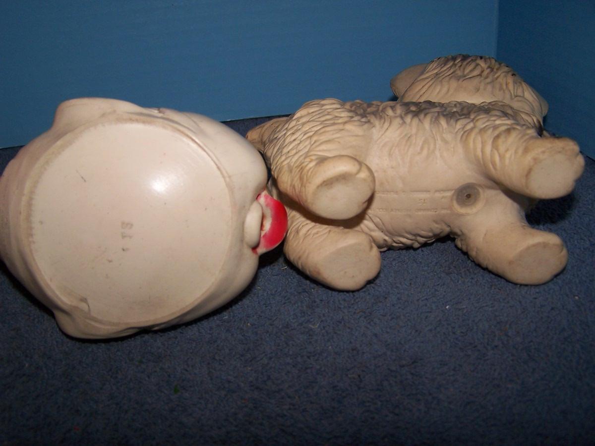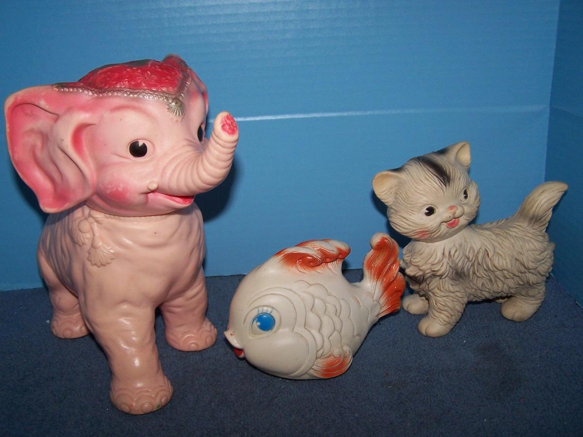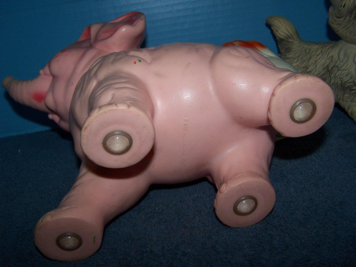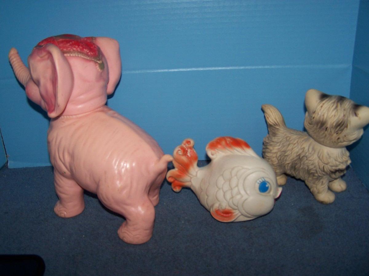 THESE ARE WONDERFUL VINTAGE SQUEAKY TOYS!!! ALL MARKED.. ELEPHANT IS 9'' TALL AND ROLLS.. ALL NEED BATHS.. ALL TOYS HAVE BEEN PLAYED WITH..