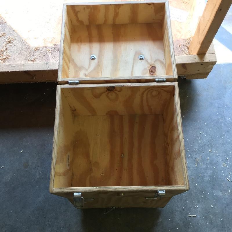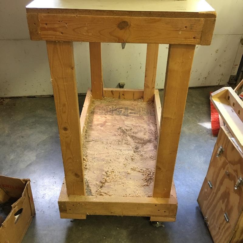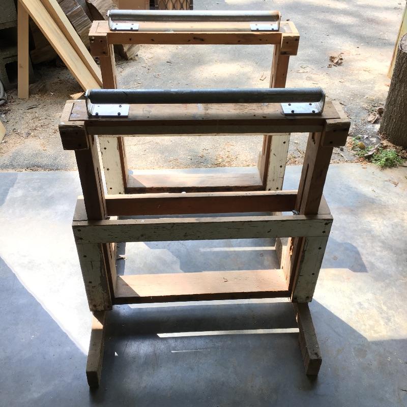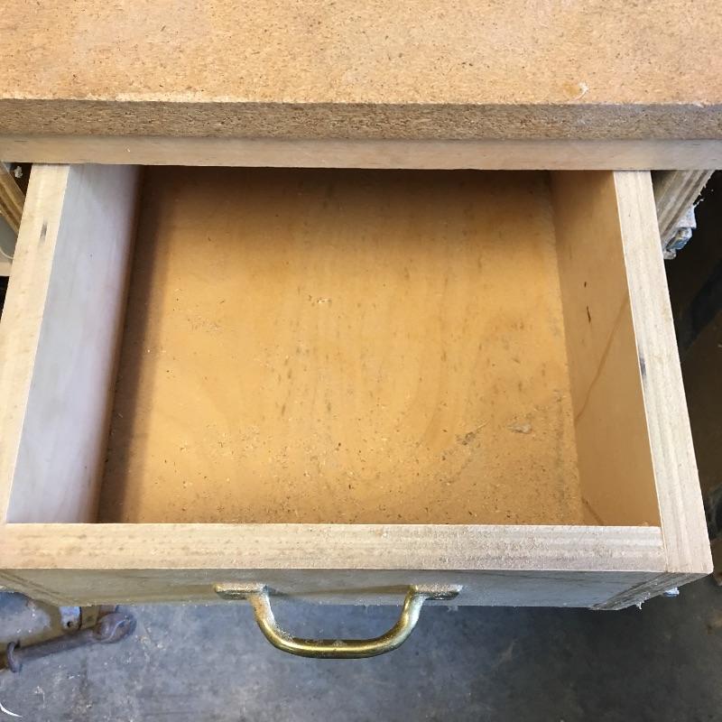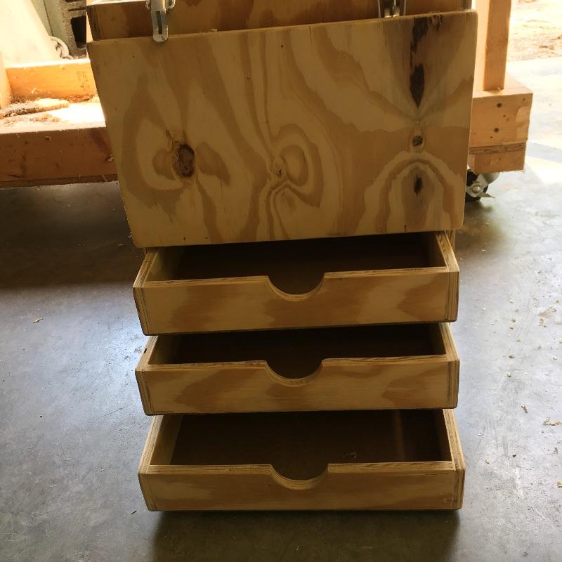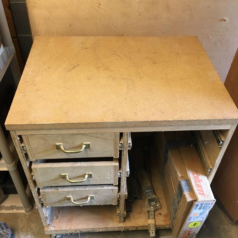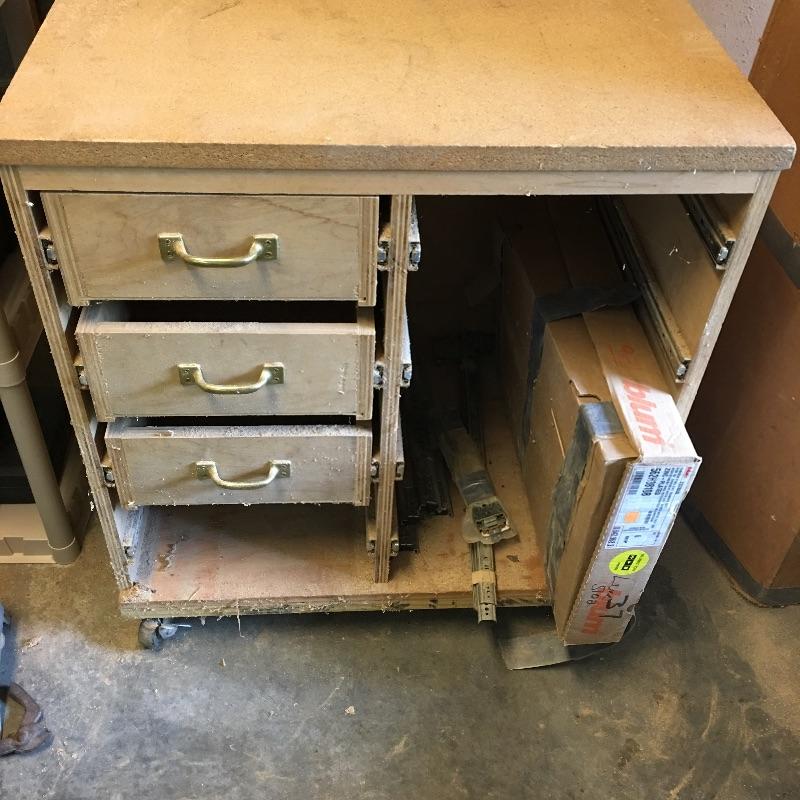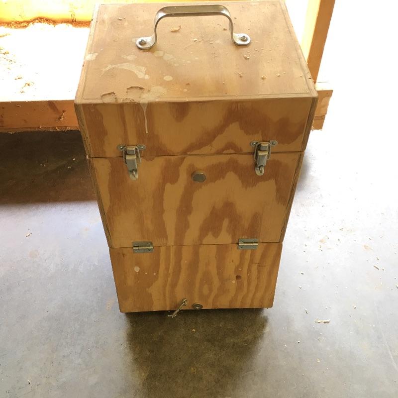 Wooden cart, pair of stands with rollers, three drawer rolling cabinet and wooden case with three drawers. Sander and planer not included. Cart measures 24” x 47” x 45”. Stands measure 21.5” x 27.5” x 33”.