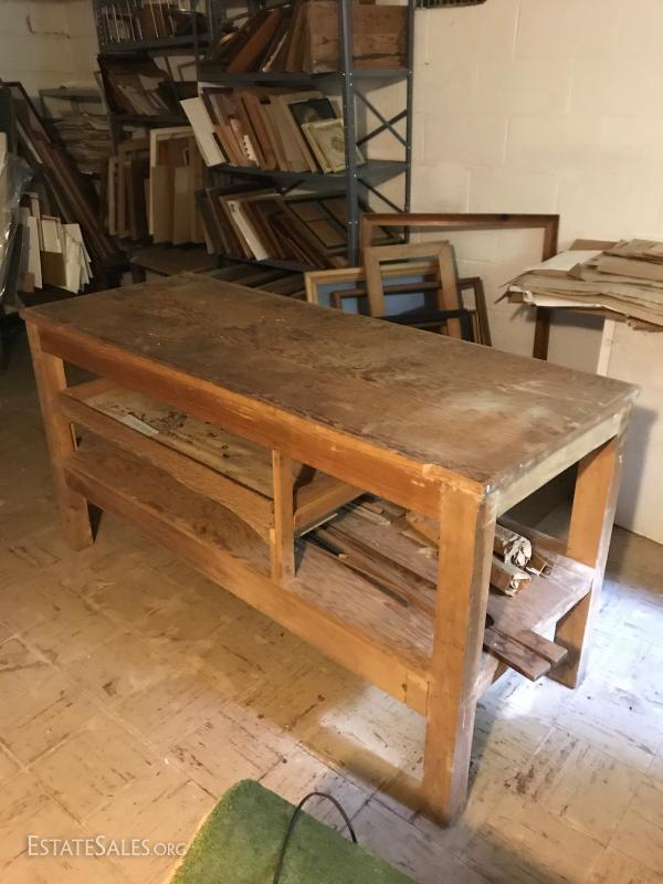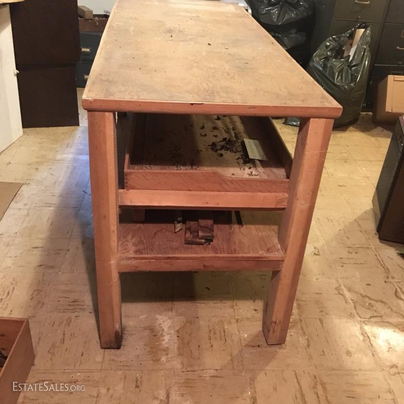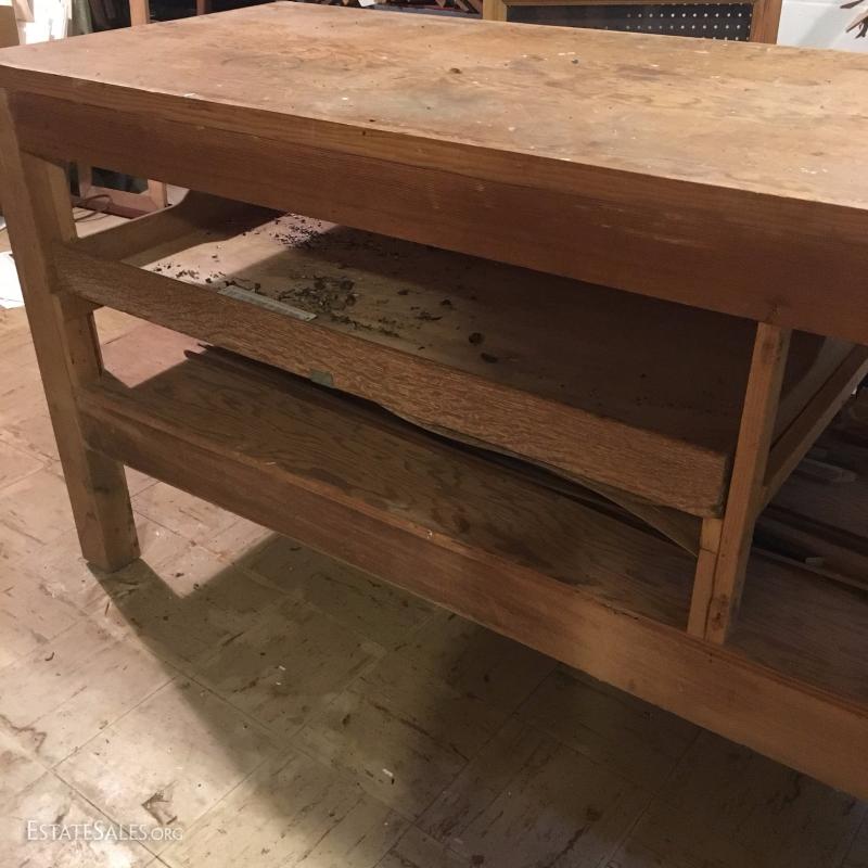 Wooden Work Bench with storage shelves. Sturdy. Likely handmade. 65"l x 26"w x 34"h
