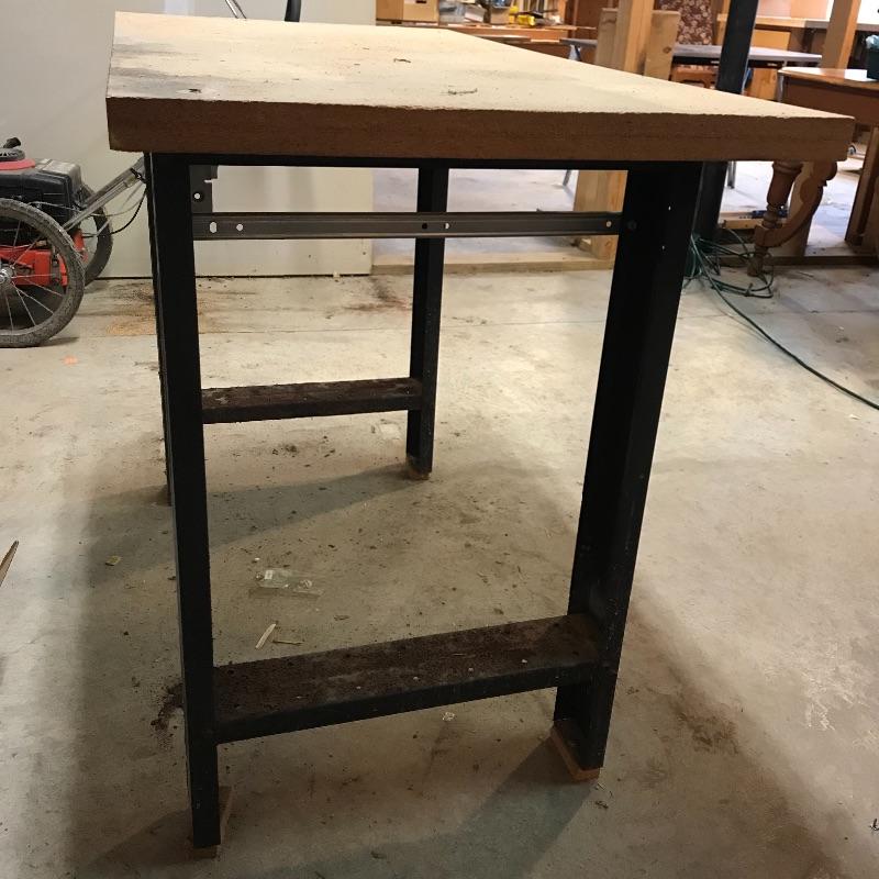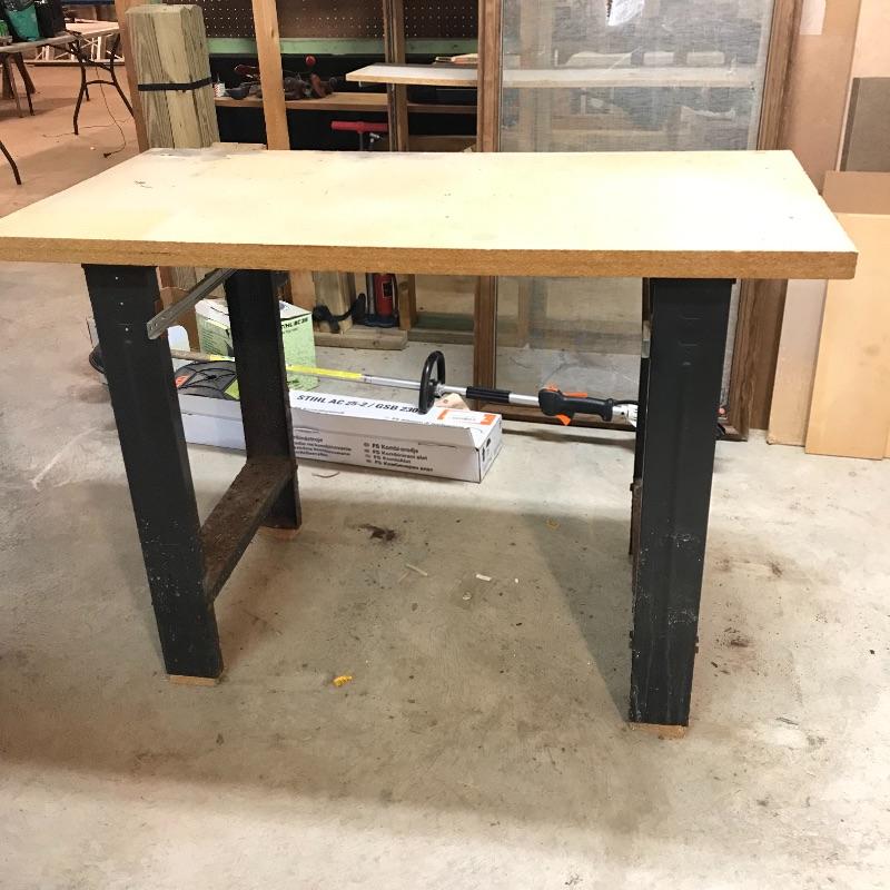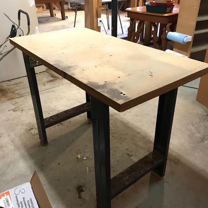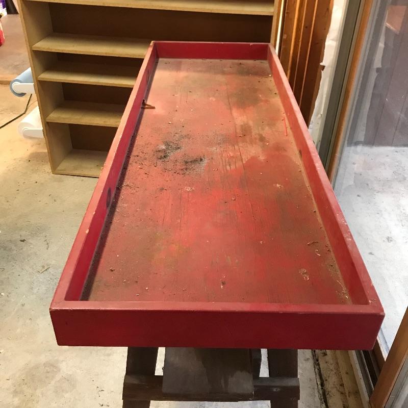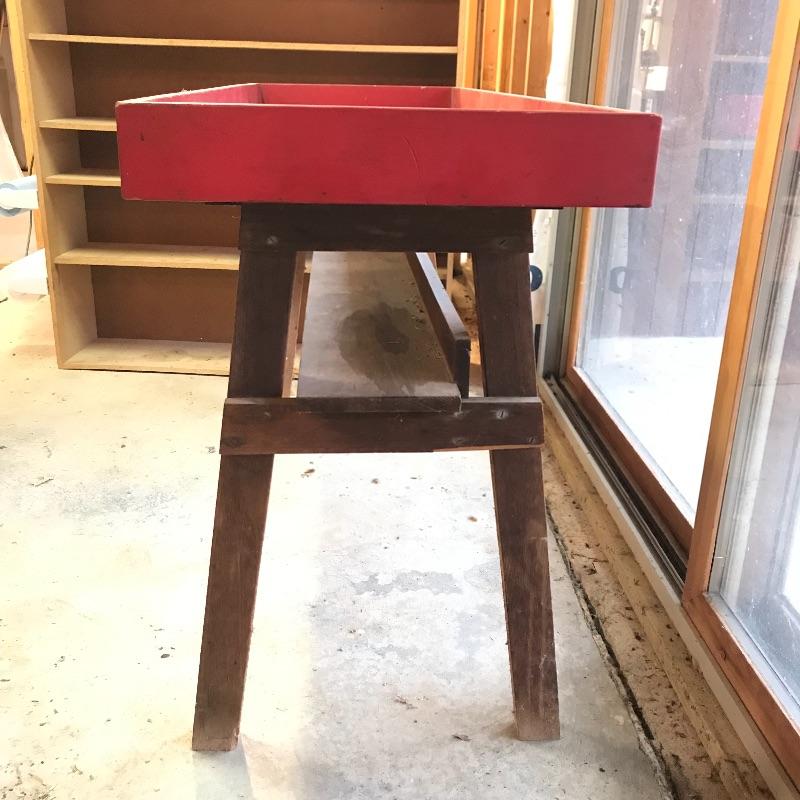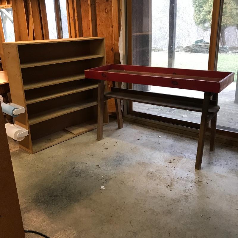 Two work tables and two pressed board shelf units. The red table is all wood and measures approximately 60” x 21” x 34.5” and has a 3” reservoir. The second table pictured has a pressed board top, metal legs bolted to wooden feet and measures approximately 48” x 24” x 34.5”. The first shelf unit is all pressed board with fixed shelves. It measures approximately 48” x 11.5” x 47.5” and comes conveniently with two attached paper towel holders. The last shelf is also pressed board with fixed shelves measuring approximately 42” x 11” x 52.5”. Please bring help to load, all items are located in basement. No shipping.