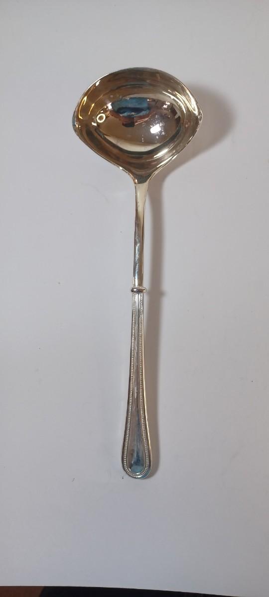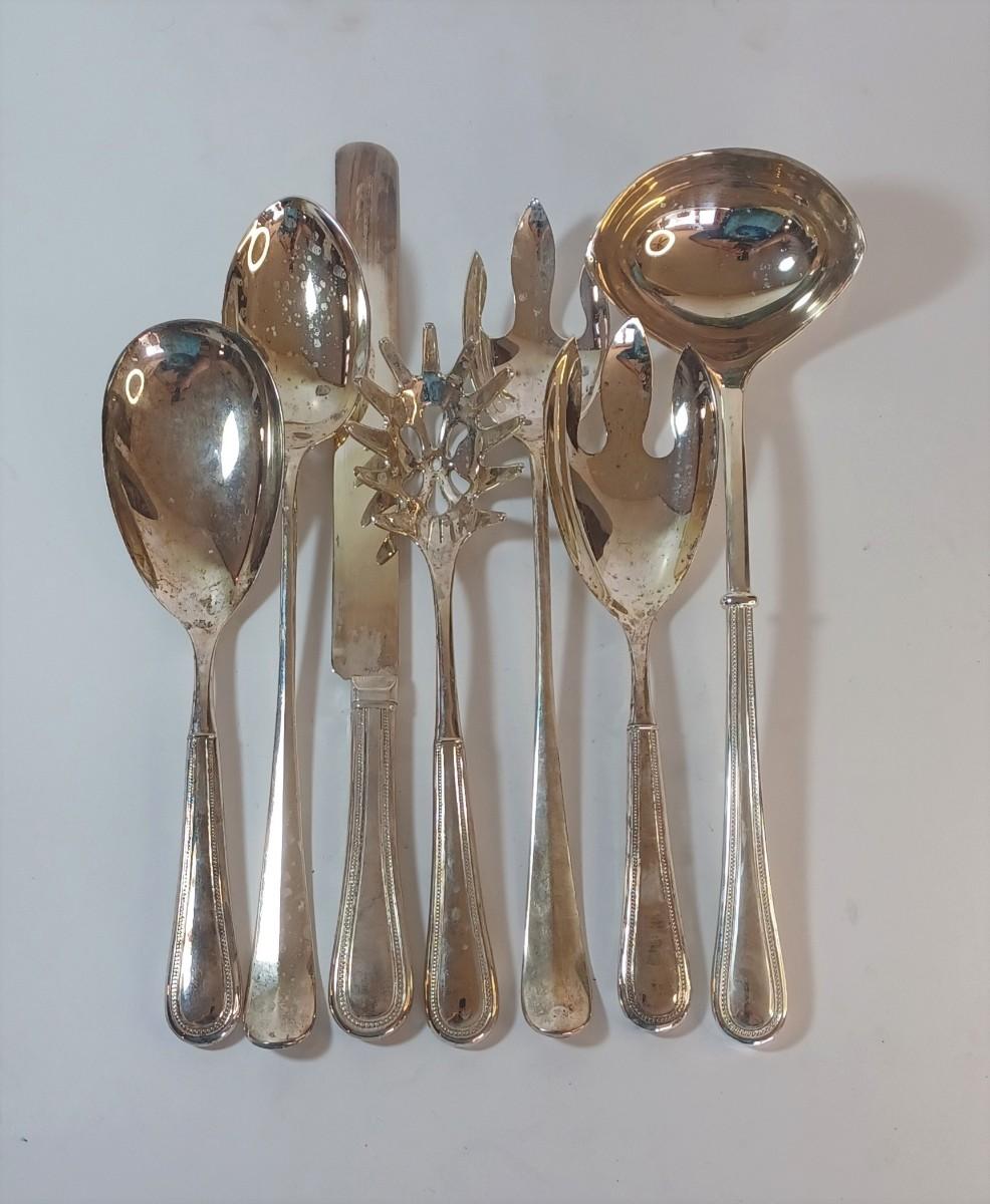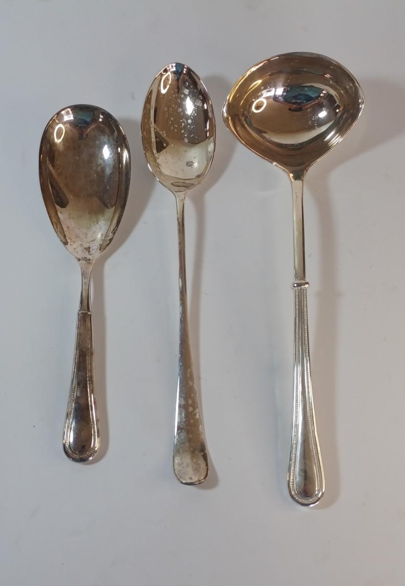 Set of serving utensils. Ladle and large spoons. Pasta spoon and cake knife.