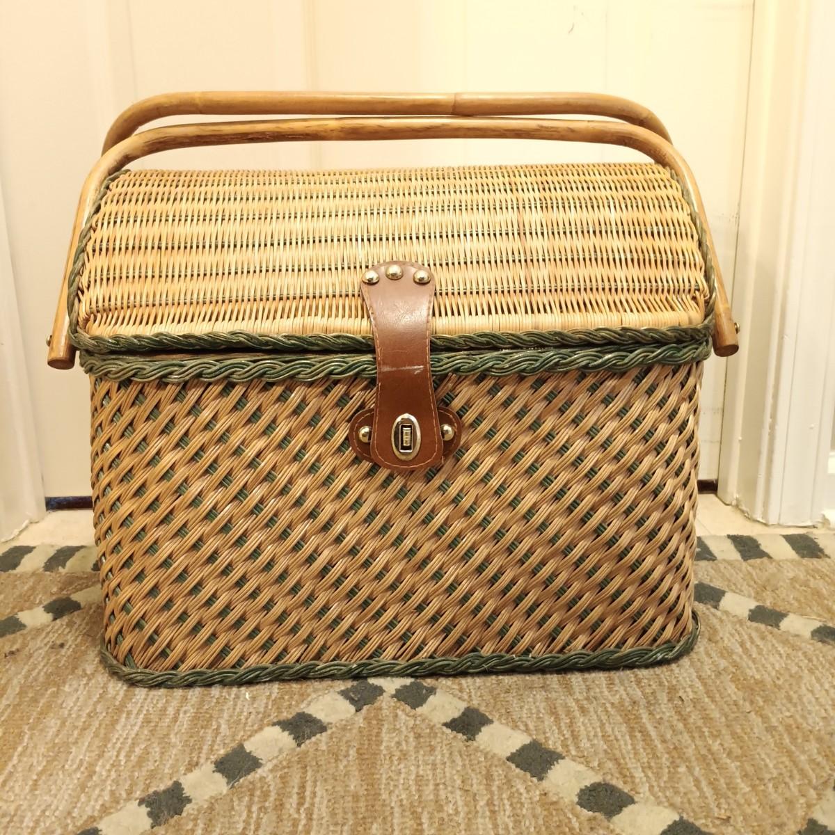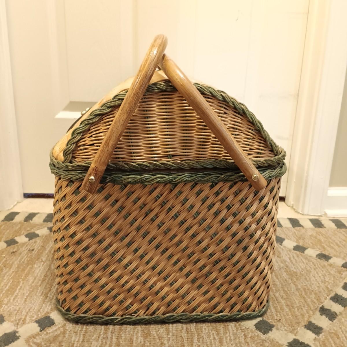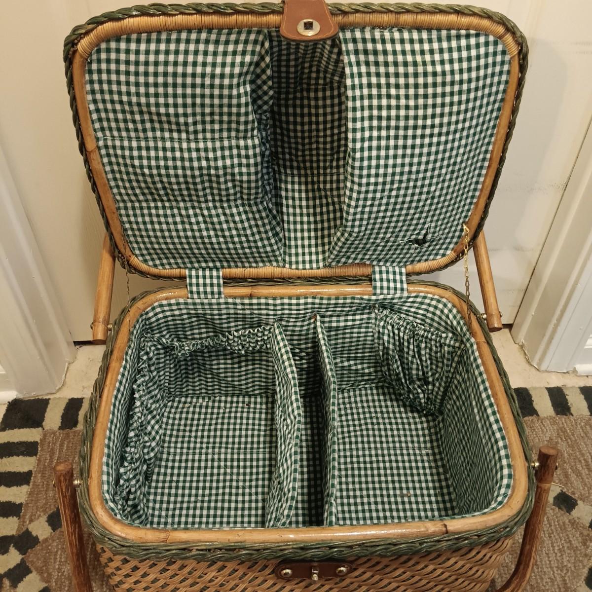 80s Style Picnic Basket w/ Green Trim: 17" x 13" x 15"