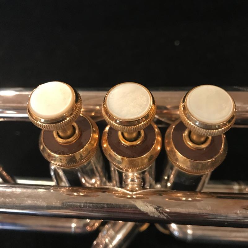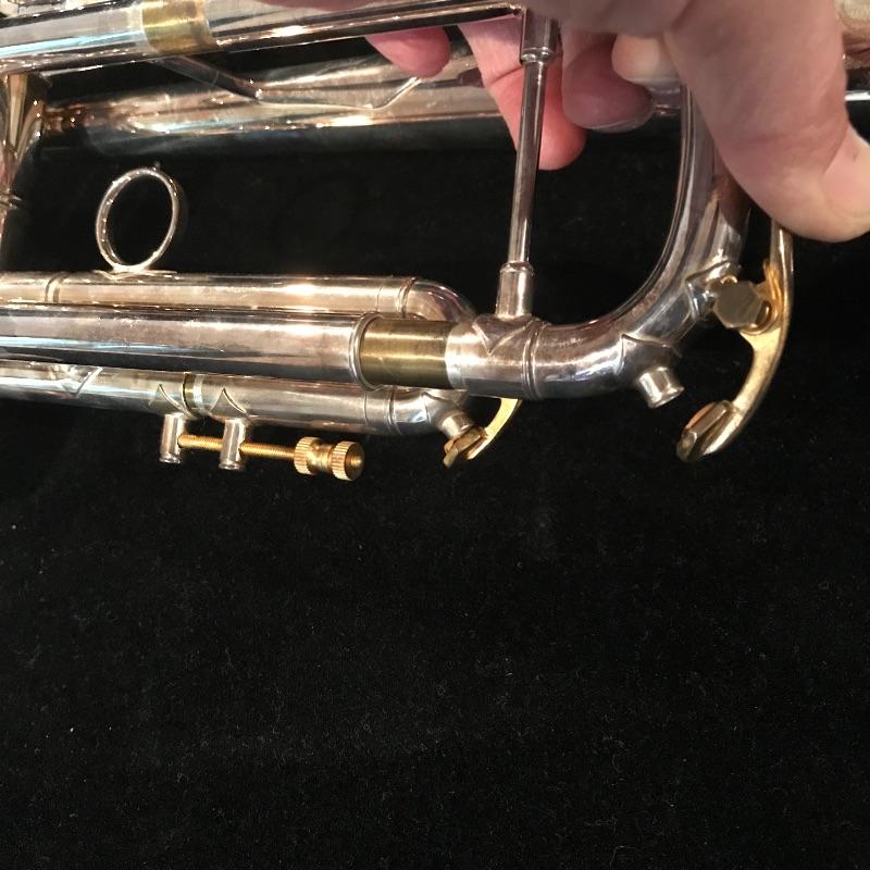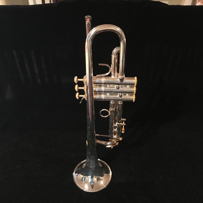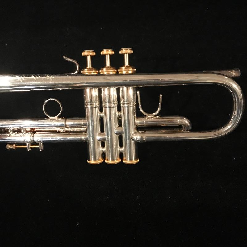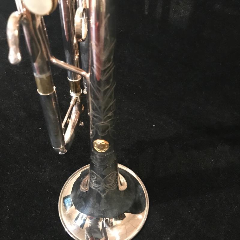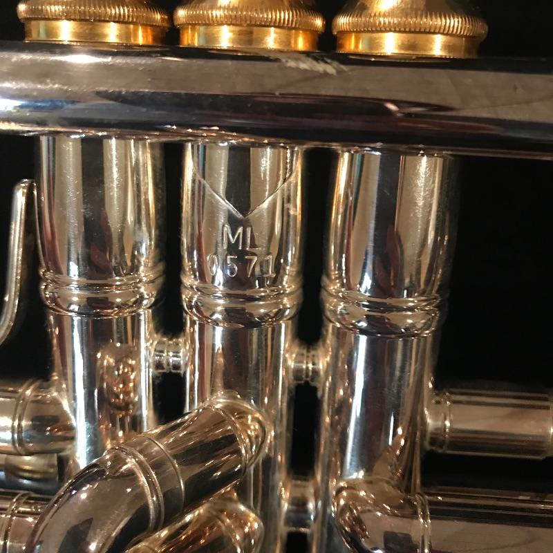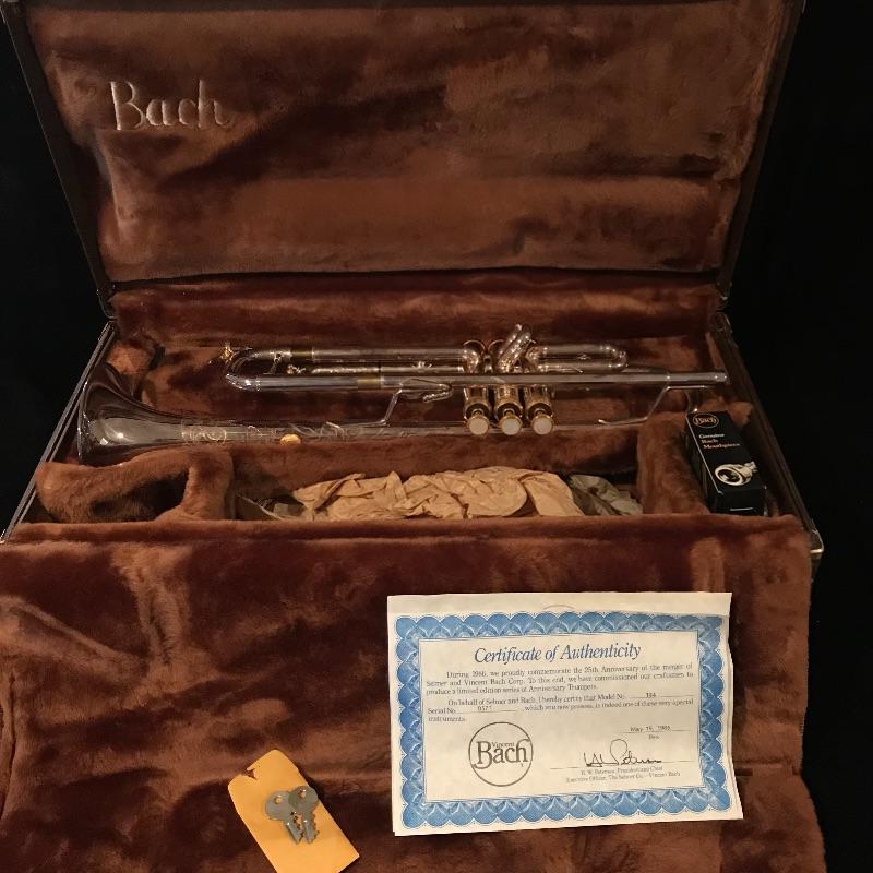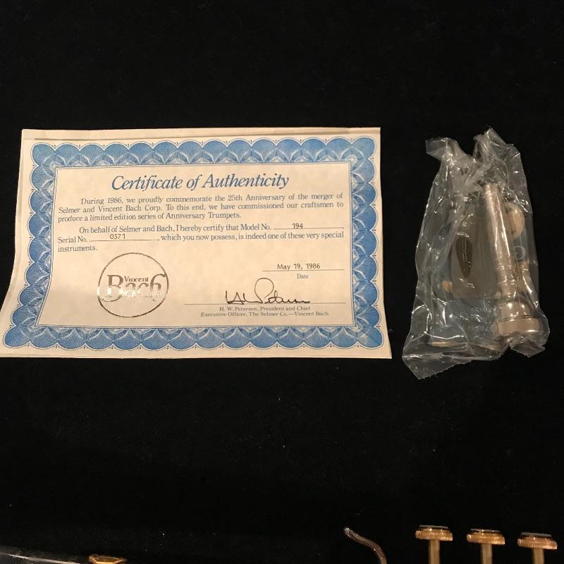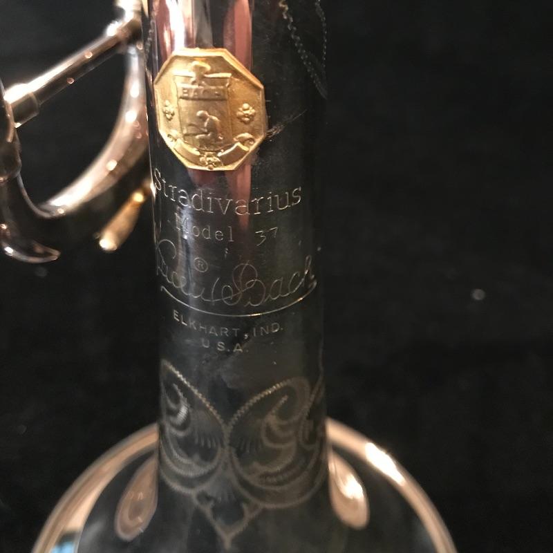 Amazingly beautiful silver Vincent Bach Stradivarius trumpet. Complete with Certificate of Authenticity stating 1986, serial number as 0571, which is also stamped on second valve. Trumpet itself has a “Model Number 37” stamp near the bell while COA has a 194 in its model no. space. This trumpet was stored in its lined case. Valves do not open currently, they were not pushed with much force. Waterkey opens with minimal effort. Amazing etching can be found on bell, see photos. Mouthpiece is unused, sealed in its presumably original plastic. Case appears to be leather with brass hardware, keys included. Case is in very nice shape measuring approximately 21.25” x 6” x 11.5”. Instrument sound quality has not been tested. Shipping available.