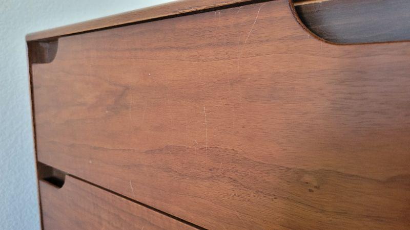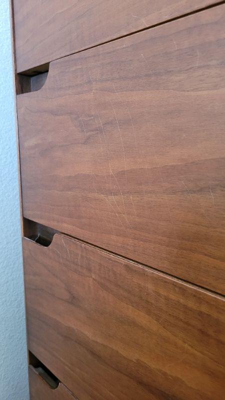 Ms. Museum RATING: 8.25 out of 10. Please see pictures for light scratching and other surface defects shown that appear on both face and topside. None appear very deep. All drawers operate as intended despite a bit of expected stubbornness attributed to the time of year.