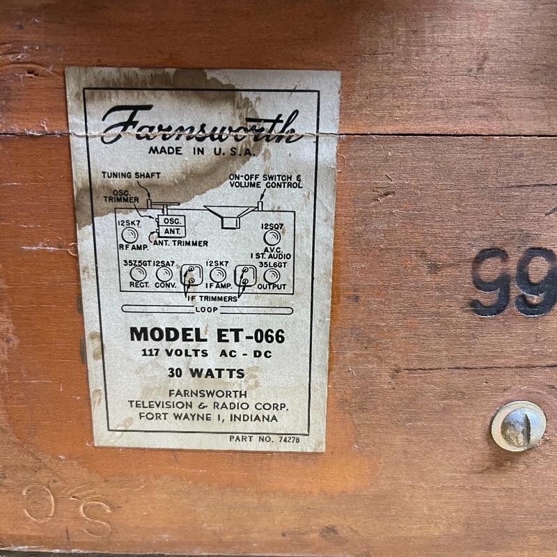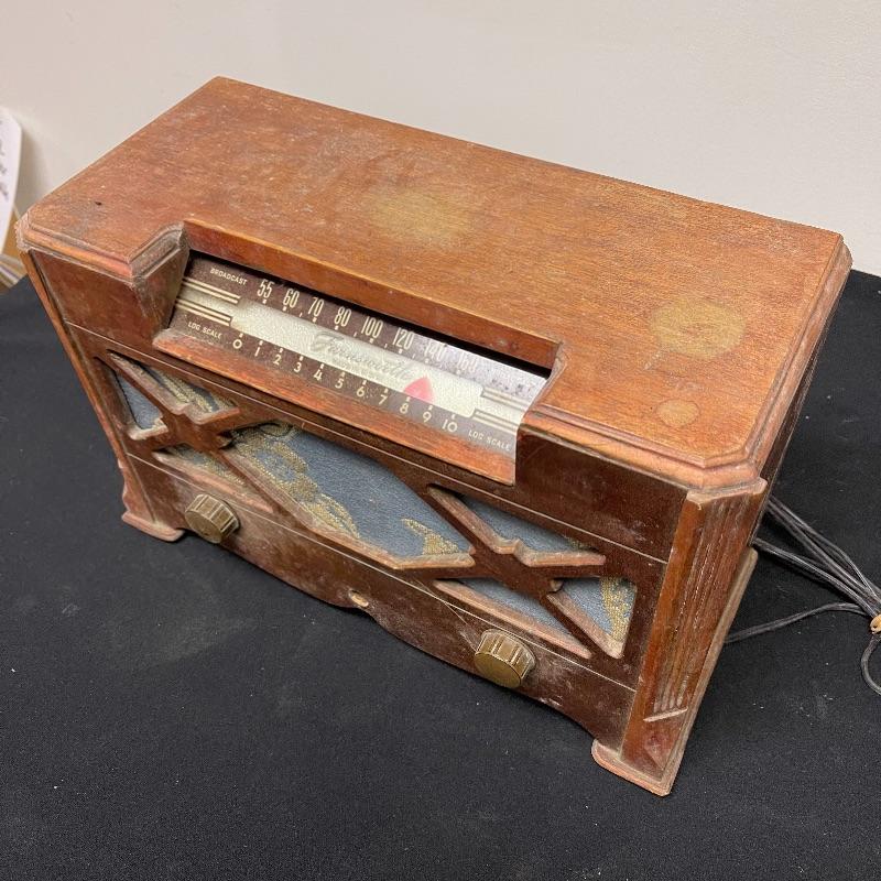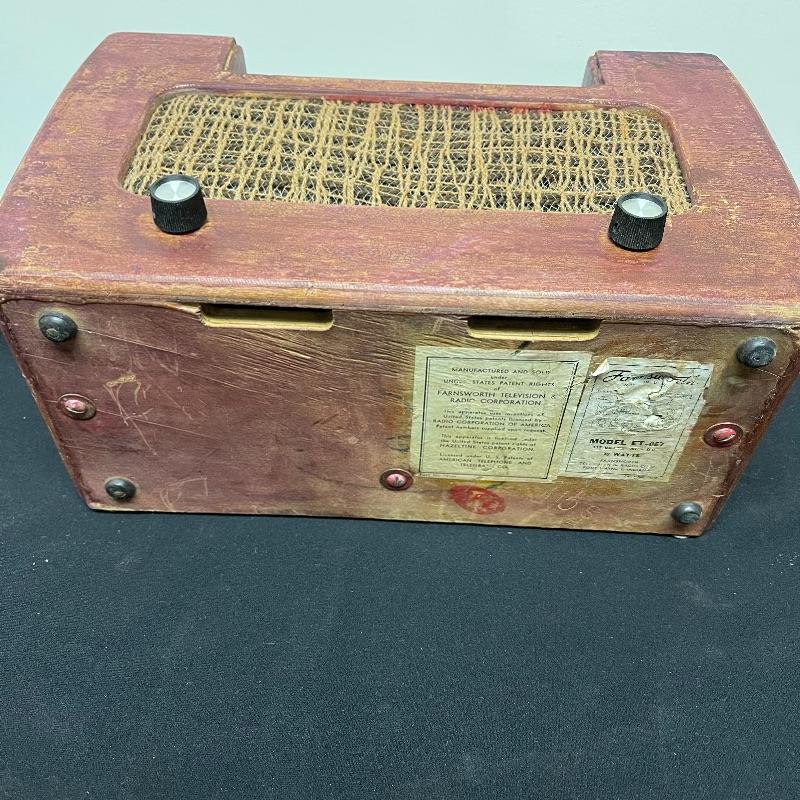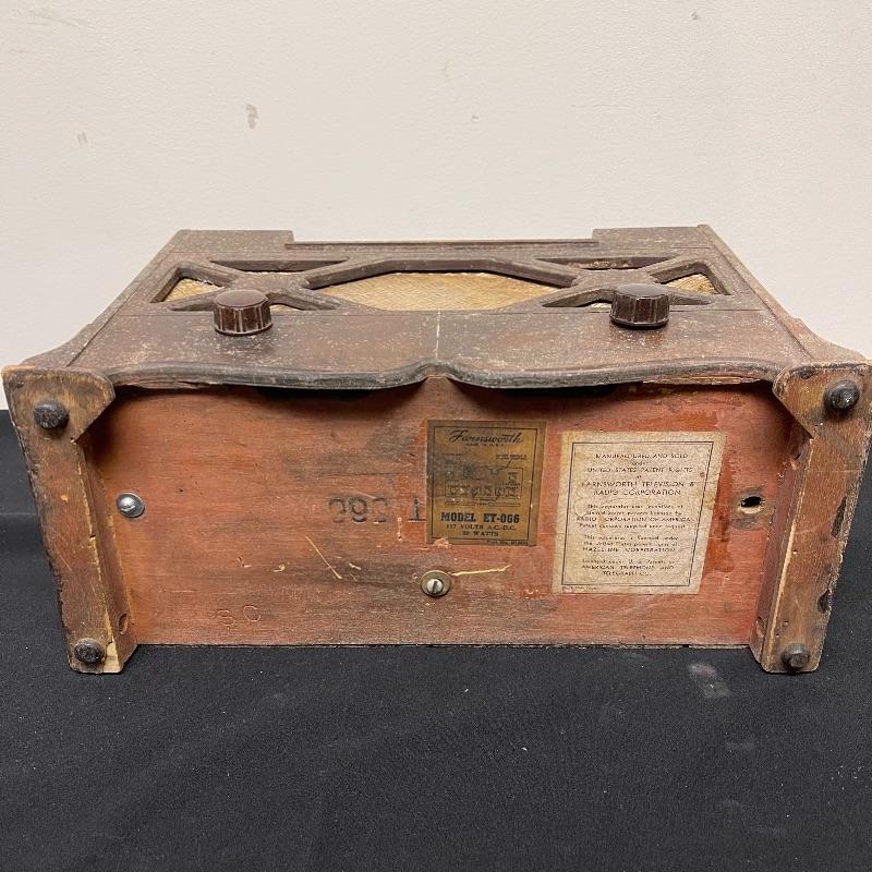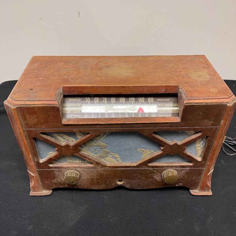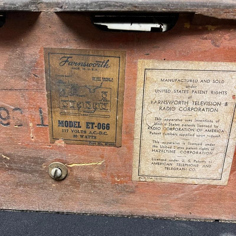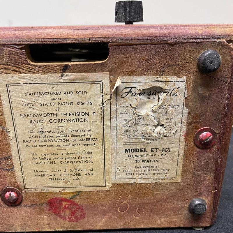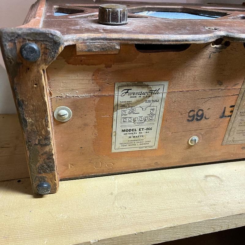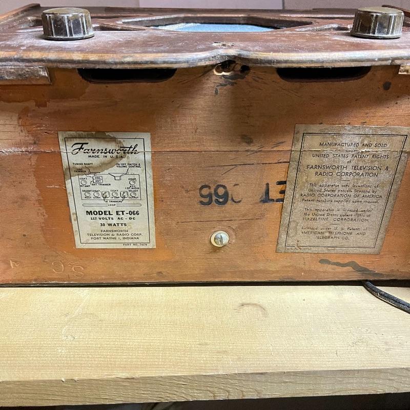 Vintage Farnsworth Radios. The first is a model ET-066 and it does not have a power cord. The second is model ET-067 and when plugged in, it powered on. The third is also an ET-066 model but a lighted color wood and different patterned fabric than the first radio. This one also powered on when plugged in and made a humming noise.
