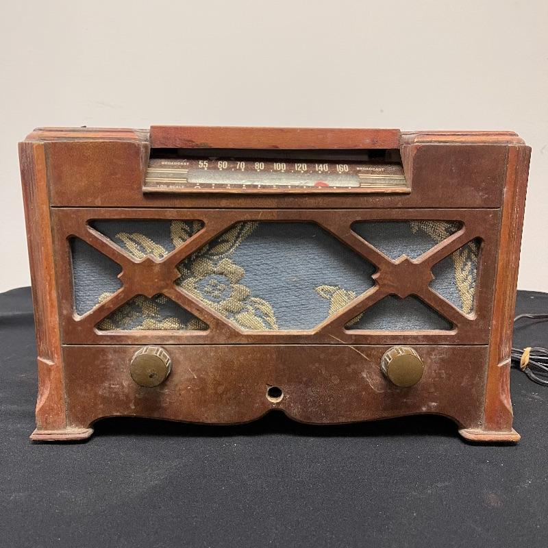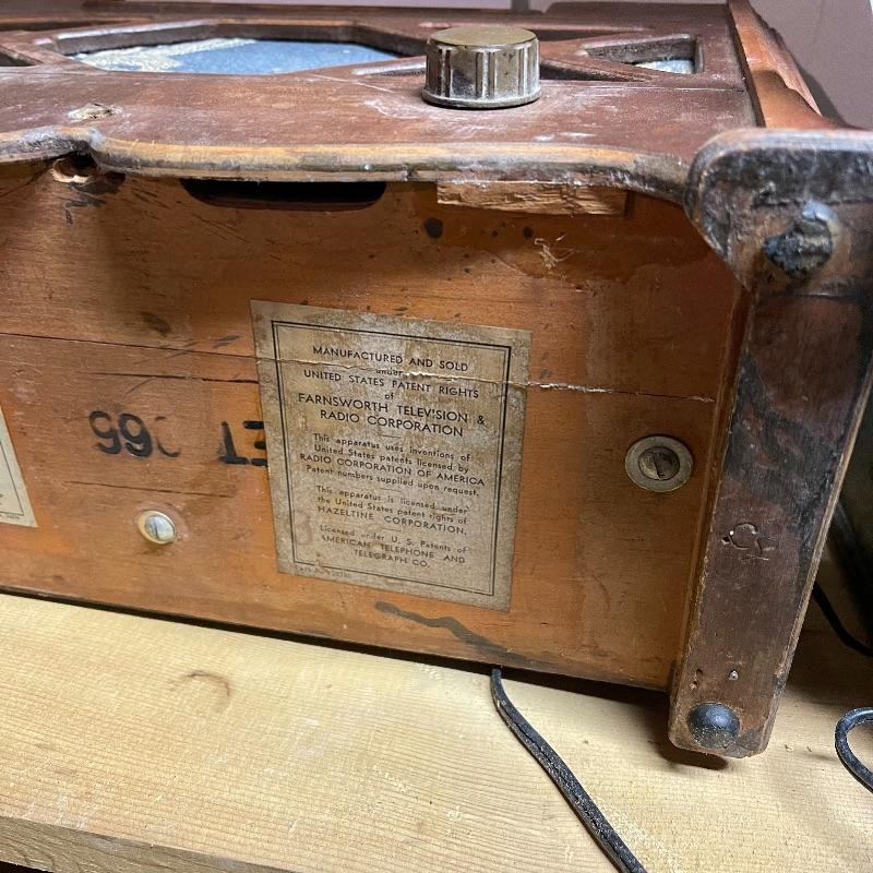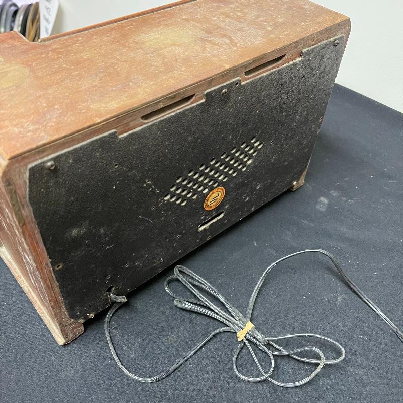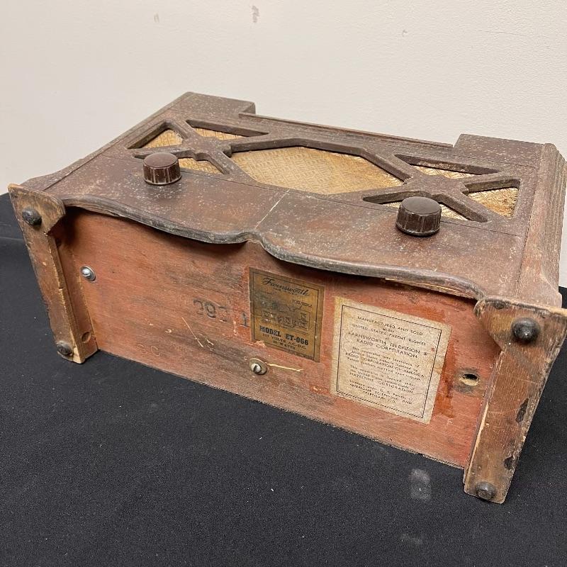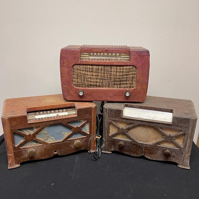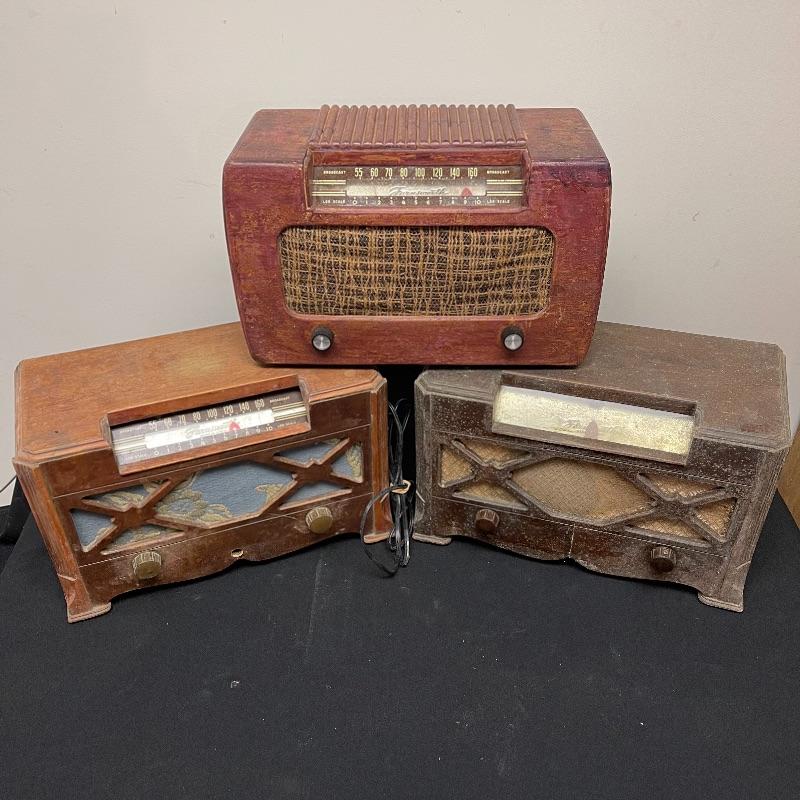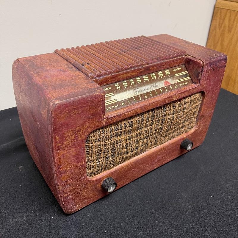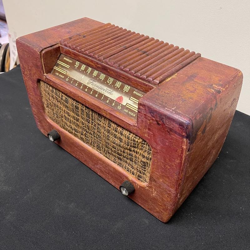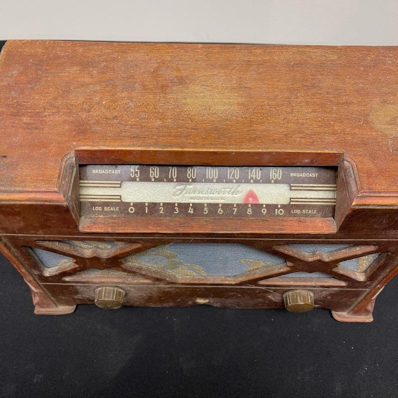 Vintage Farnsworth Radios. The first is a model ET-066 and it does not have a power cord. The second is model ET-067 and when plugged in, it powered on. The third is also an ET-066 model but a lighted color wood and different patterned fabric than the first radio. This one also powered on when plugged in and made a humming noise.