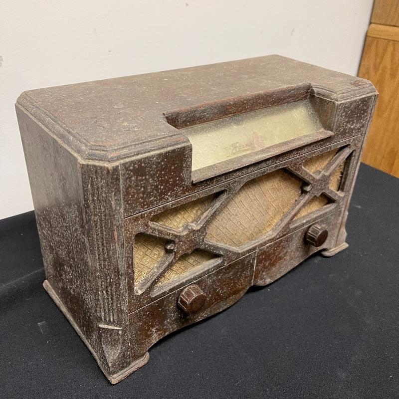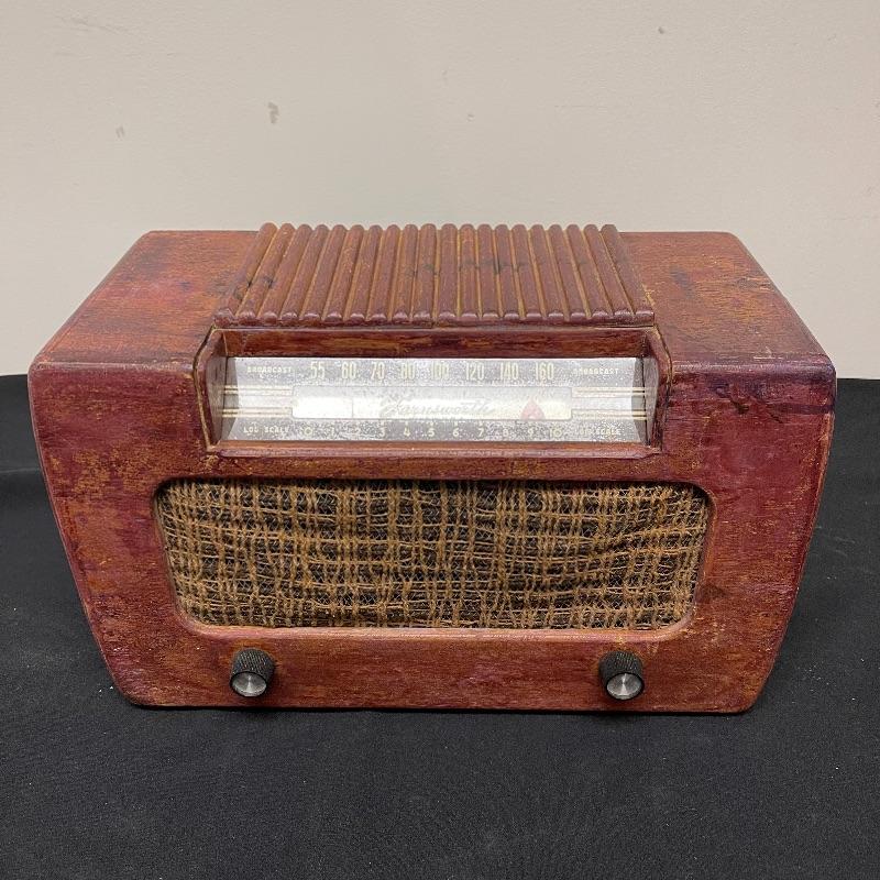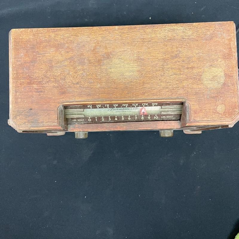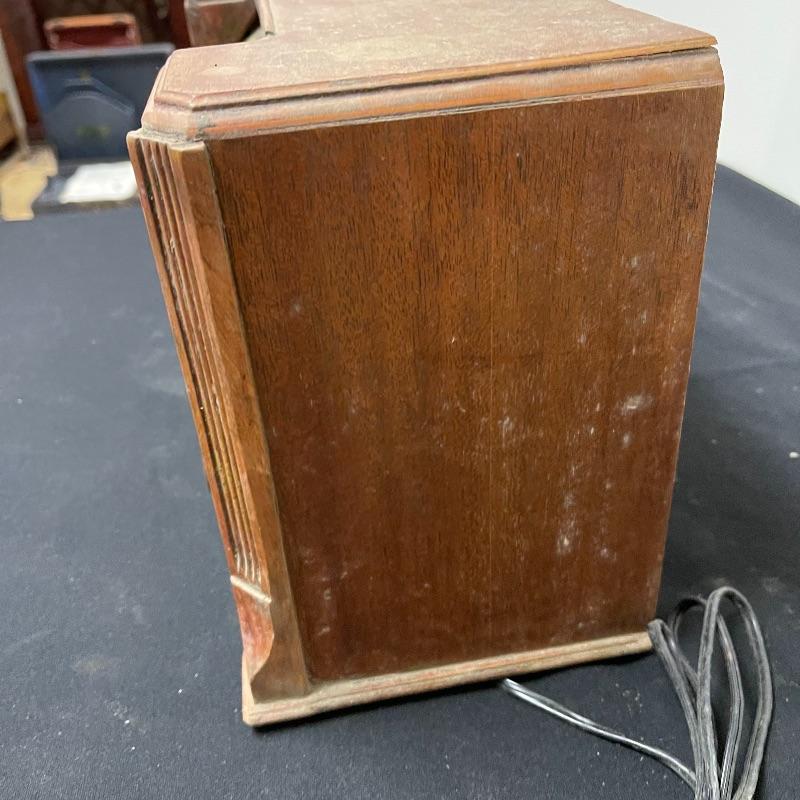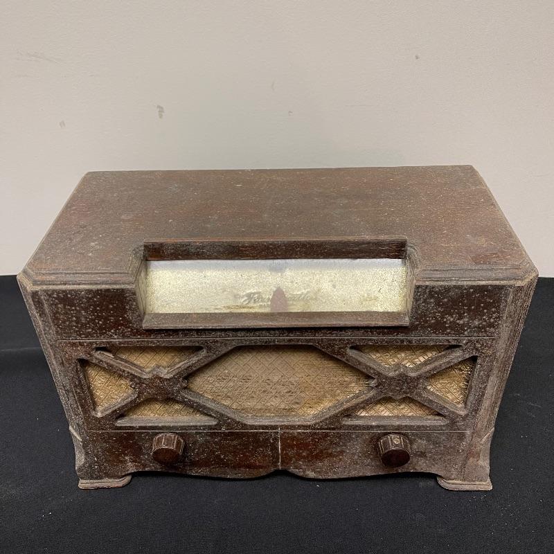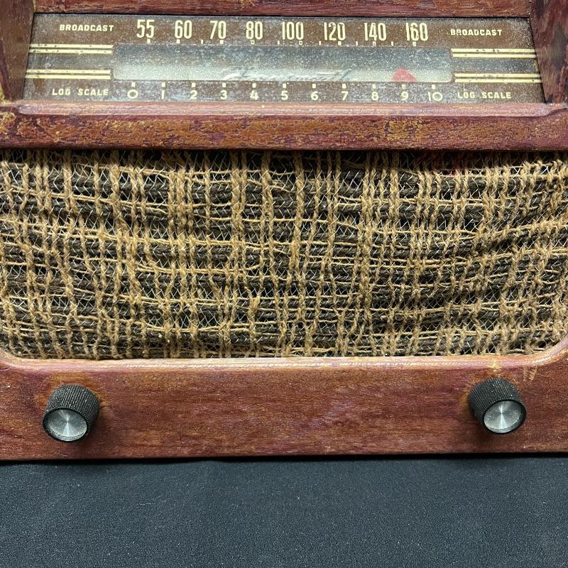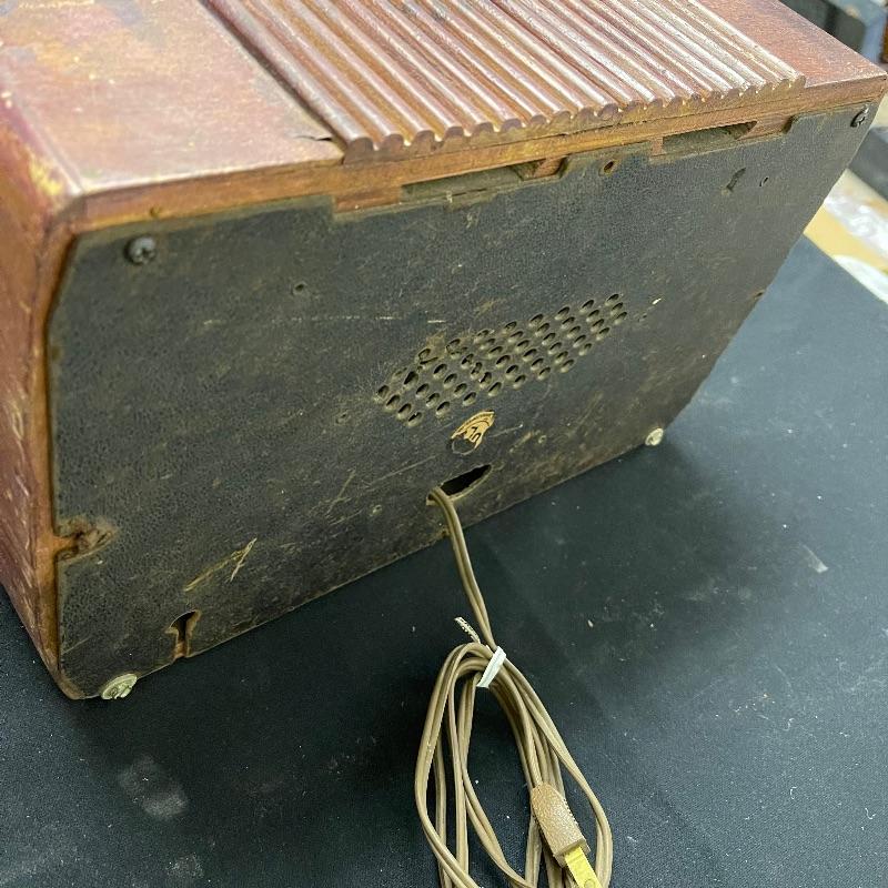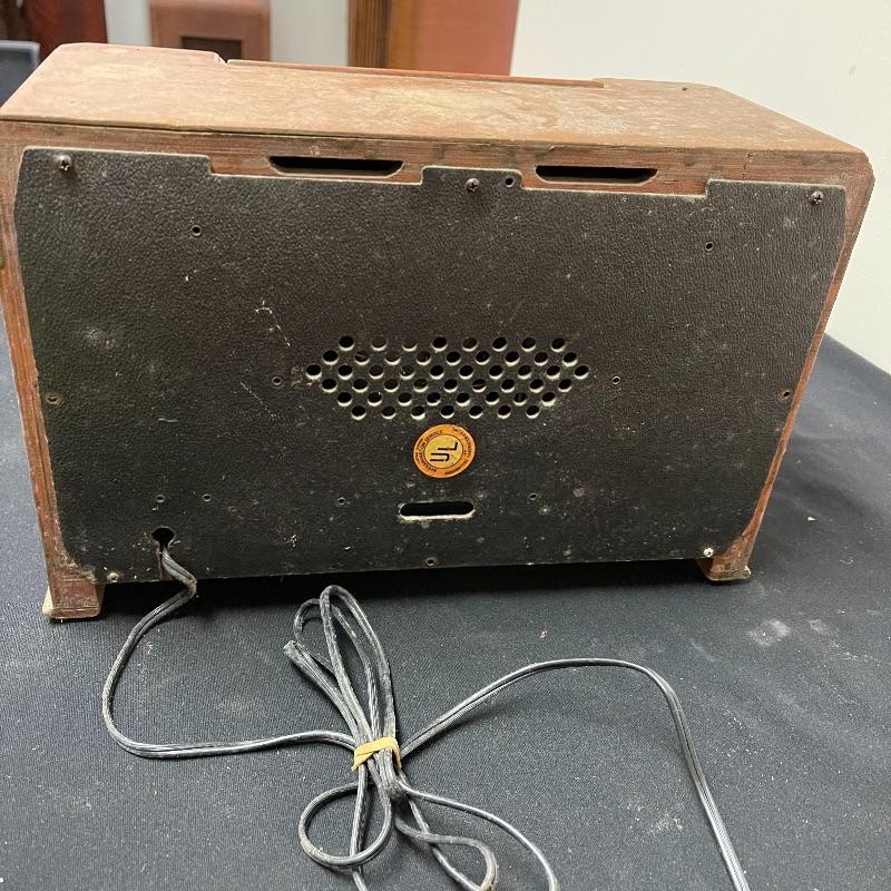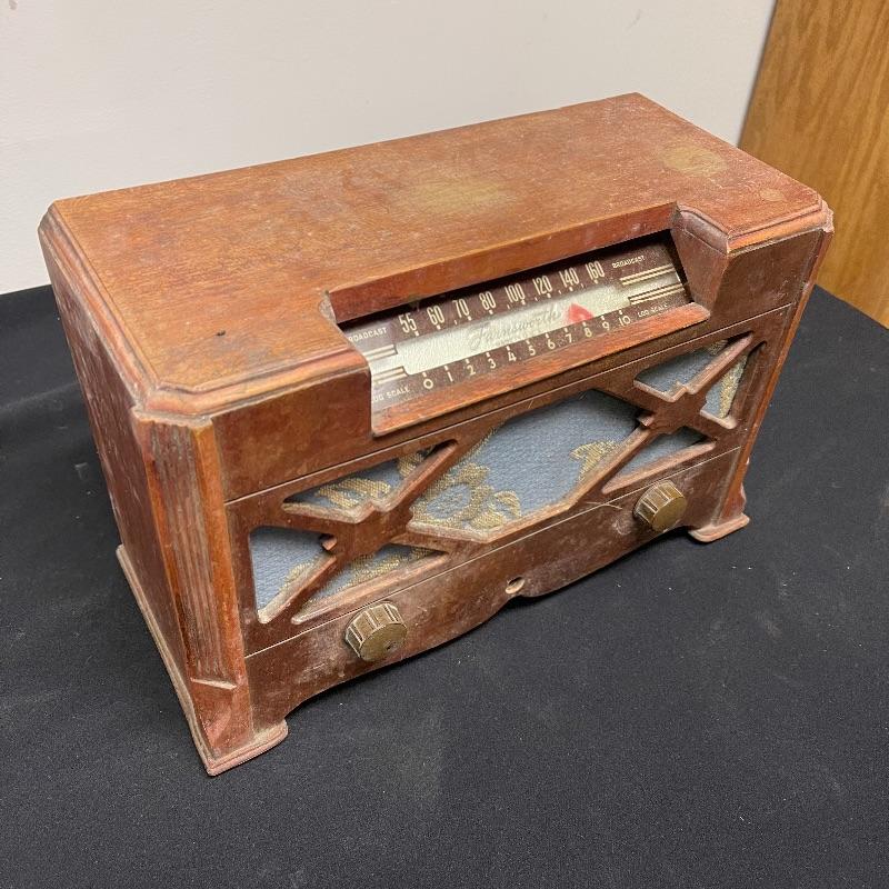 Vintage Farnsworth Radios. The first is a model ET-066 and it does not have a power cord. The second is model ET-067 and when plugged in, it powered on. The third is also an ET-066 model but a lighted color wood and different patterned fabric than the first radio. This one also powered on when plugged in and made a humming noise.