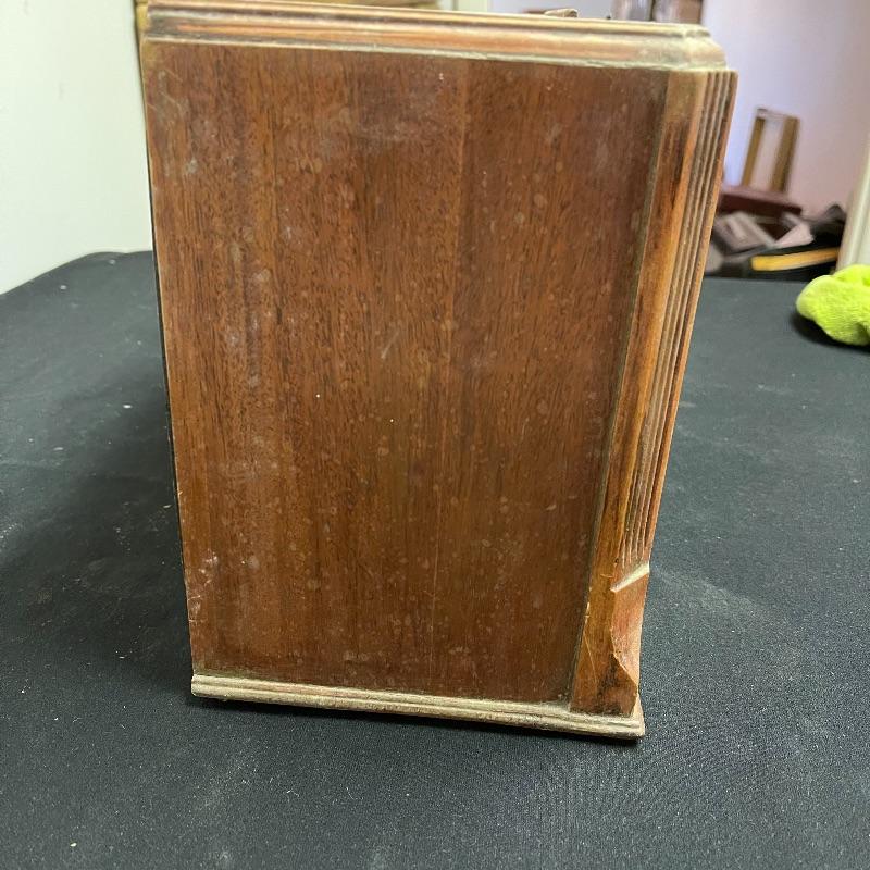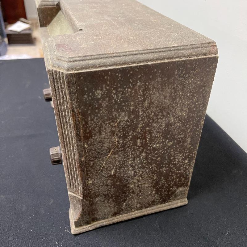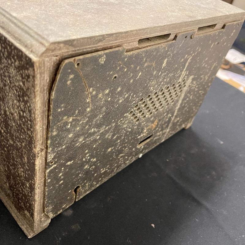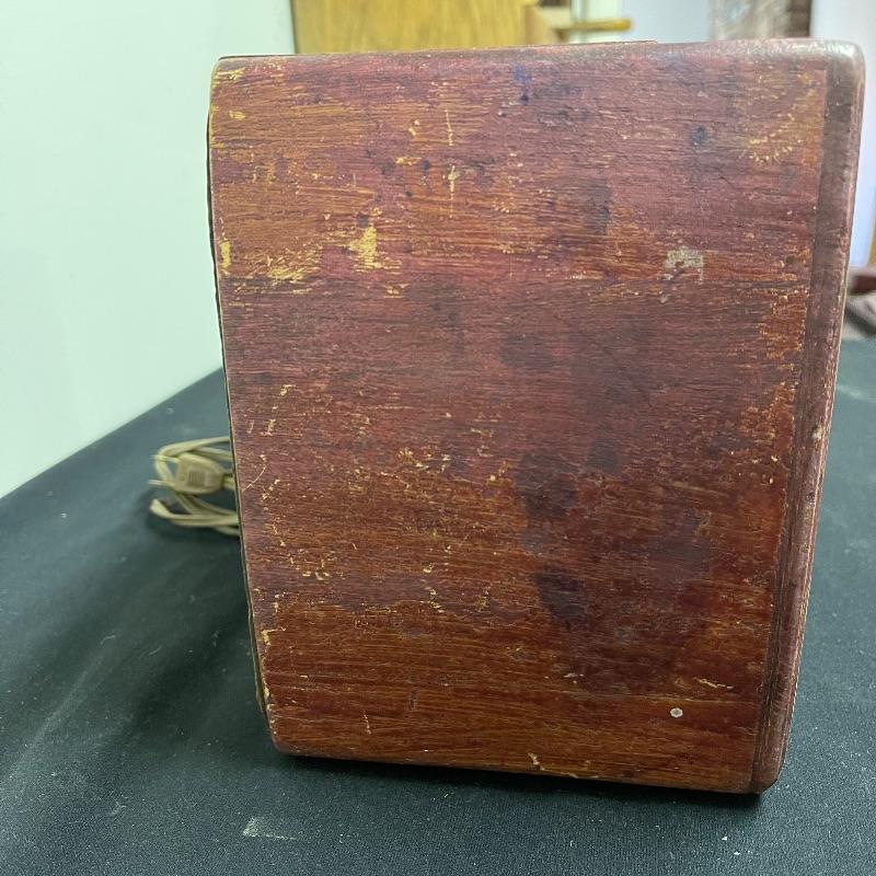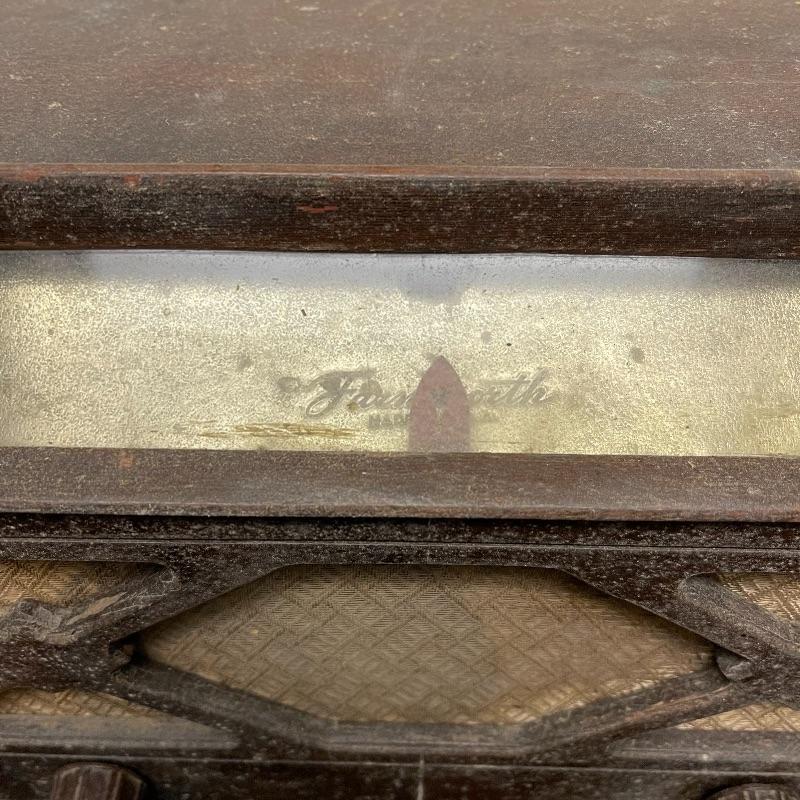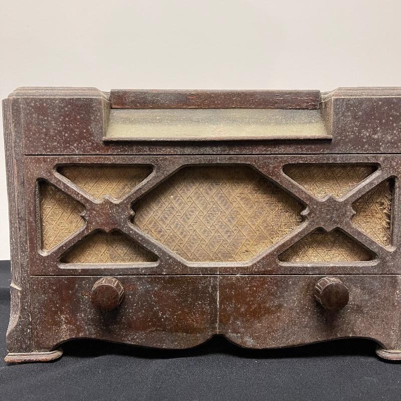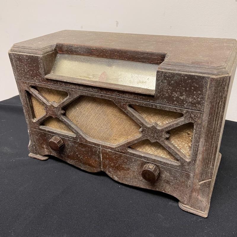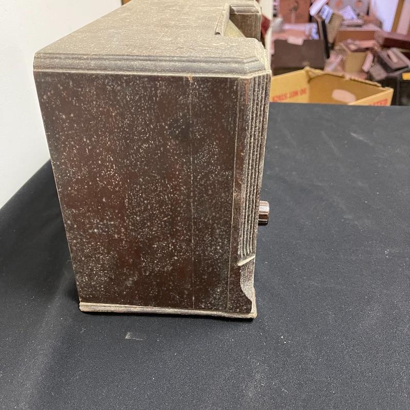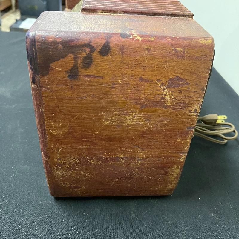 Vintage Farnsworth Radios. The first is a model ET-066 and it does not have a power cord. The second is model ET-067 and when plugged in, it powered on. The third is also an ET-066 model but a lighted color wood and different patterned fabric than the first radio. This one also powered on when plugged in and made a humming noise.