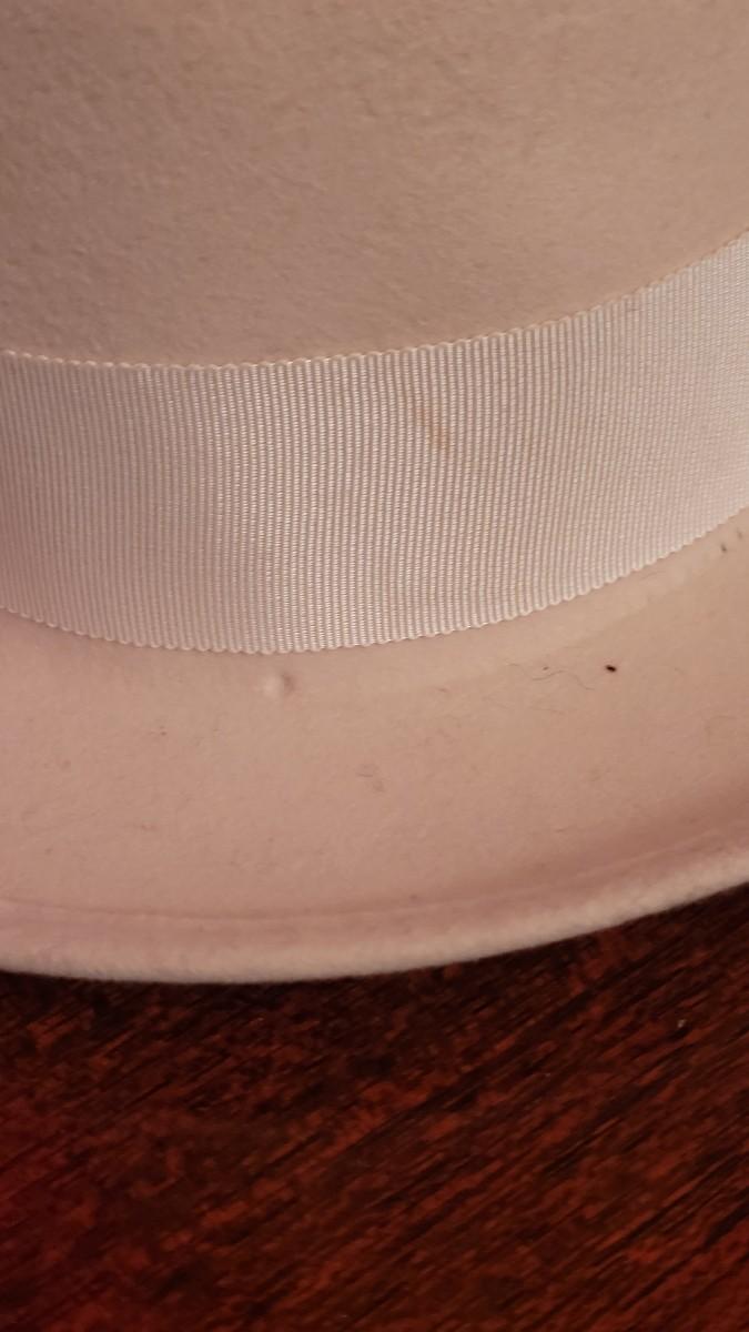 Cream hat has at least one spot with damage/aging, the spot is shown in one of the photos.