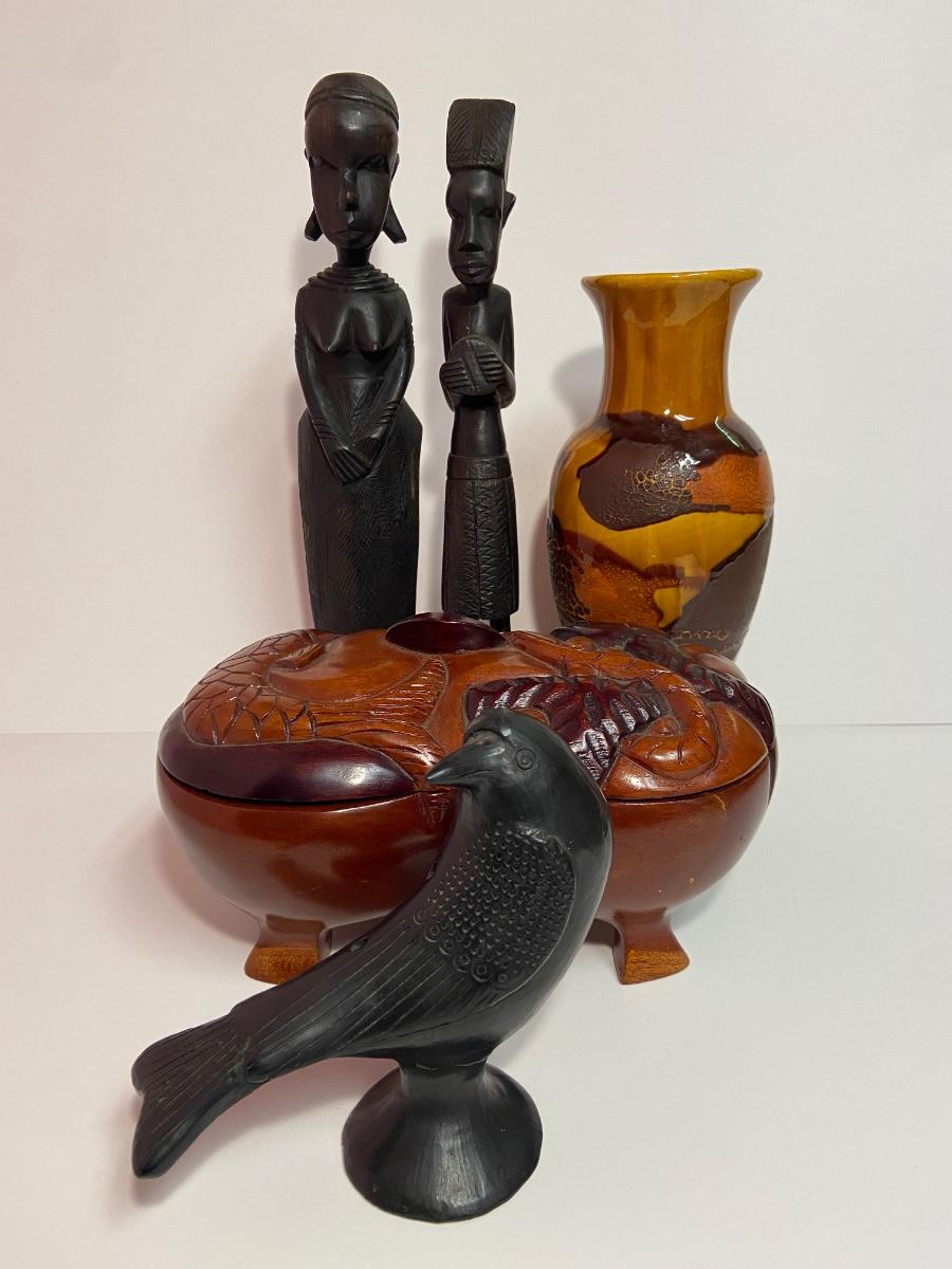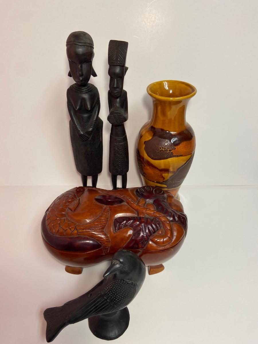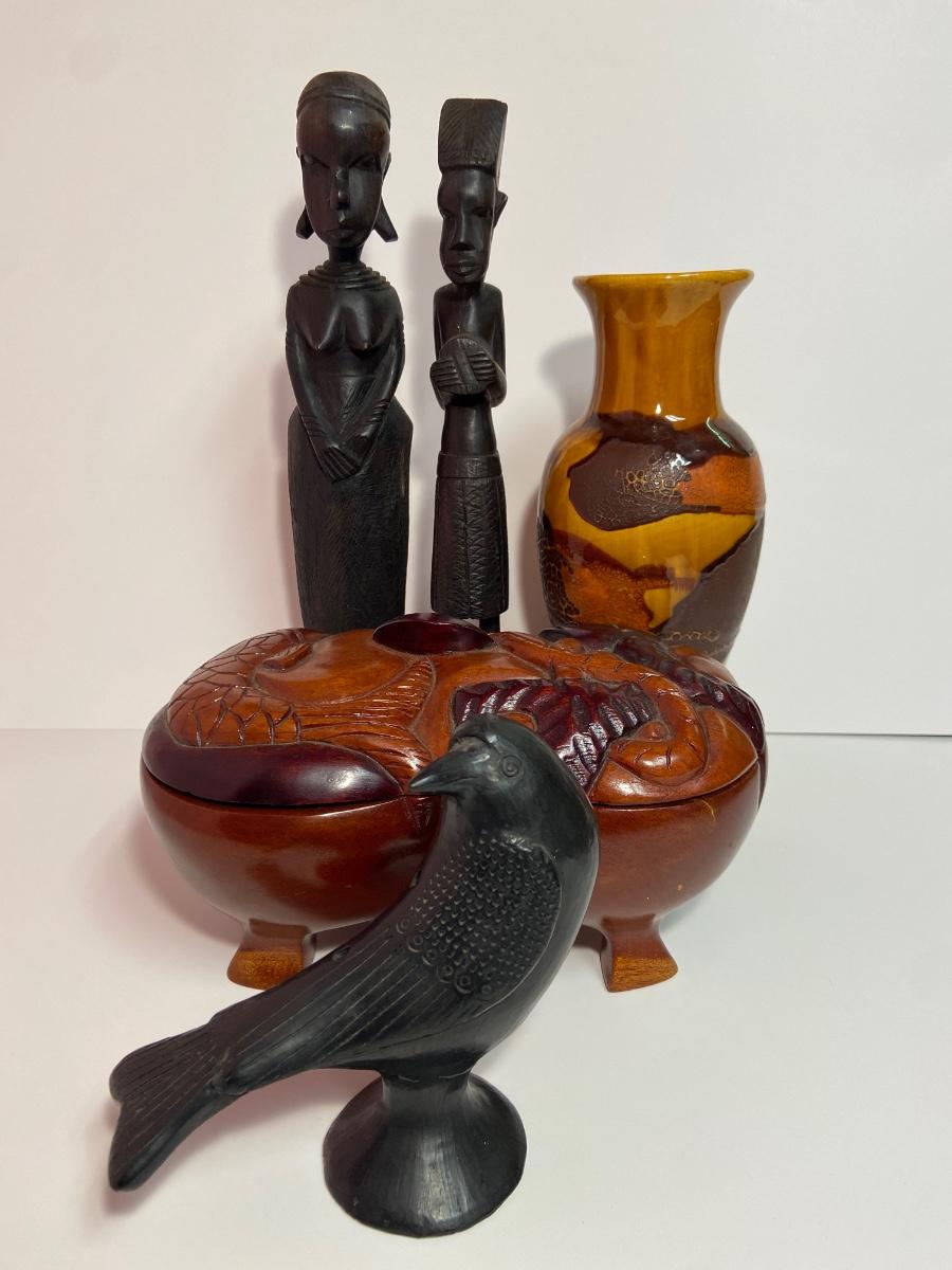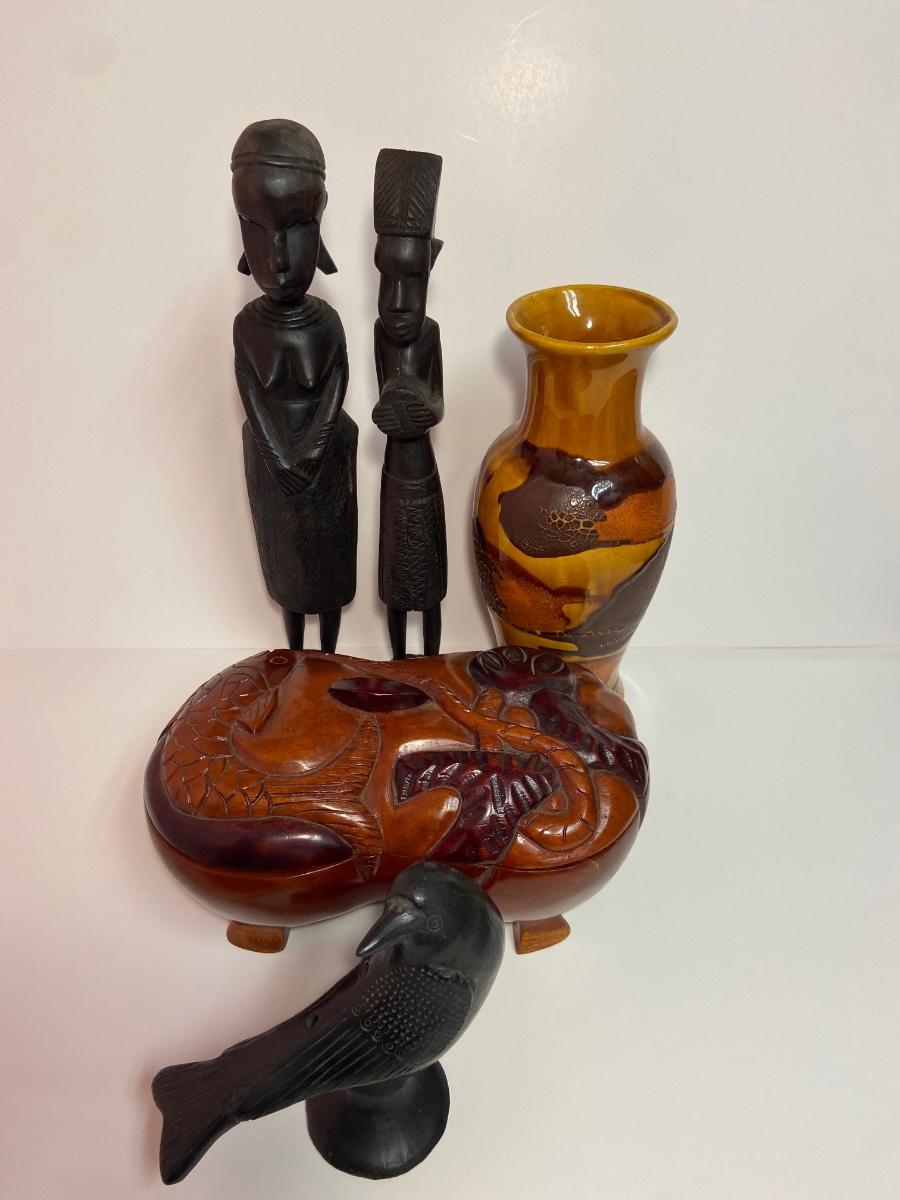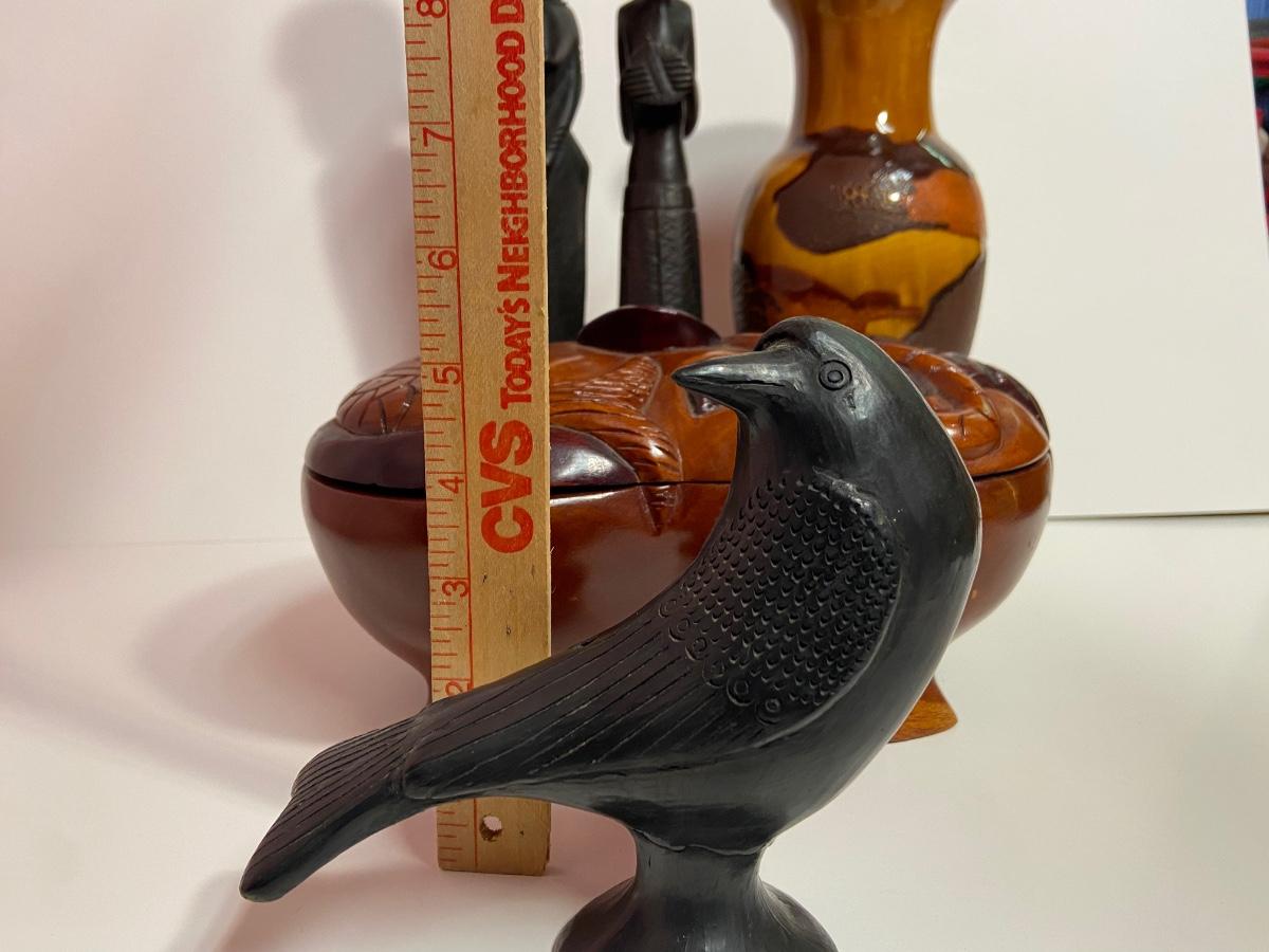 VTG Tanganyika Statues, Hand Carved, Tanzania Wood, Vintage Royal Haeger Pottery Earth Wrap Vase,Oaxaca Mexican Black Clay Pottery Bird and a Carved lidded bowl