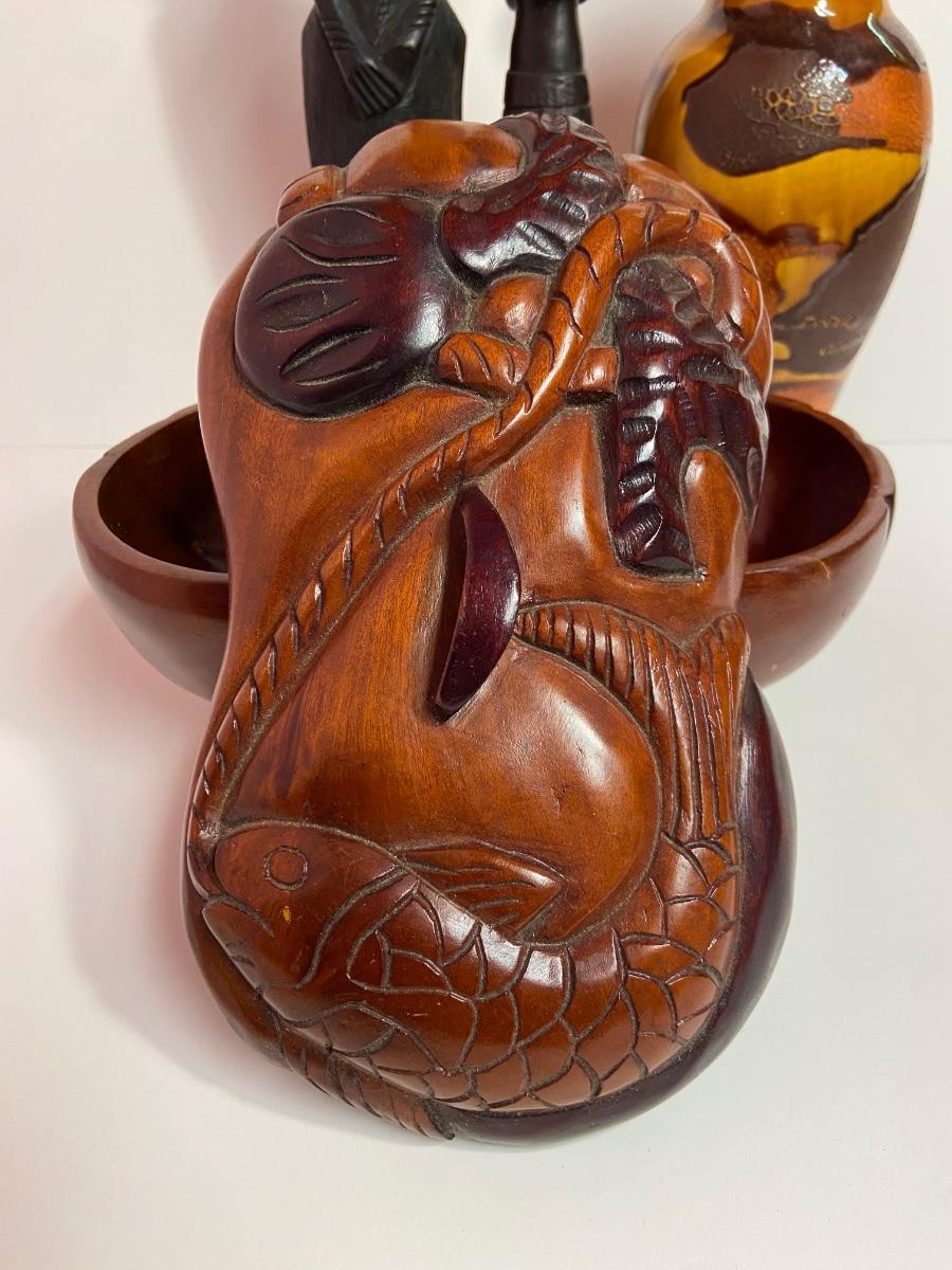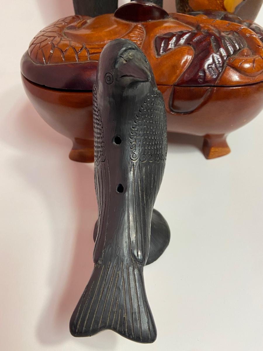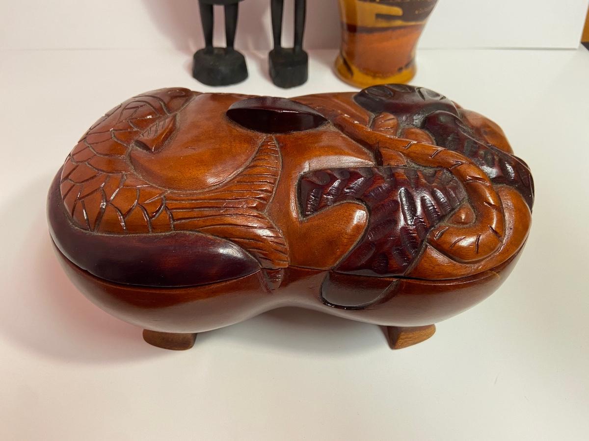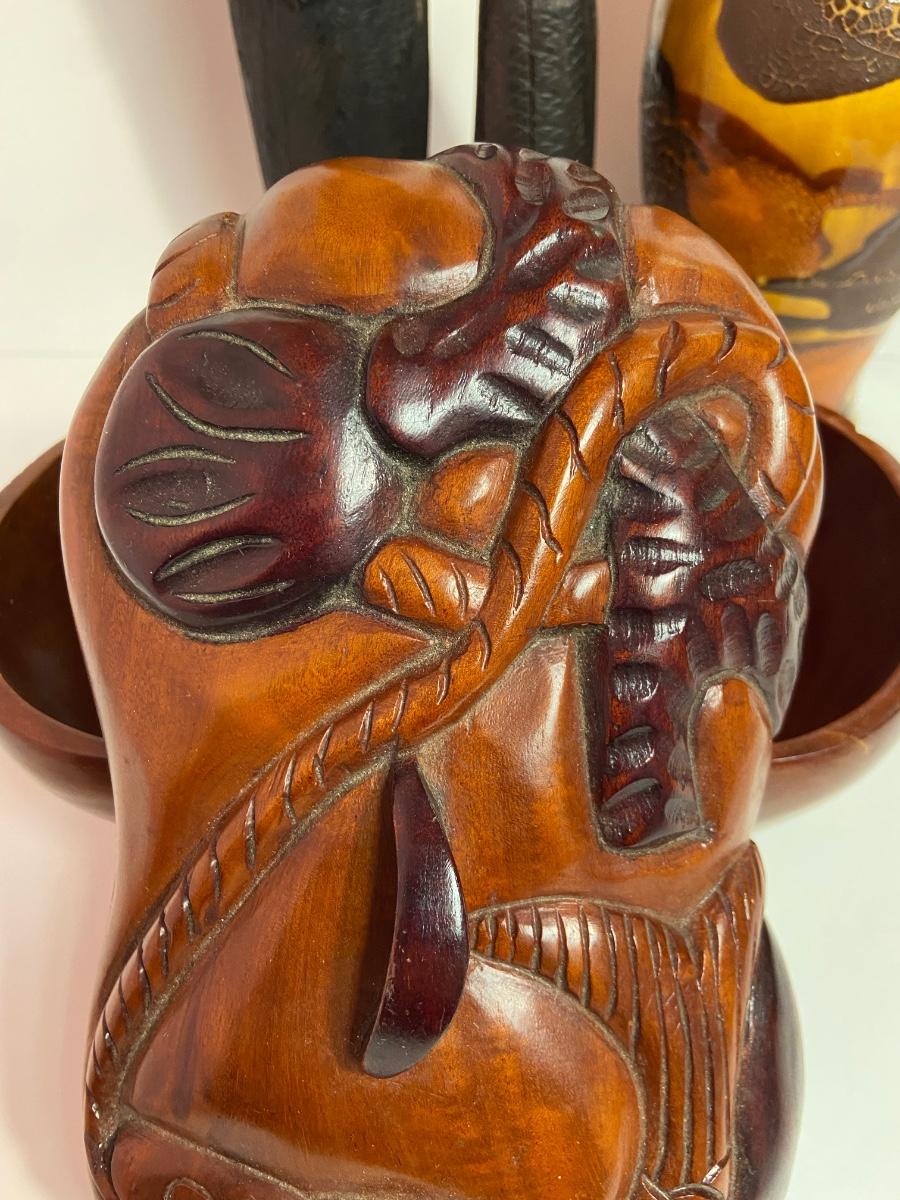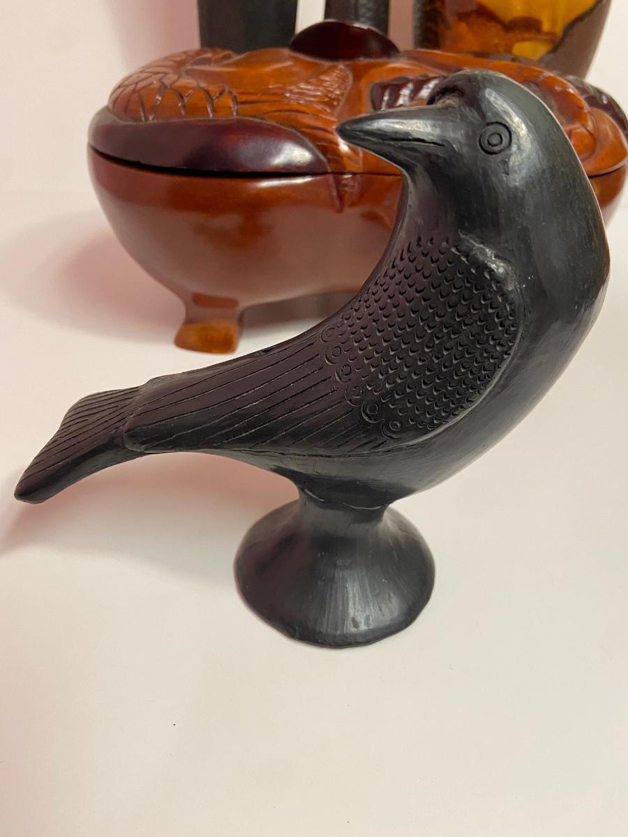 VTG Tanganyika Statues, Hand Carved, Tanzania Wood, Vintage Royal Haeger Pottery Earth Wrap Vase,Oaxaca Mexican Black Clay Pottery Bird and a Carved lidded bowl