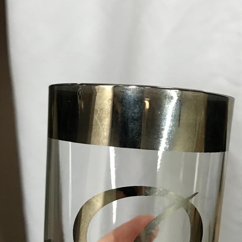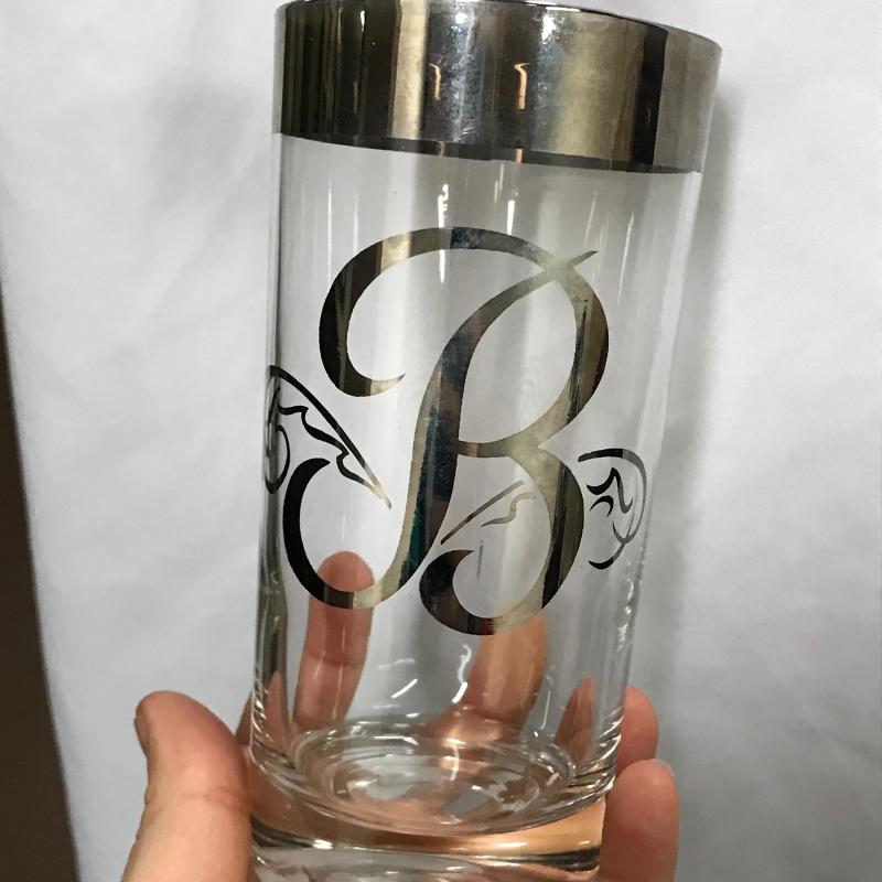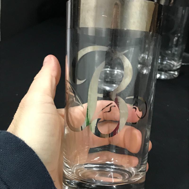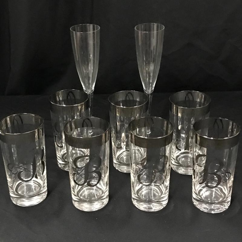Seven glasses with metallic letter “B” stand approx. 5.75” tall. Two champagne glasses stand approx. 9.25” tall. Shipping available or local pickup in Asheville, NC.