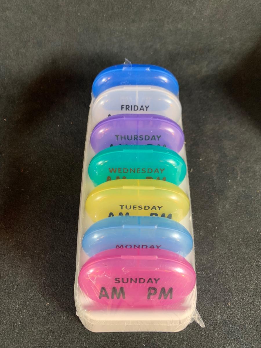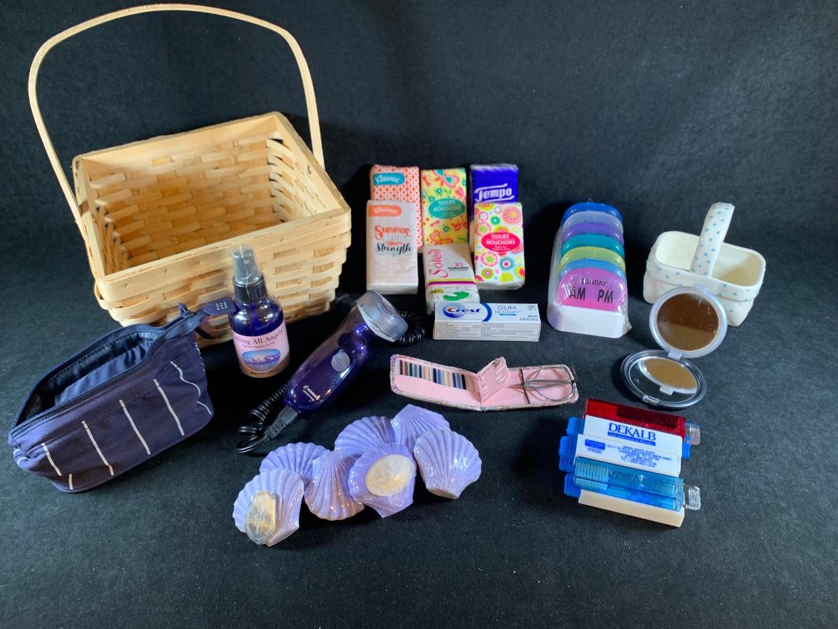 Phillips Norelco Reflex Plus Razor, Pill organizer set, travel sewing kit, travel tissue packs, room spray, and assorted soaps