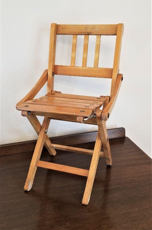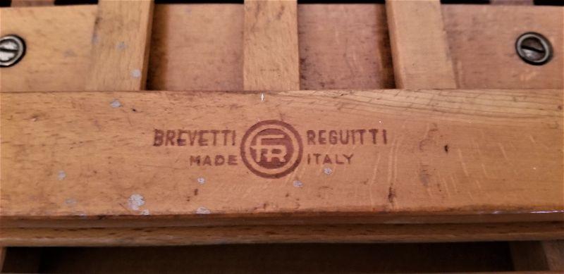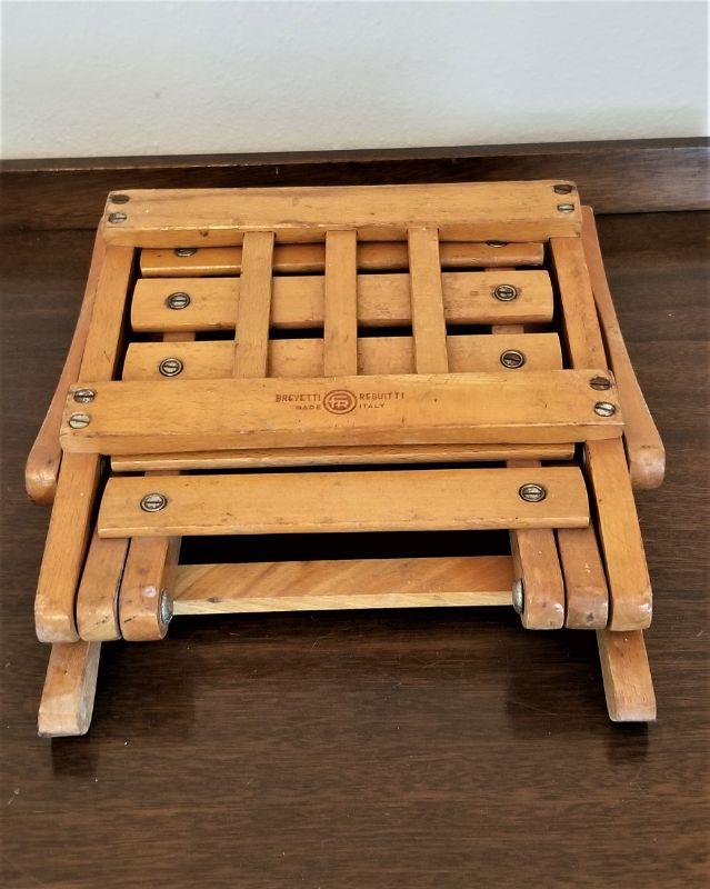 I did a little search for these on-line and my eyes bugged out when I saw the results. MidCentury modern Italian child's folding chair by Italian designer Brevetti Reguitti. Good vintage condition - stands 17.5" tall, 9" across. Folds up as shown - clearly marked on reverse. Apparently this is an iconic representation of Italian Mid-Century modern.