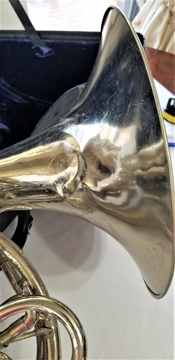 Frank Holton & Co. Professional Double H-179 French horn in case. Key action good, no mouthpiece. NOTE: Dent in the "neck" of the instrument, right underneath the opening of the horn - horn made of nickel silver. We can't test it - could be good, could be a wall hanger. These instruments can sell for thousands of dollars in good condition.