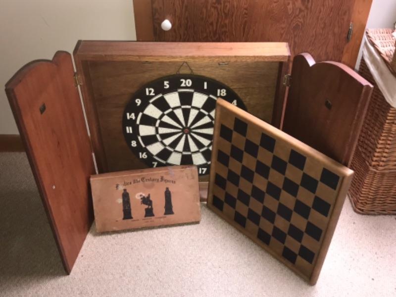 Checker board made of wood, Replica 11th Century Chess Set (plastic) , Dart Board 28” tall, 2” wide and 4” deep