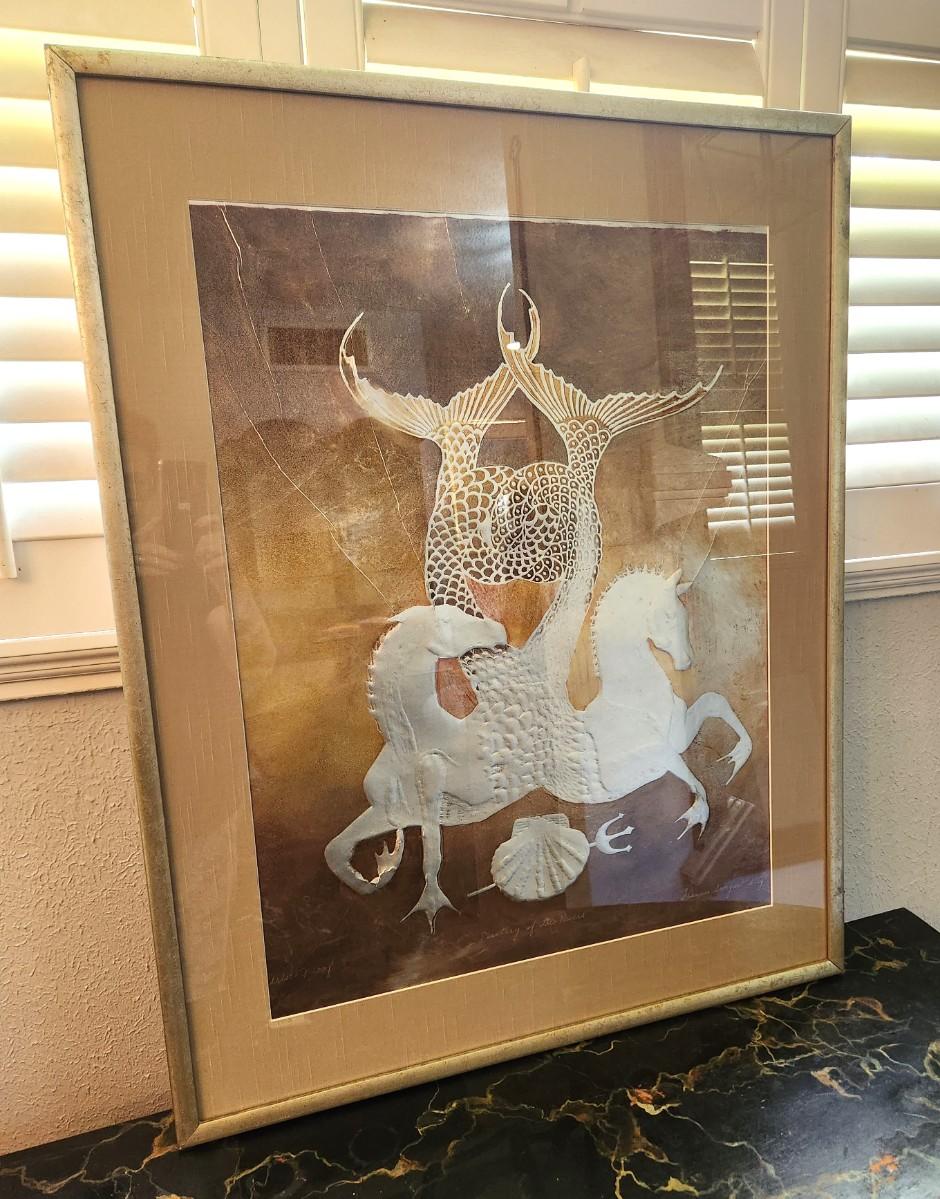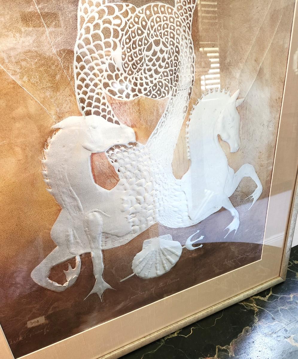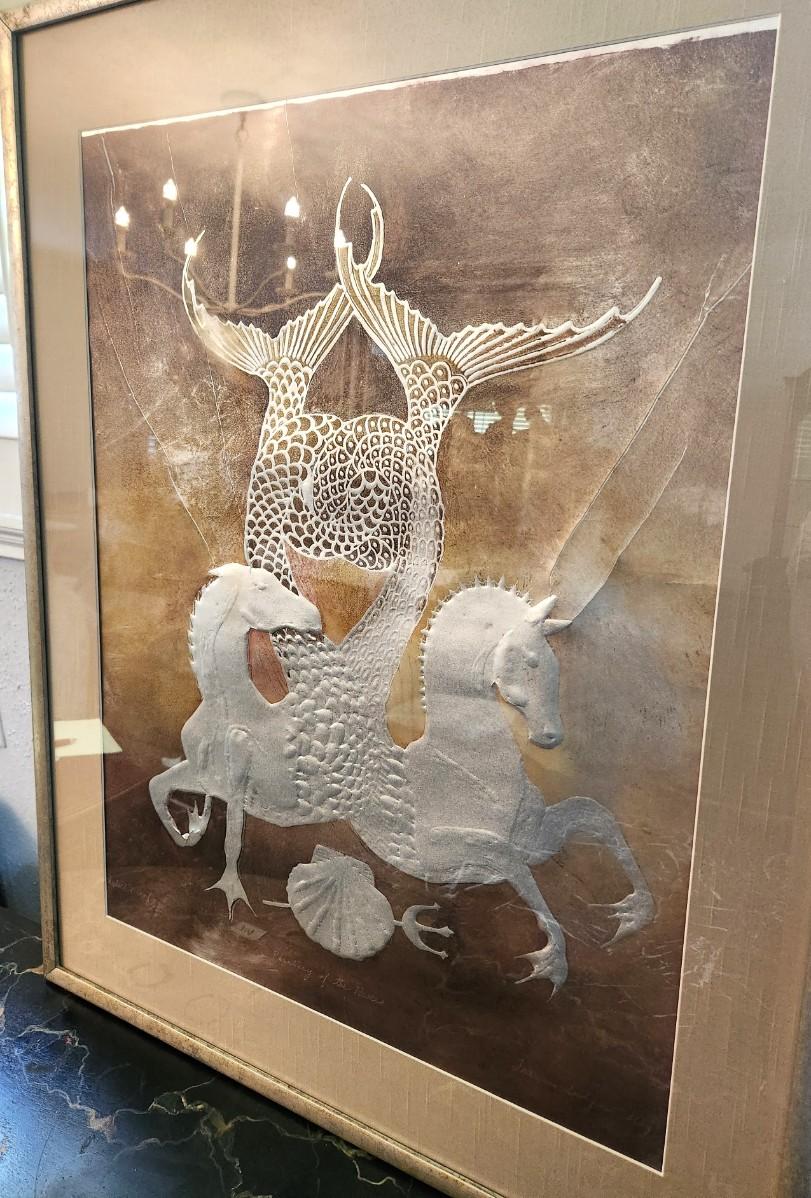 This large art piece is an Artist's Proof and was created by Listed Artist Frances Swigart-Steg (b. 1942). She obtained a BFA in Fine Arts from Newcomb College and currently has an atelier on Royal Street. Her works have been auctioned by Neal Auction Company, fetching prices in the $500 range. This piece is entitled "Phantasy of the Rivers" and is signed. The paperwork is missing from the envelope on the back. Framed and matted. Good condition.