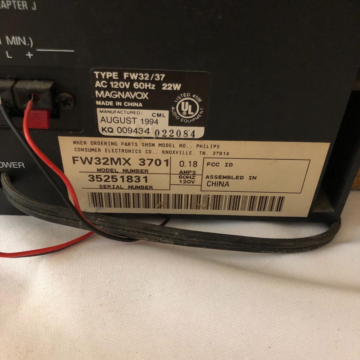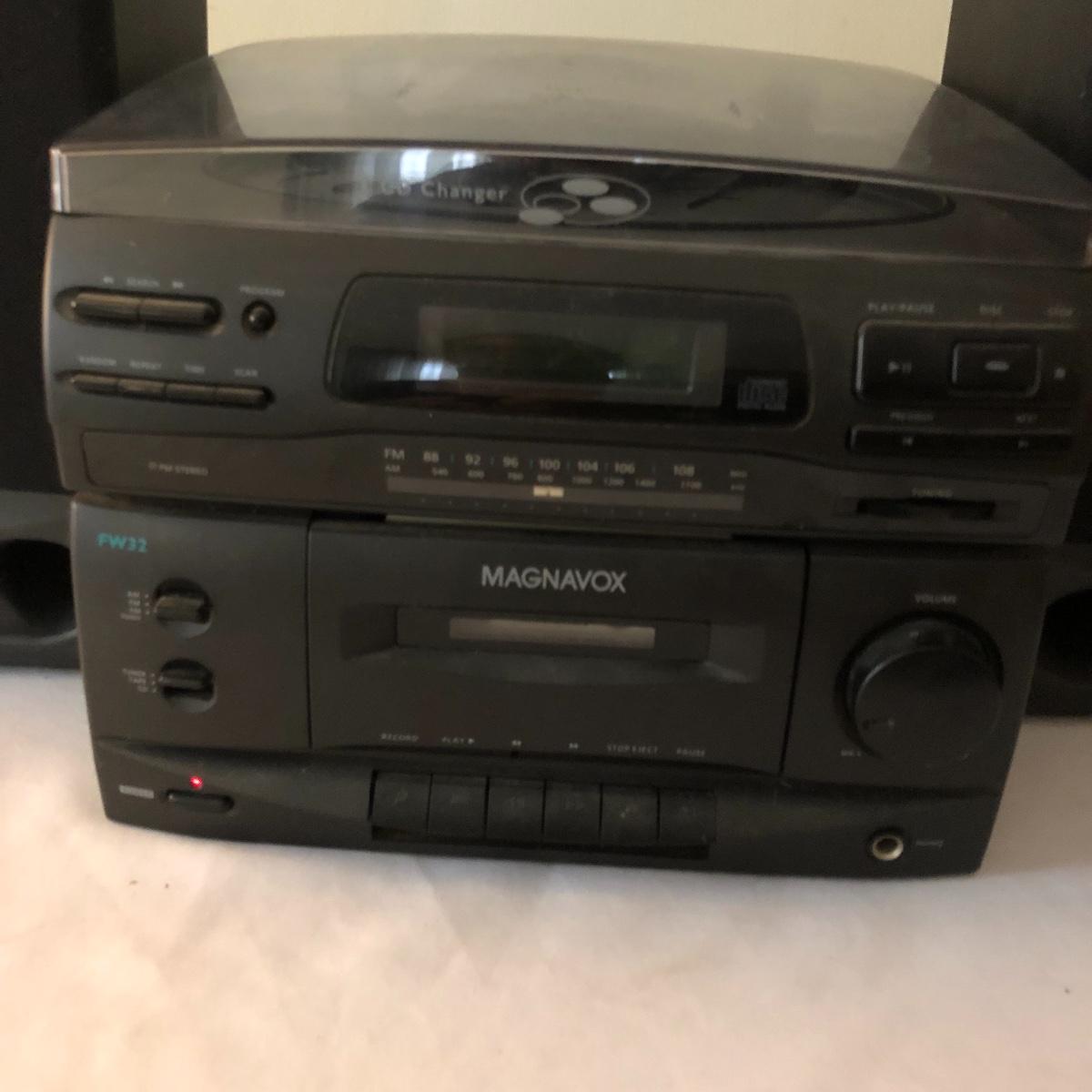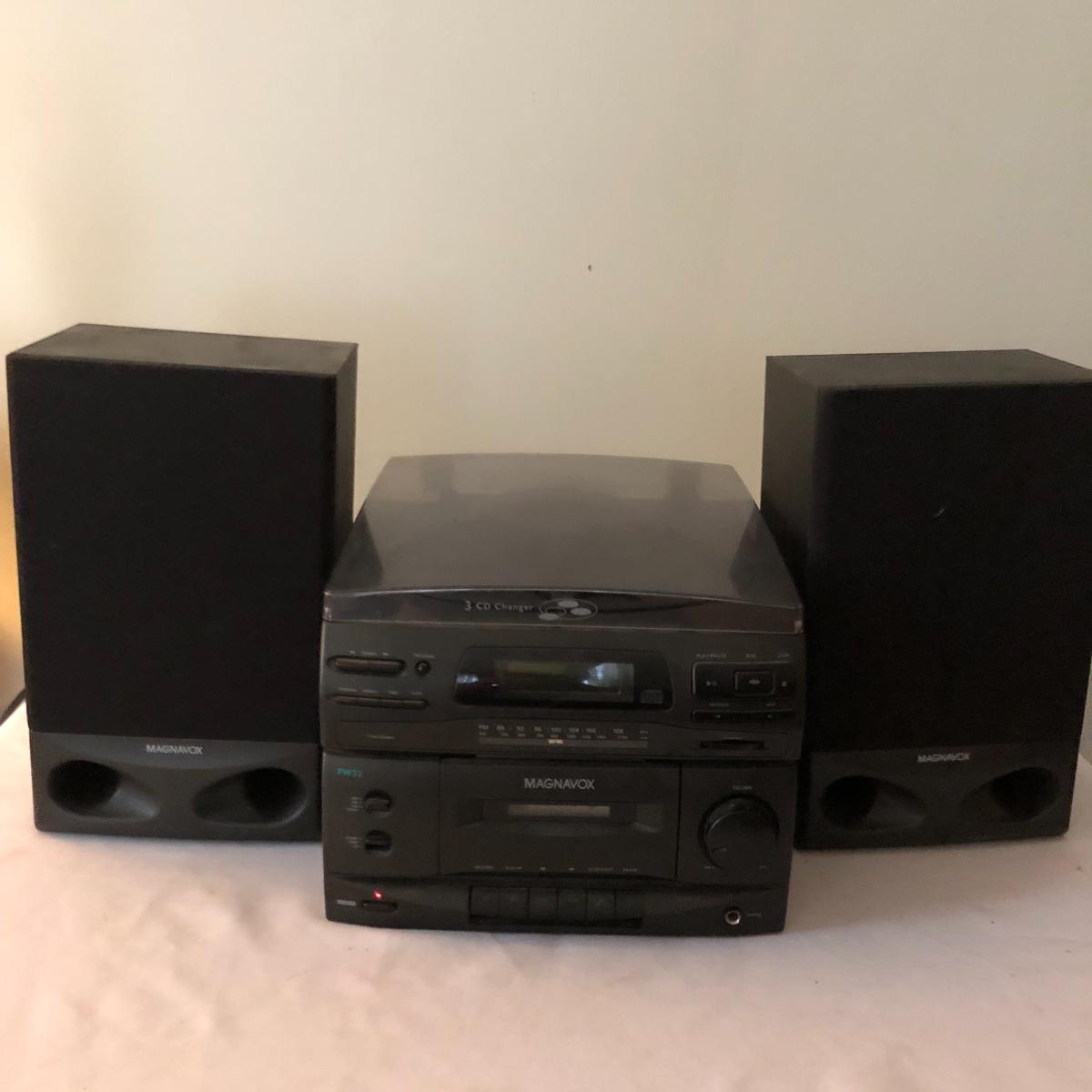 Get your groove on with this Magnavox model# FW32 three CD changer, cassette player with AM/FM radio and two speakers. Radio worked when tested, as well as tape deck and CD player. Stereo measures 11” x 12” x 9” without speakers.