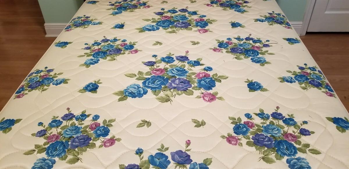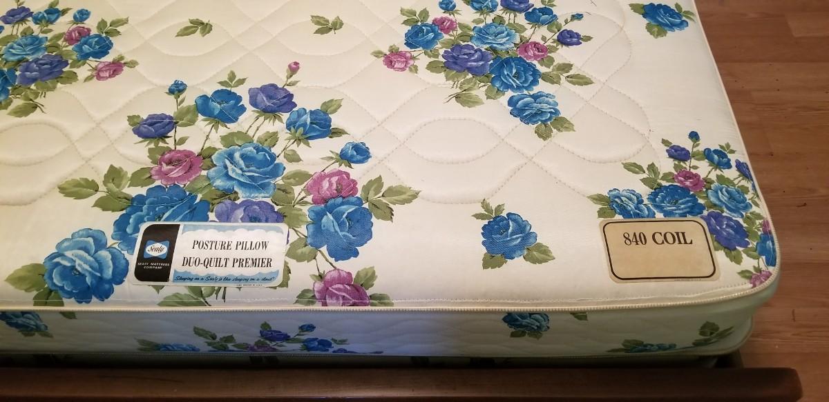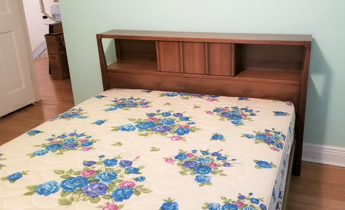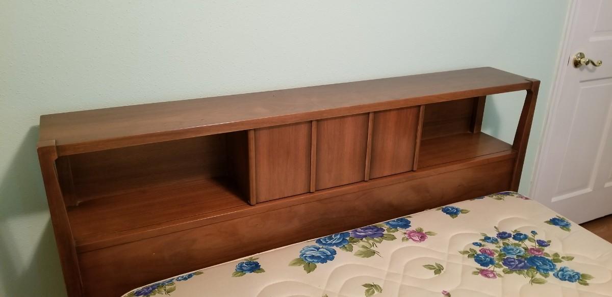 Full/Double bed by well known Mid Century furniture maker American of Martinsville - Sealy mattress. Headboard 9" deep, 59" across, 36.5" tall. Good vintage condition. The matching dresser and chest of drawers are in earlier lots. If you don't want the mattress you can leave it.