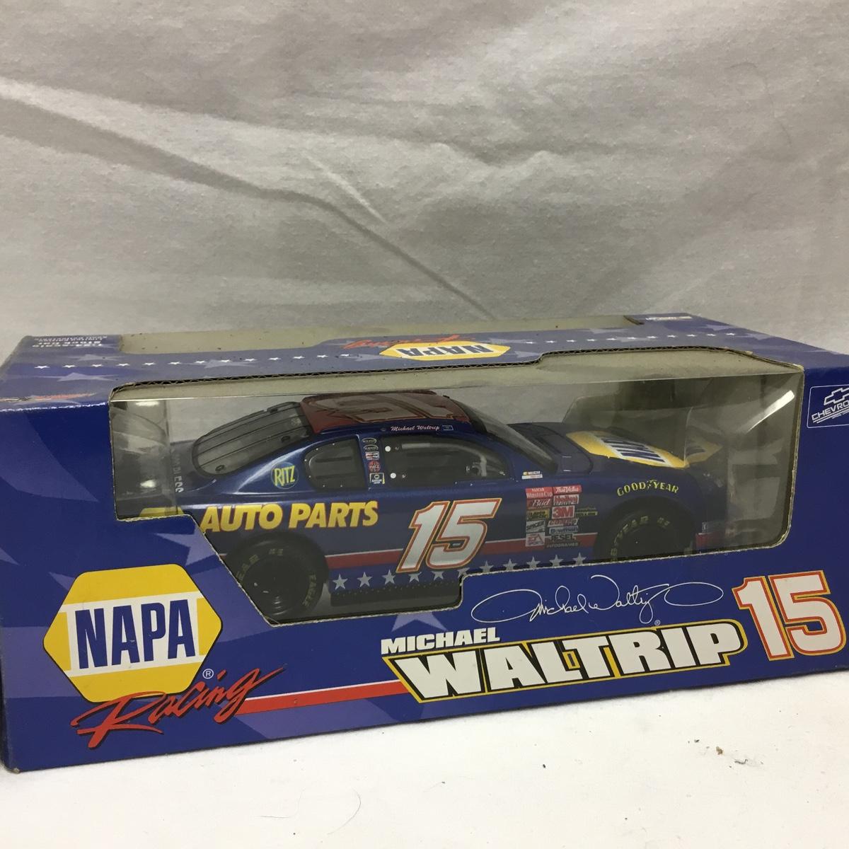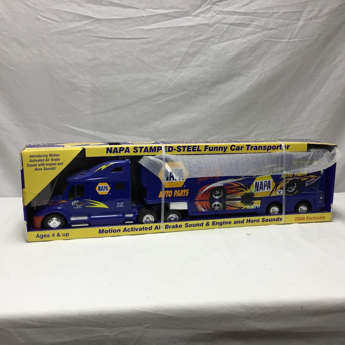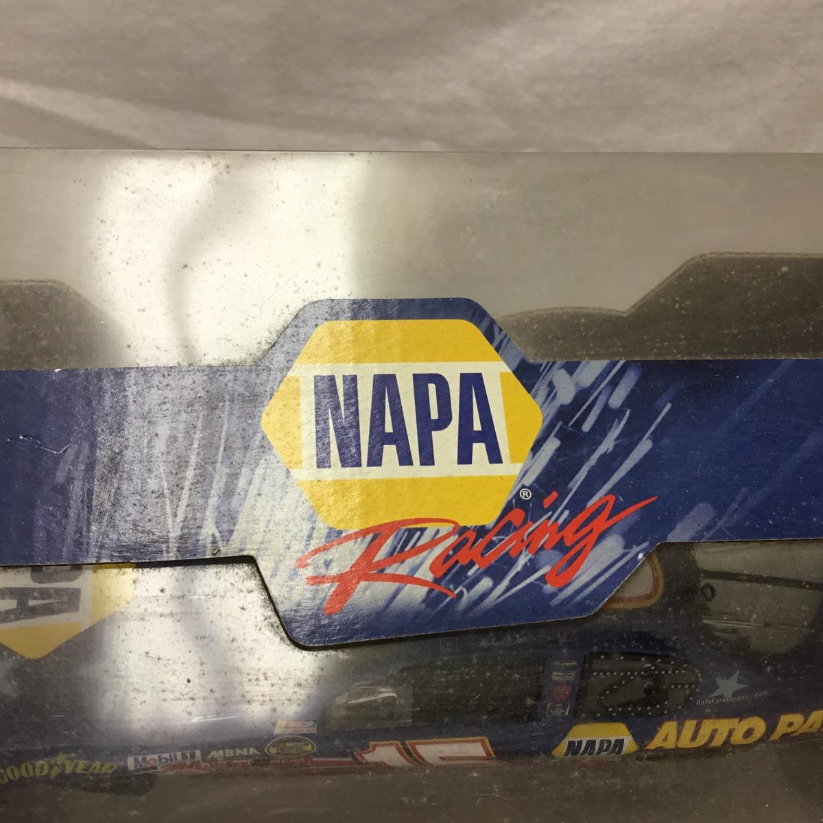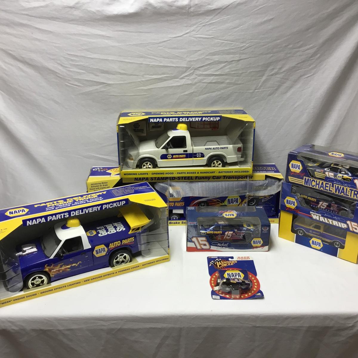 Lot includes eight packaged NAPA truck and race car figurines. Three Michael Waltrip 1:24-Scale stock car/race car included. See photos. 1967 Chevy Pickup as well as a small NASCAR Winners Circle race car included. 2005 parts delivery pick up truck, 2007 exclusive parts delivery pick up truck that is blue with flames on the side, and one large 2008 exclusive NAPA stamped steel funny car transporter. See photos for details and part numbers.