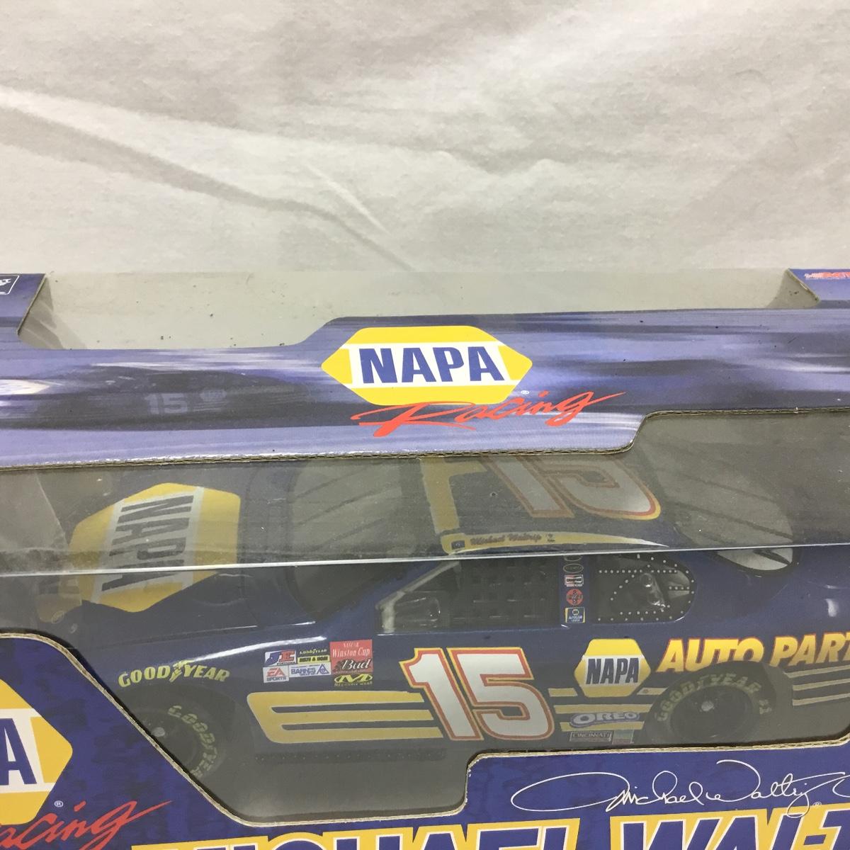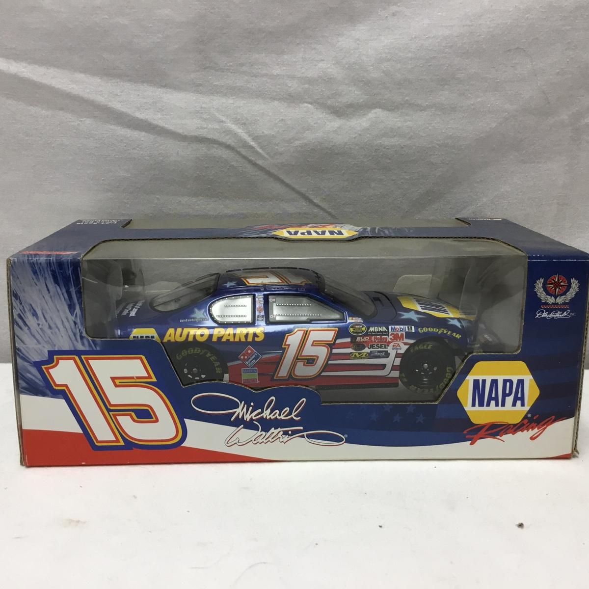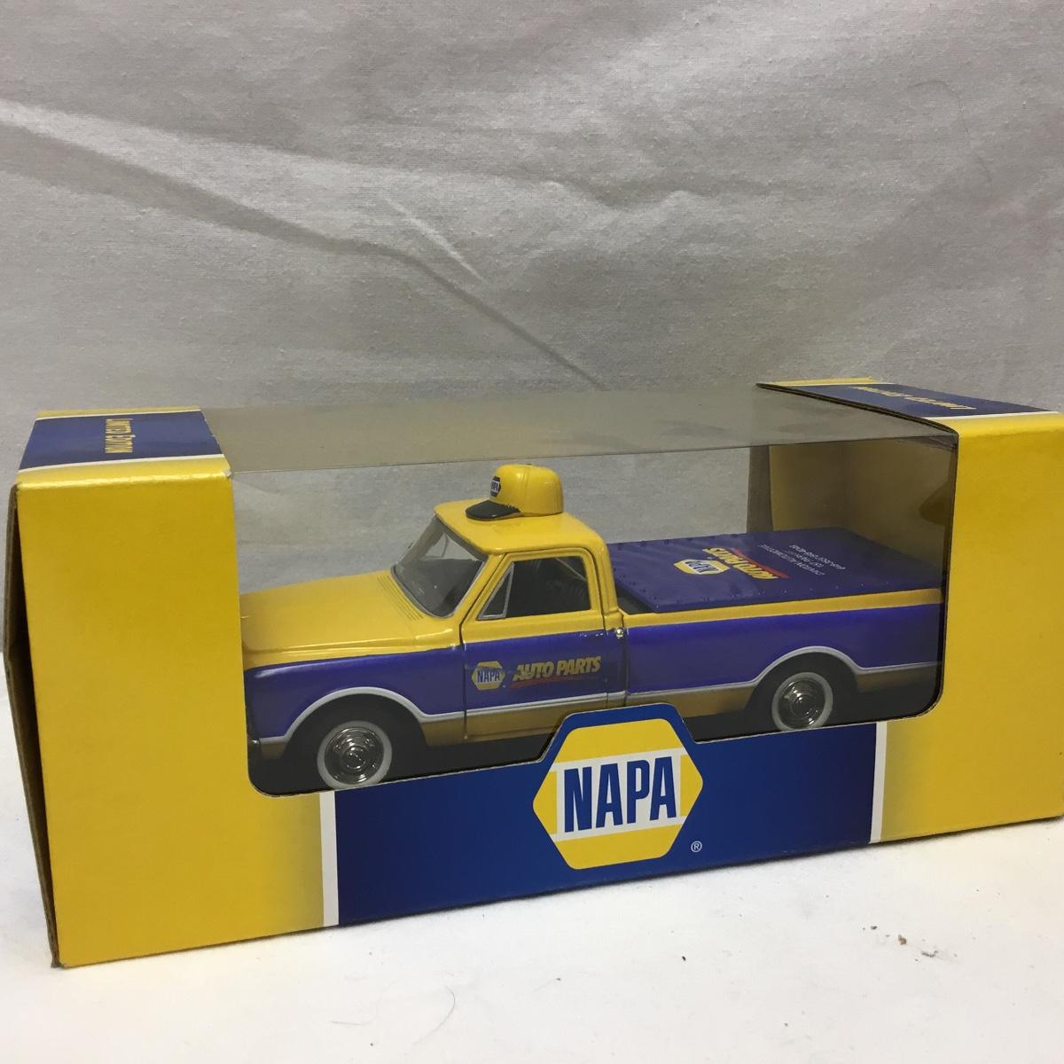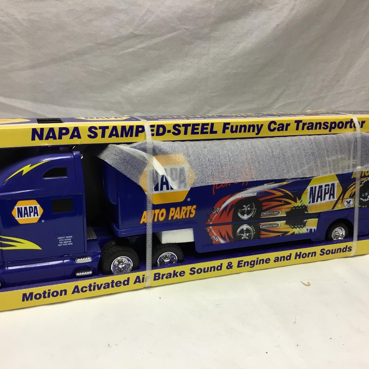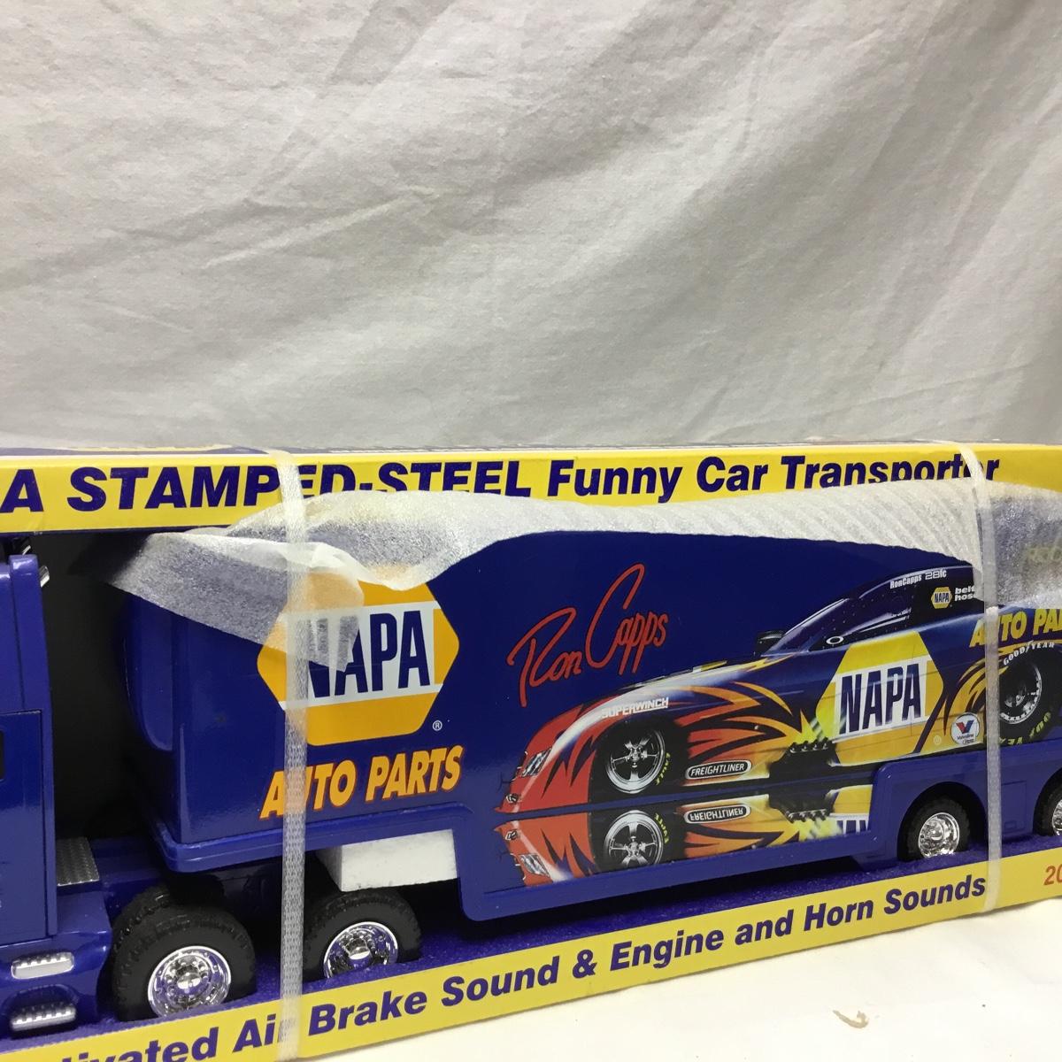 Lot includes eight packaged NAPA truck and race car figurines. Three Michael Waltrip 1:24-Scale stock car/race car included. See photos. 1967 Chevy Pickup as well as a small NASCAR Winners Circle race car included. 2005 parts delivery pick up truck, 2007 exclusive parts delivery pick up truck that is blue with flames on the side, and one large 2008 exclusive NAPA stamped steel funny car transporter. See photos for details and part numbers.