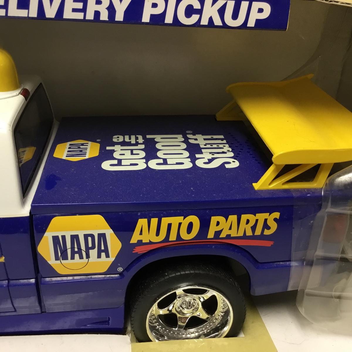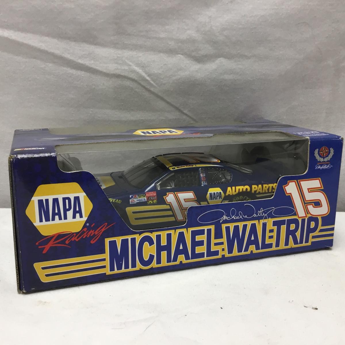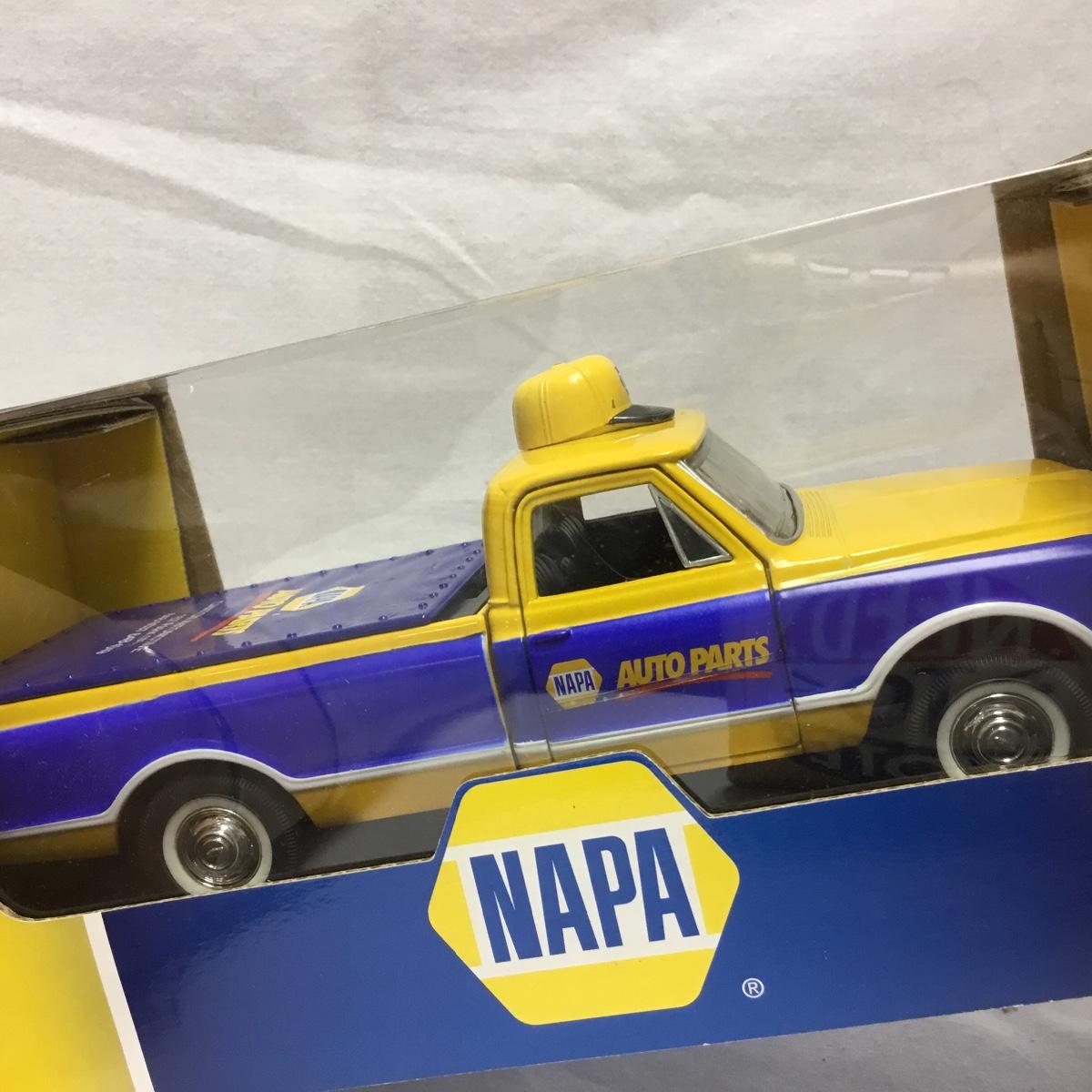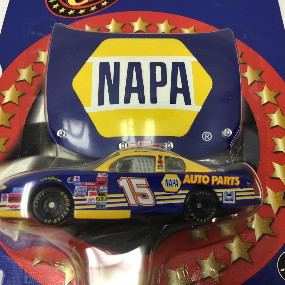 Lot includes eight packaged NAPA truck and race car figurines. Three Michael Waltrip 1:24-Scale stock car/race car included. See photos. 1967 Chevy Pickup as well as a small NASCAR Winners Circle race car included. 2005 parts delivery pick up truck, 2007 exclusive parts delivery pick up truck that is blue with flames on the side, and one large 2008 exclusive NAPA stamped steel funny car transporter. See photos for details and part numbers.