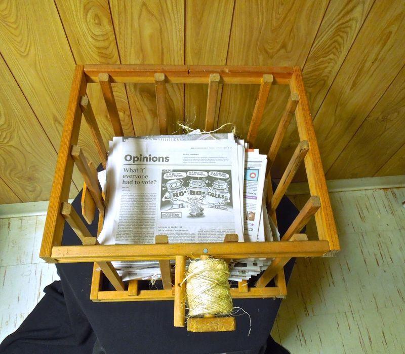 100% wood slat sturdy crate for stacking newspapers and binding them in bundles with twine dispenser attachement. Dimensions are 15" h x 16" d x 18" w.